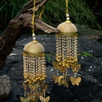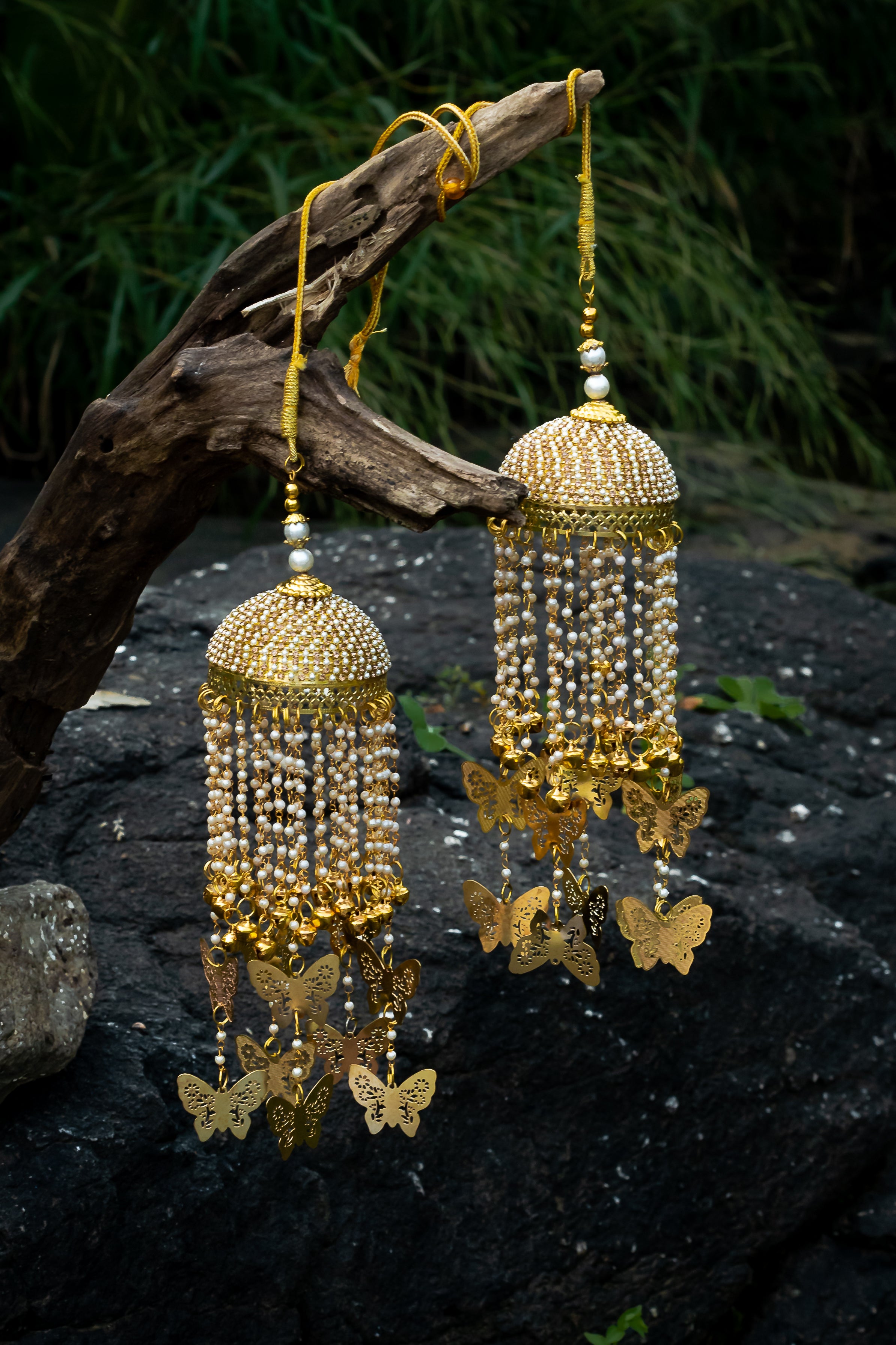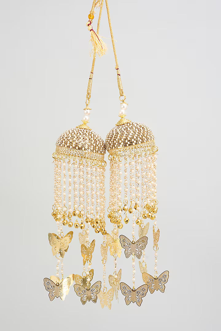Elegant golden kaleeras adorned with delicate butterfly motifs and cascading pearl strings. Perfect for weddings, these traditional yet contemporary accessories add charm and grace to bridal attire.