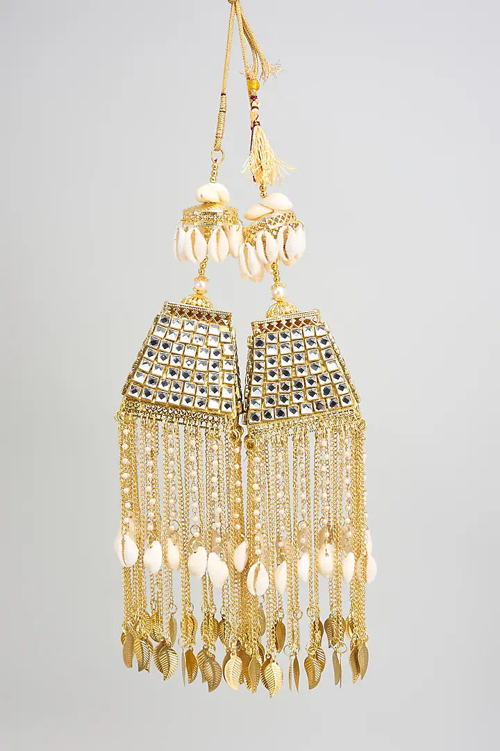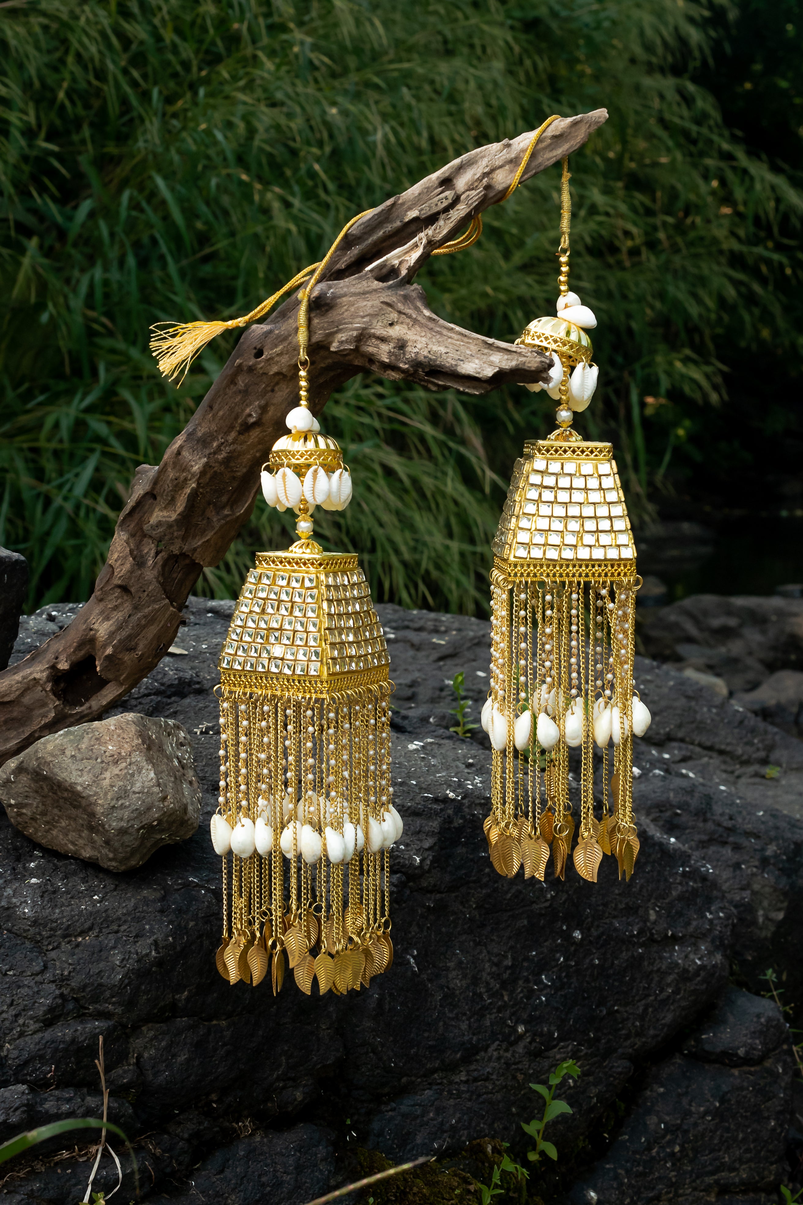 A stunning pair of gold-plated kaleeras featuring intricate lattice patterns, pearl accents, and cascading tassels. Perfect for weddings, these elegant accessories add charm and tradition to bridal attire.