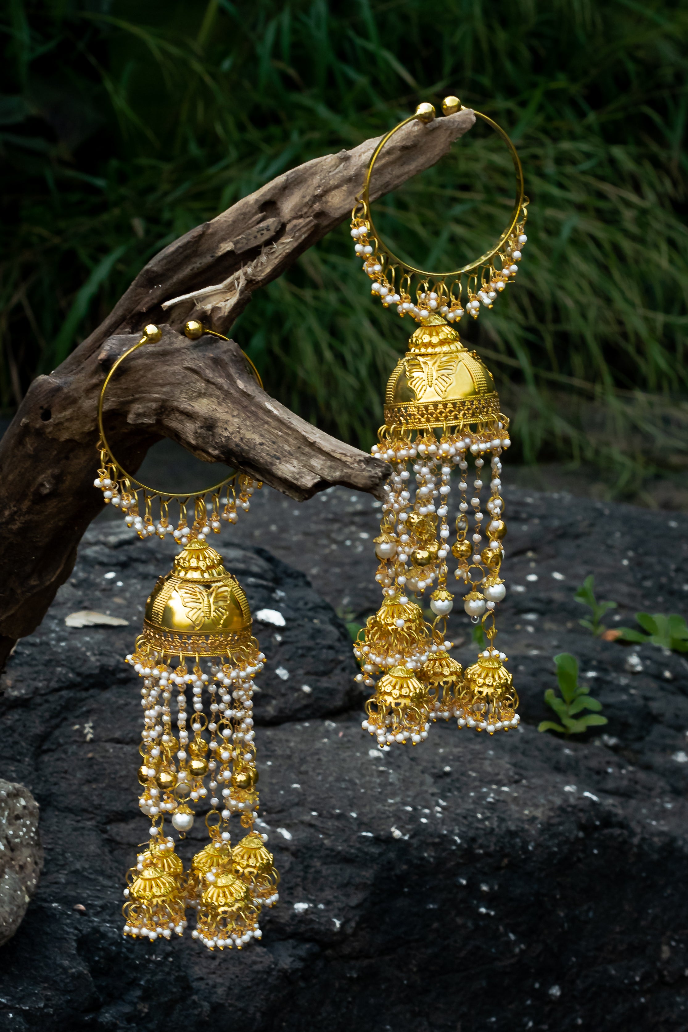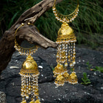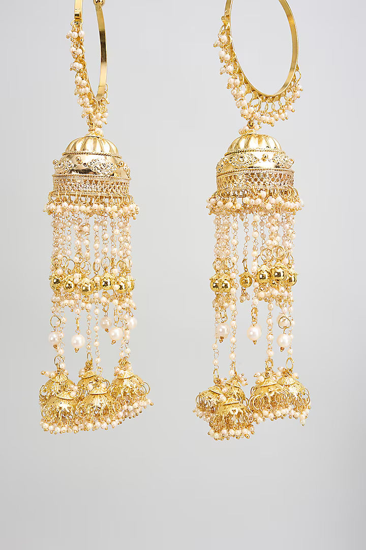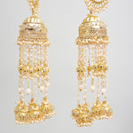 Elegant bridal kaleeras with a traditional dome design, adorned with gold-tone detailing and shimmering pearl strands. Lightweight and beautifully crafted, these kaleeras add timeless charm to wedding attire.