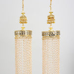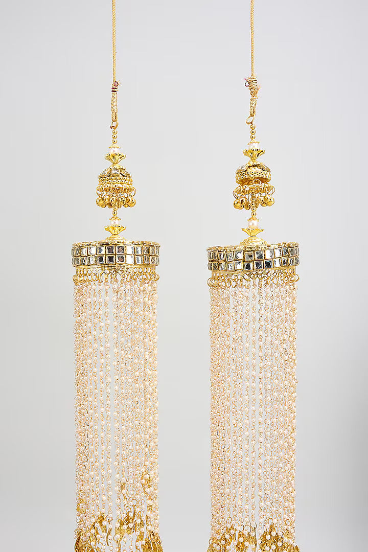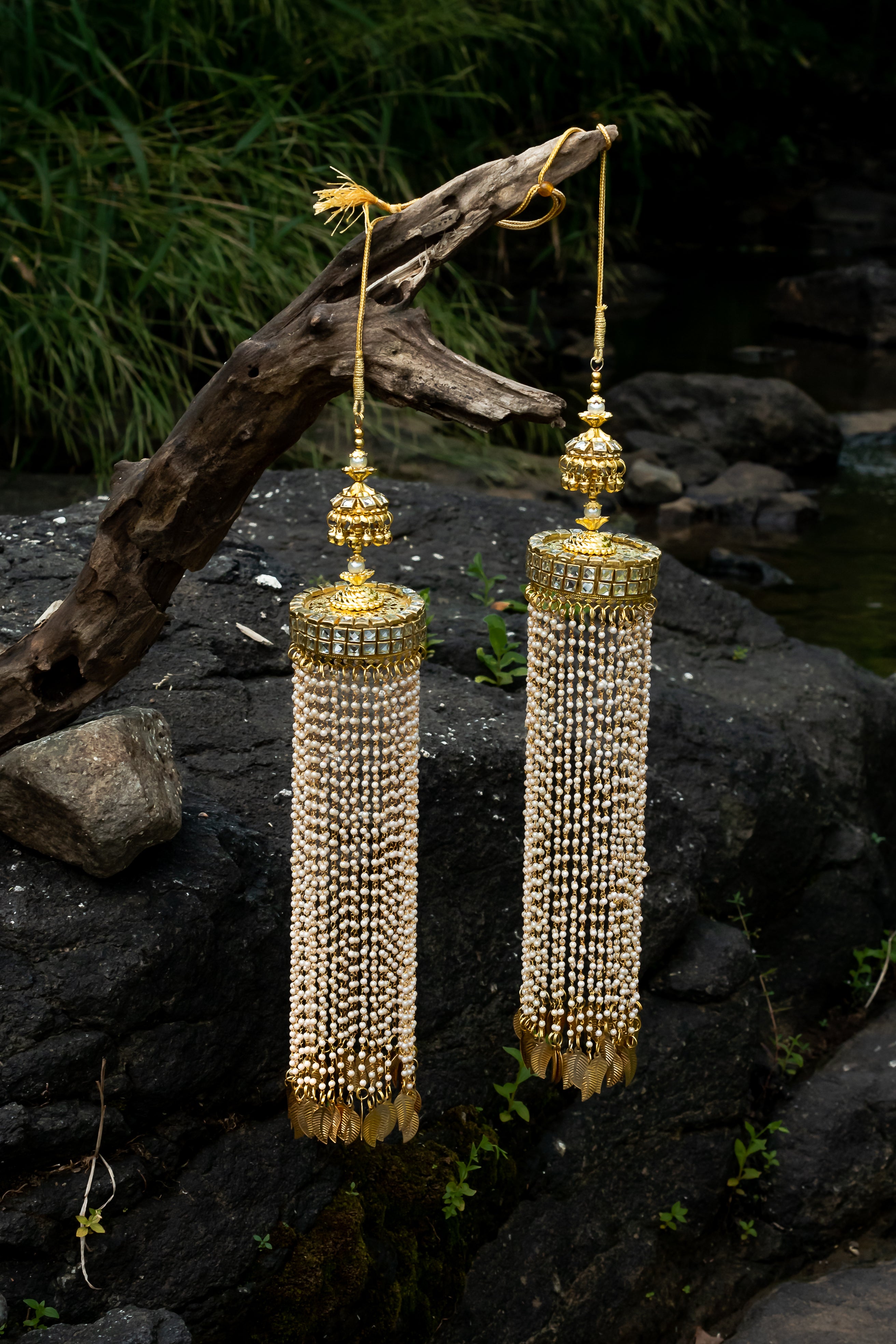 Elegant bridal kaleeras with cascading pearl strands and intricate golden designs. These long, cylindrical kaleeras add a regal touch to wedding attire, symbolizing blessings and prosperity. Perfect for traditional brides.