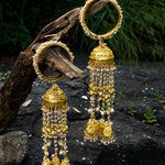 Elegant bridal kaleeras adorned with intricate golden beads and pearl strings, showcasing a traditional dome-shaped design. Perfectly crafted to complement wedding attire, adding a regal touch to bridal beauty.