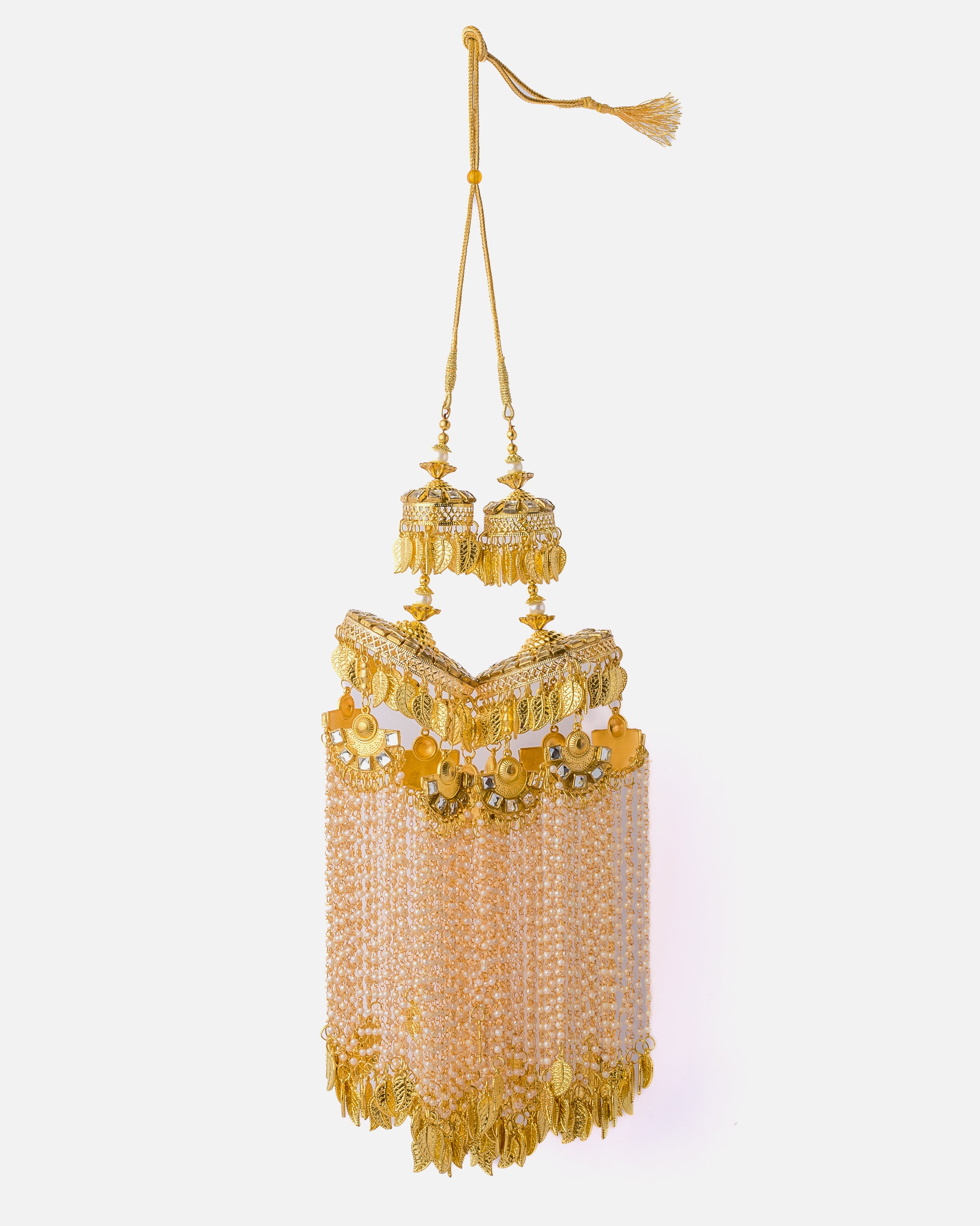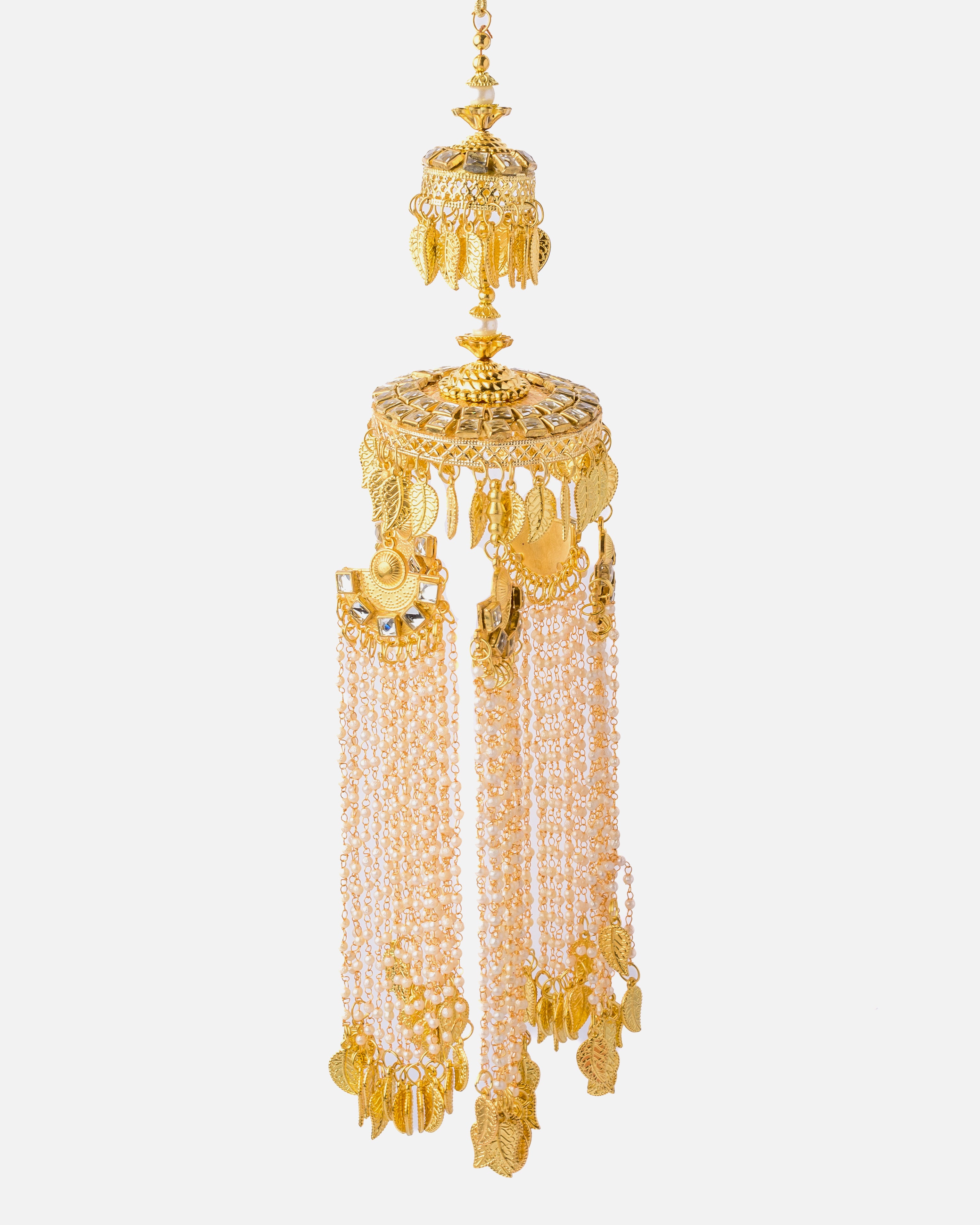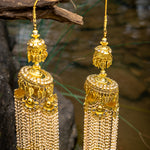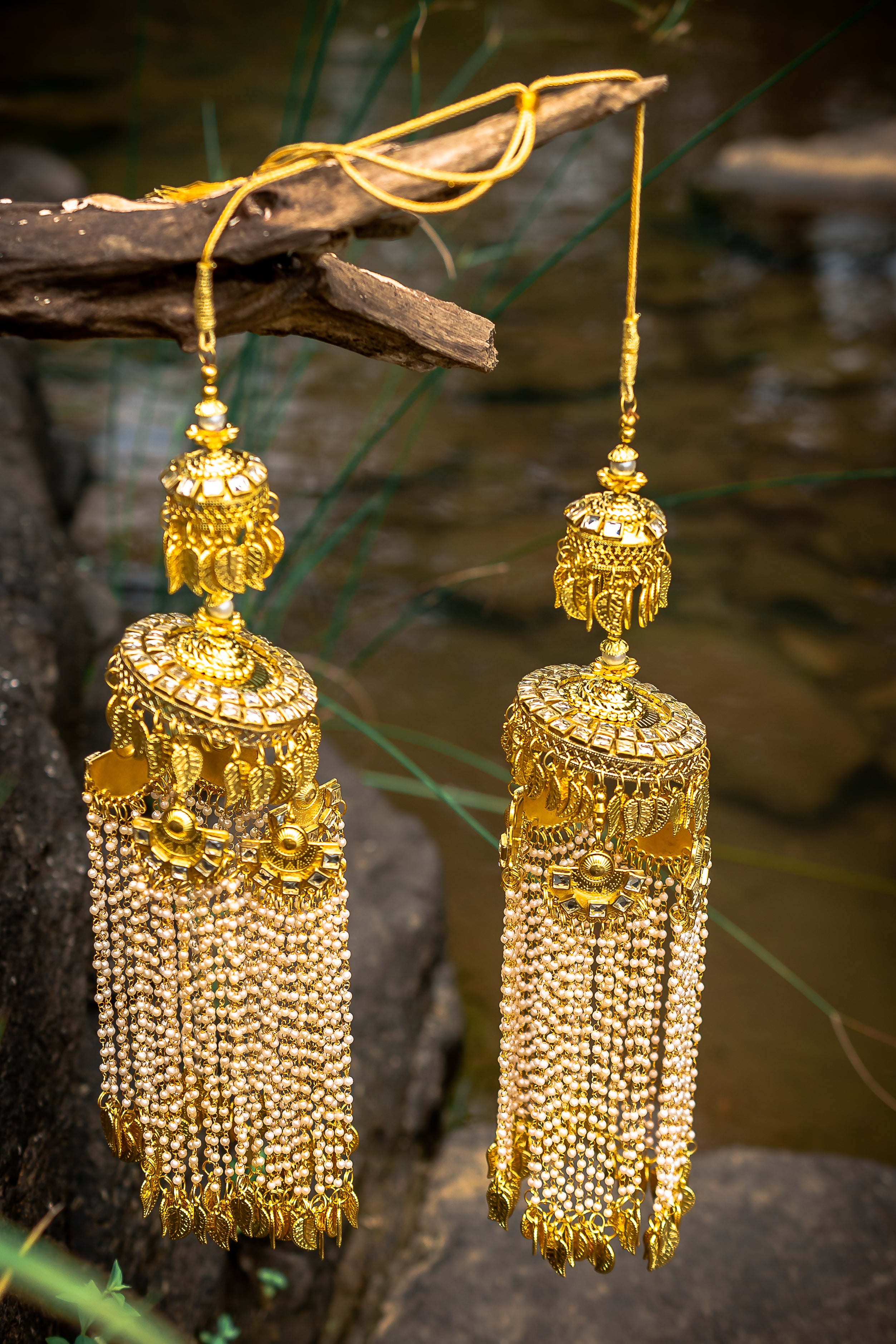 Elevate your bridal look with these exquisite golden kaleeras. Featuring intricate craftsmanship, cascading pearl-like beads, and traditional charm, they symbolize prosperity and add timeless elegance to your special day.
