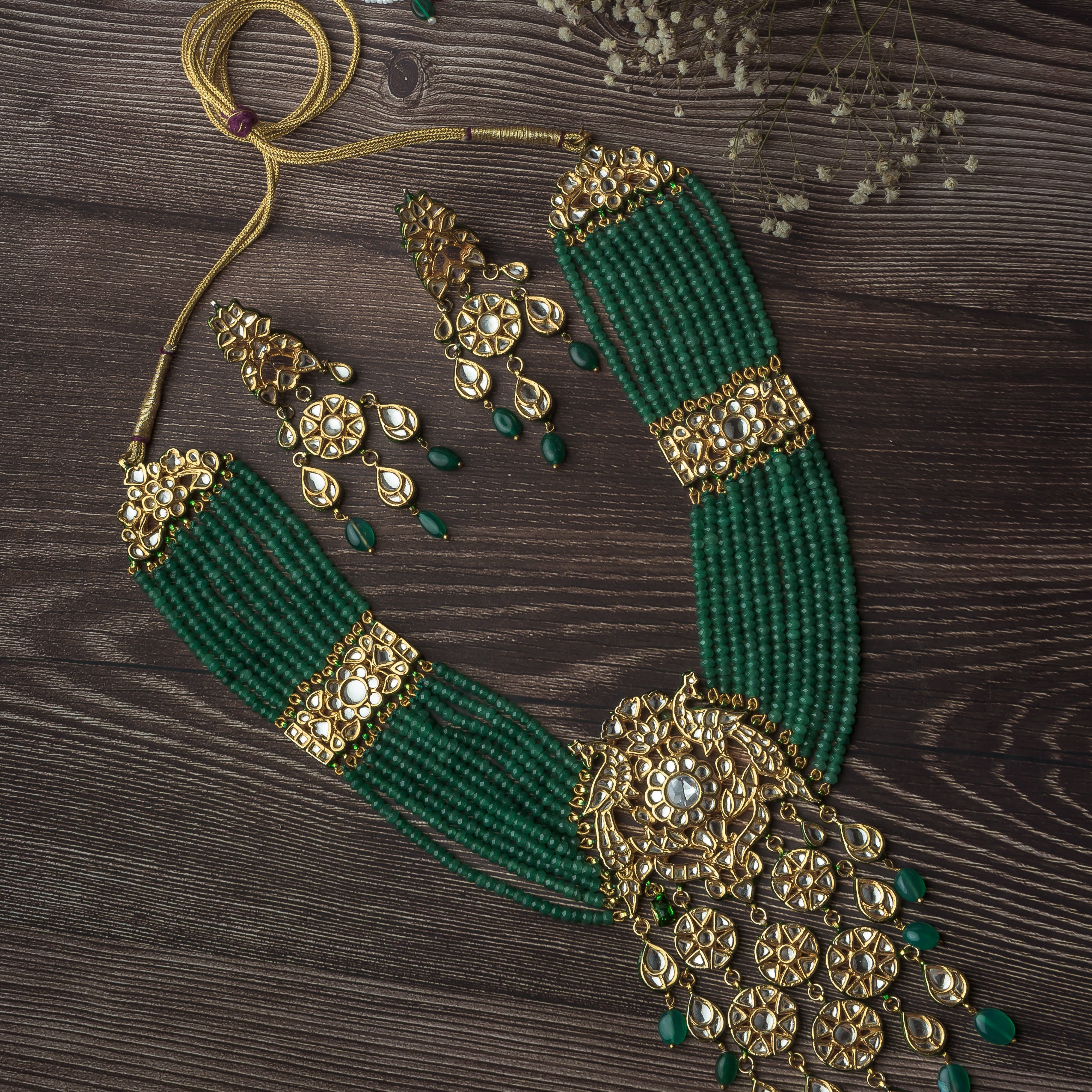 Gold Plated Green Womens Kundan Long Necklace Set with Pair of Earrings
