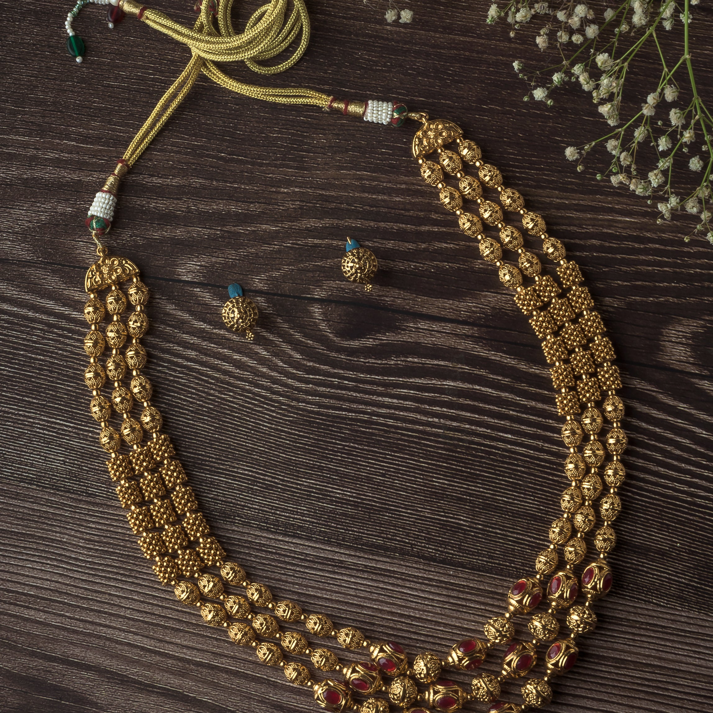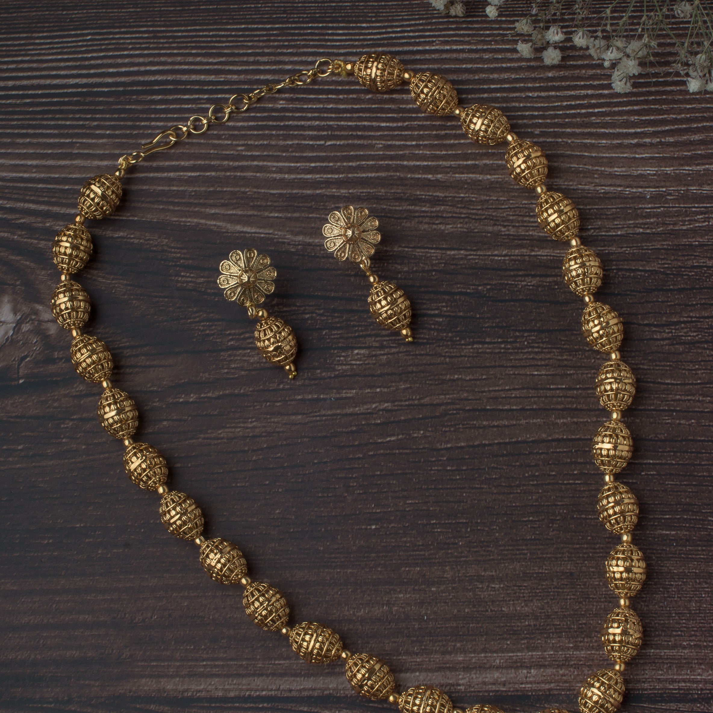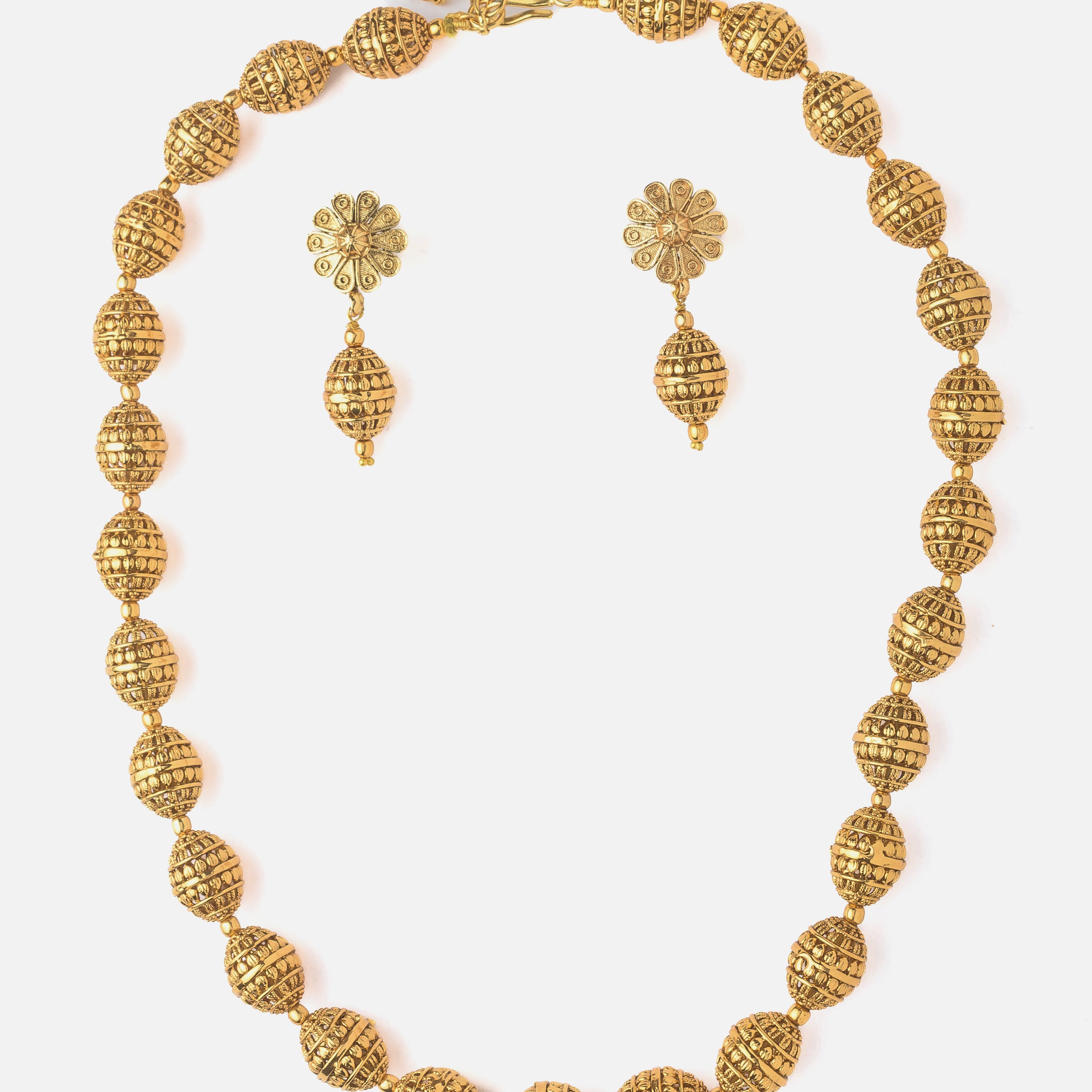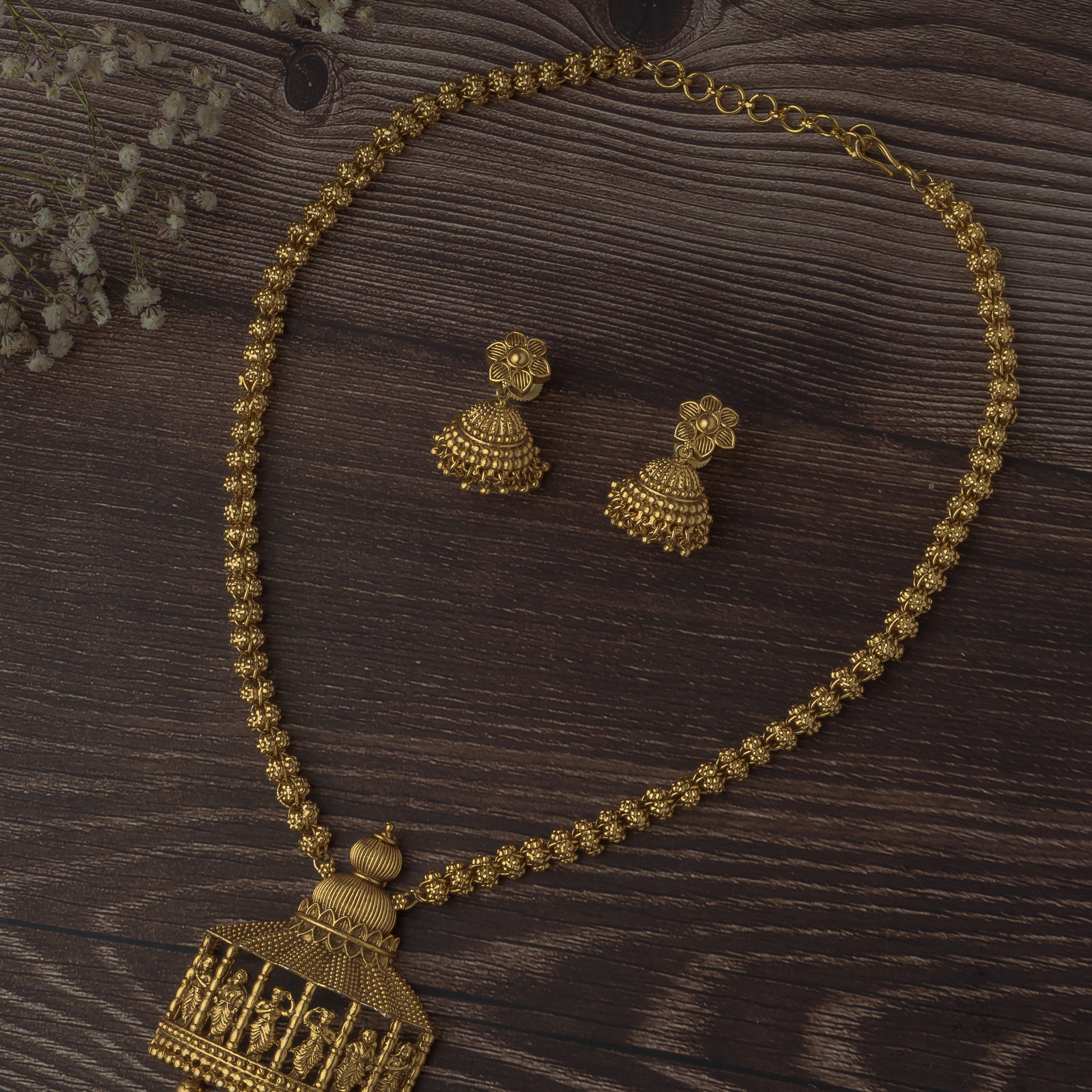 Gold Plated Womens Temple Long Necklace Set with Pair of Earrings