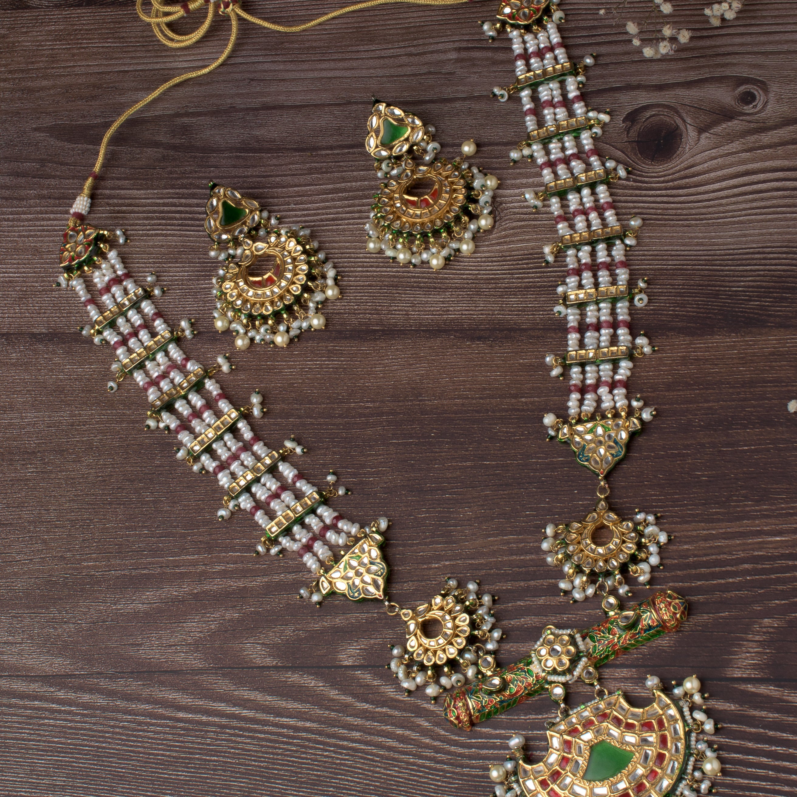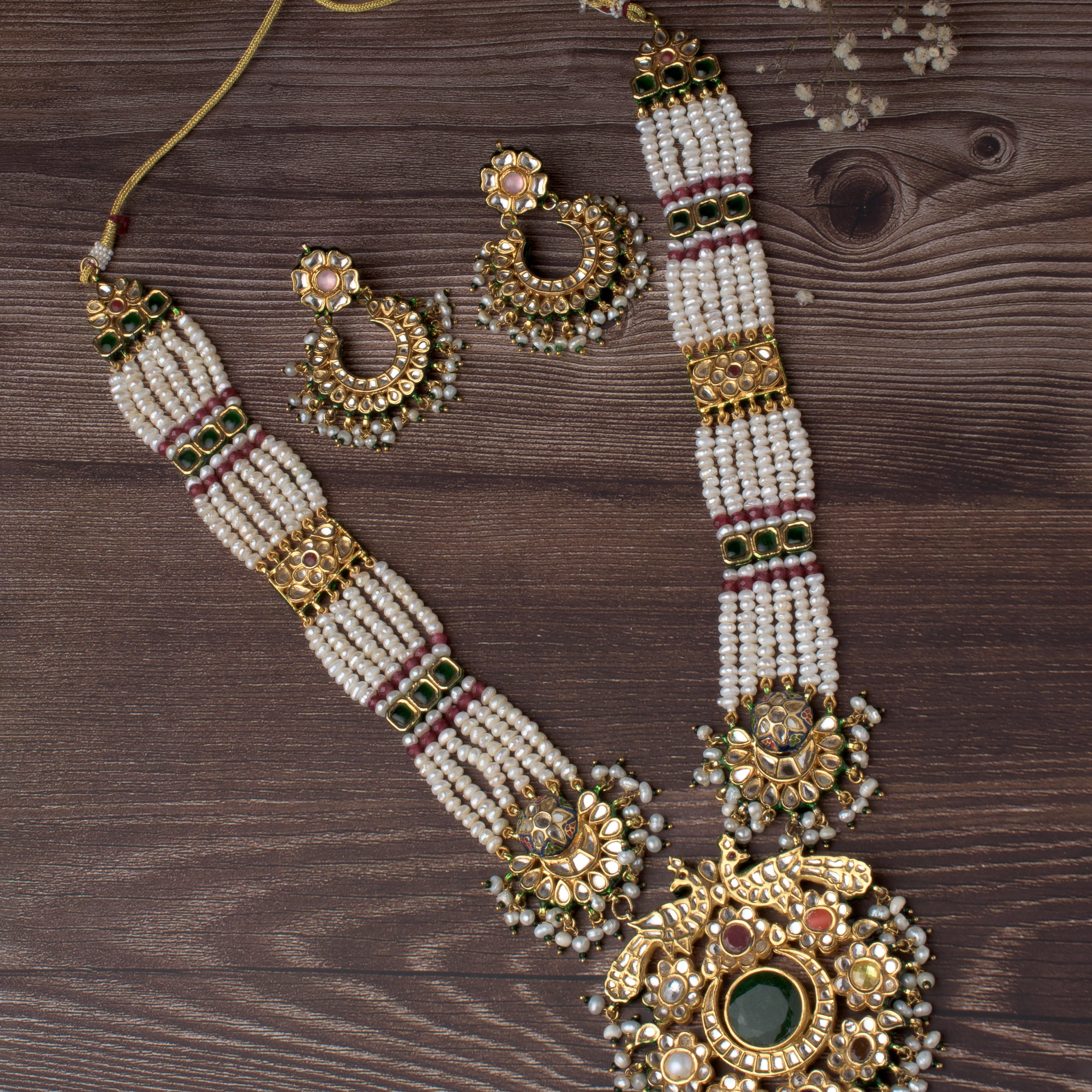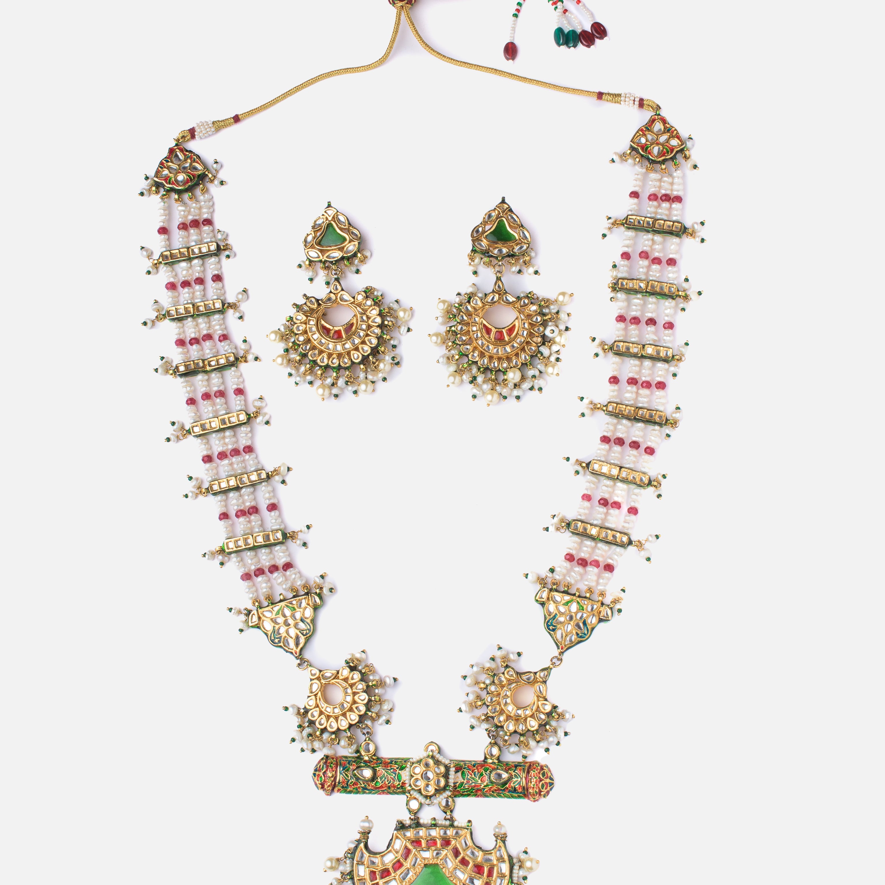 Gold Plated Womens Kundan Long Necklace Set with Pair of Earrings