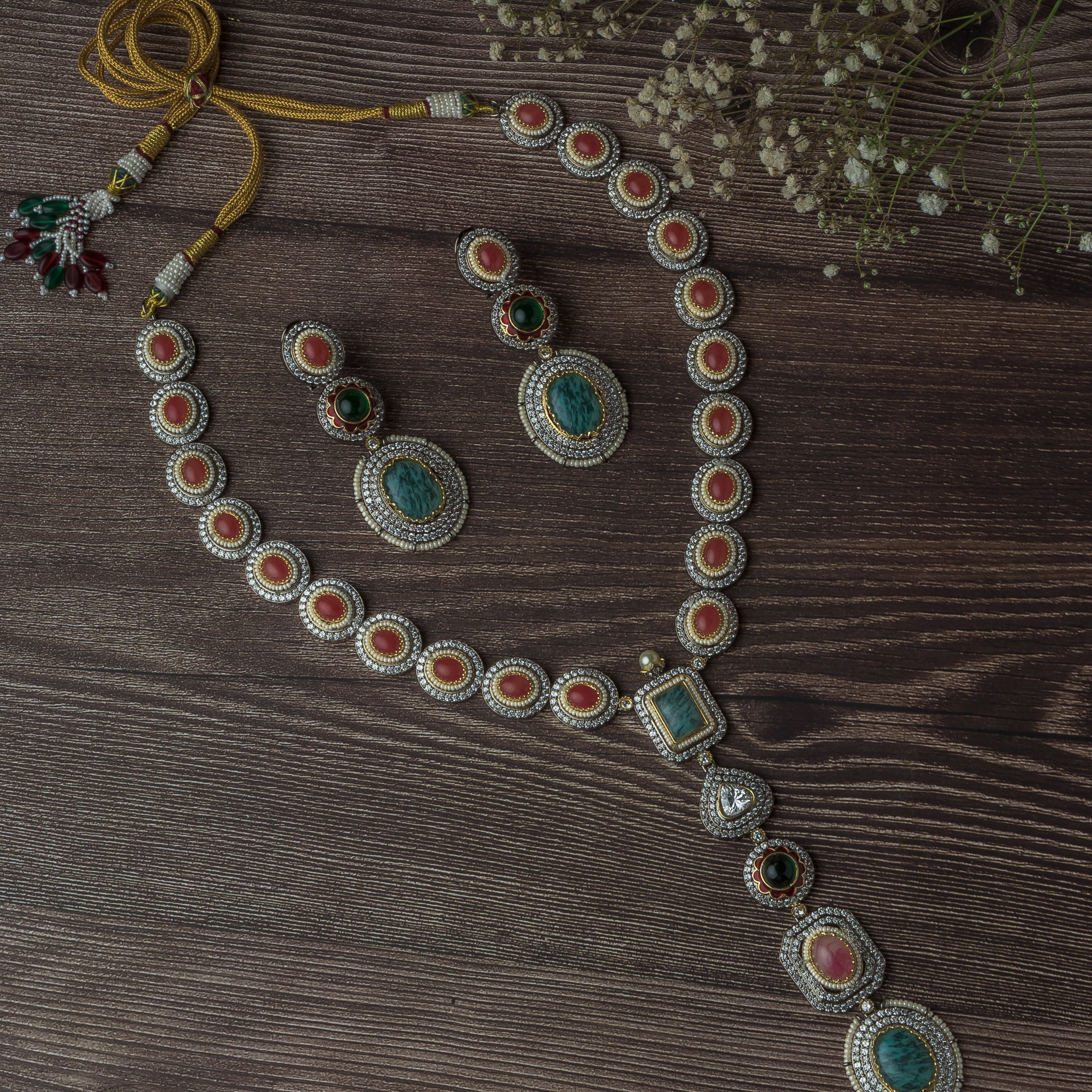 Silver Plated Multicolored Womens Synthetic Stone Long Necklace Set with Pair of Earrings
