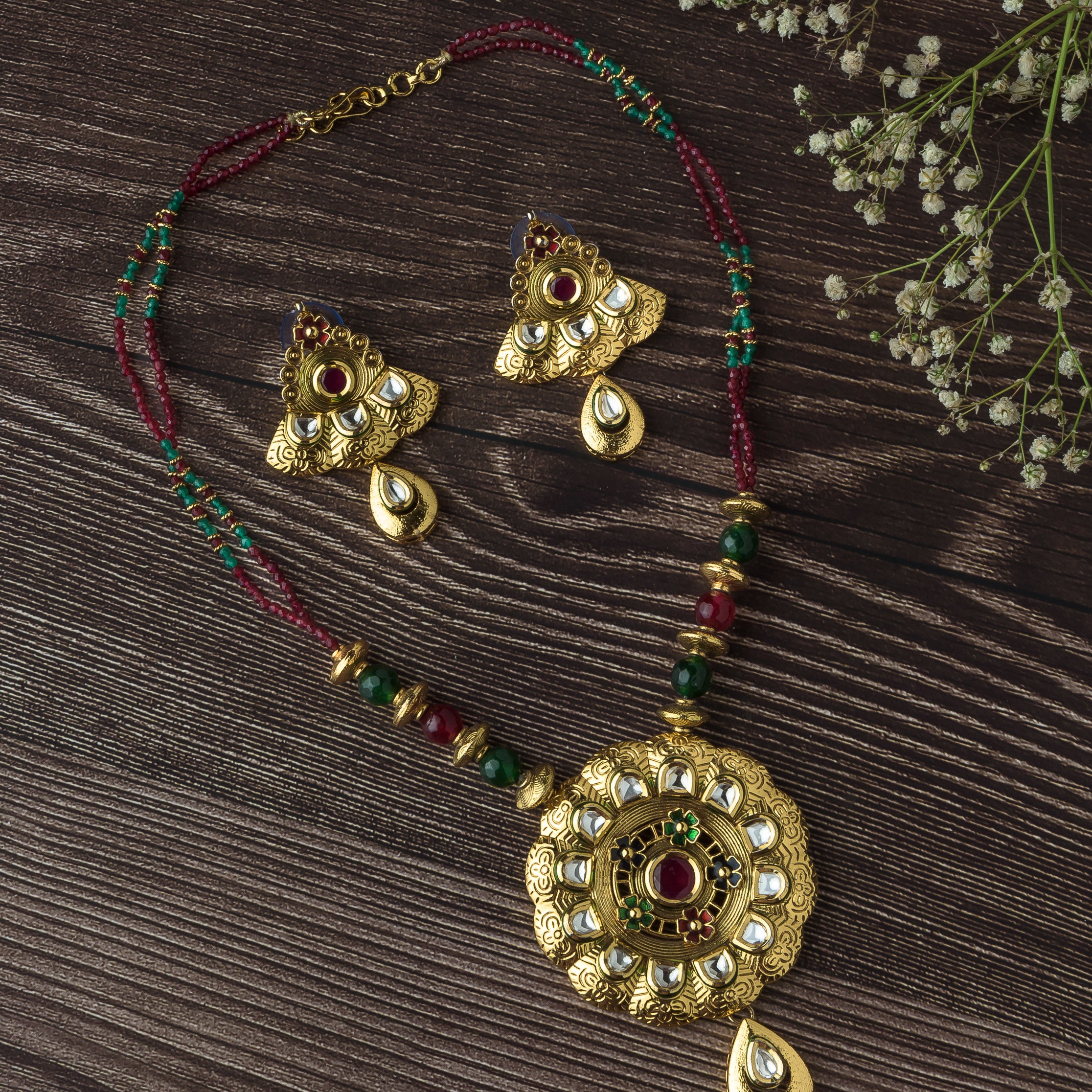 Gold Plated Red & Green Womens Synthetic Stone Long Necklace Set with Pair of Earrings