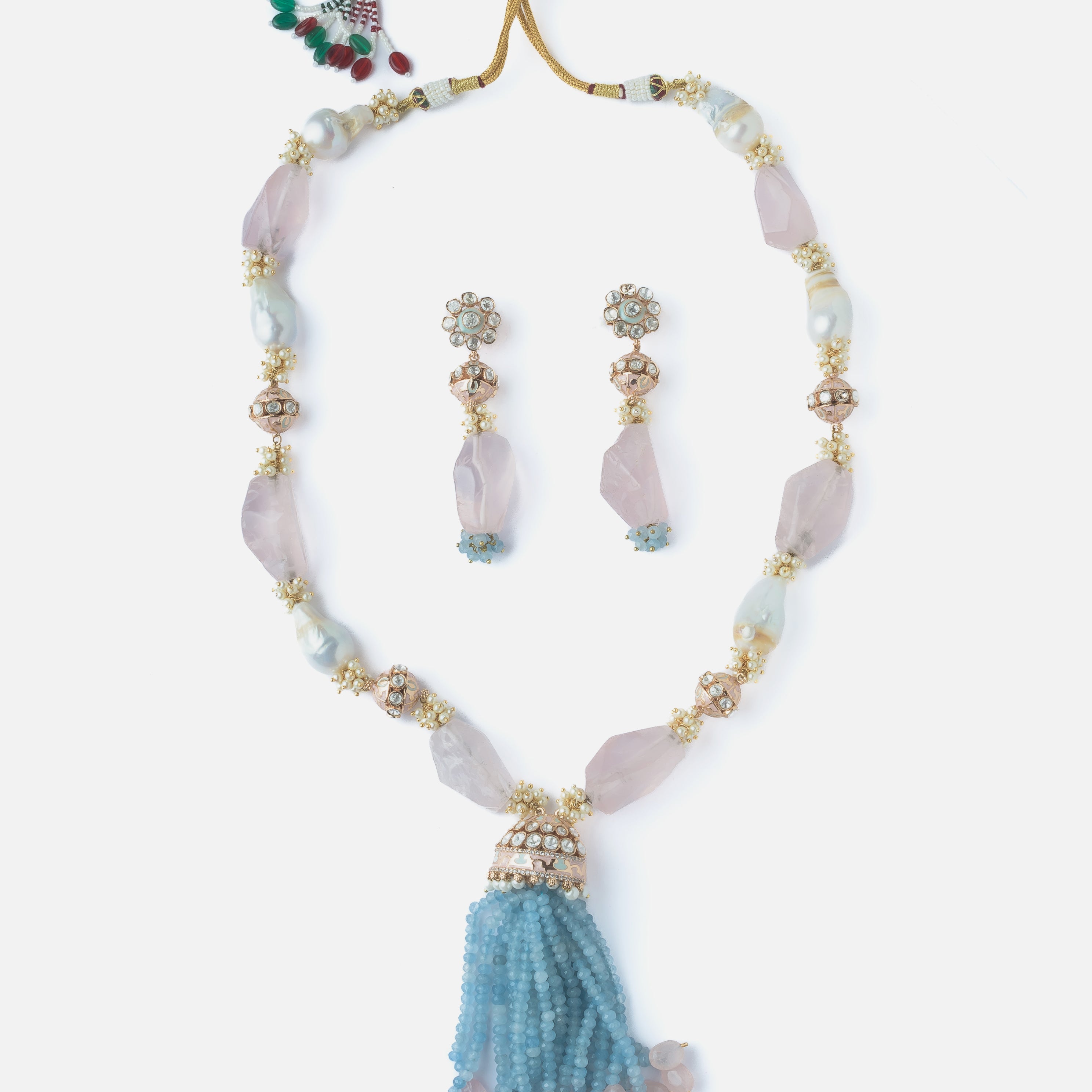Gold Plated Pink & Blue Womens Beads Long Necklace Set with Pair of Earrings