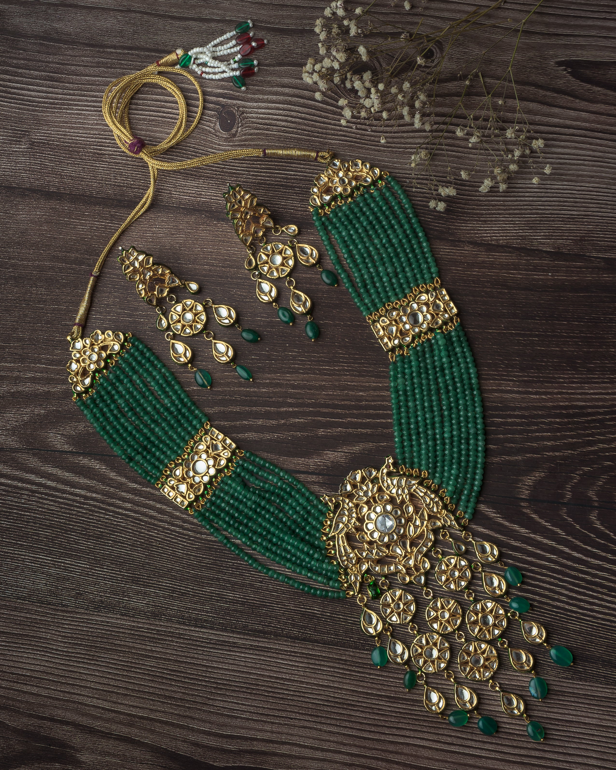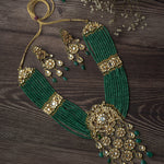 Majestic green beaded necklace set featuring a grand Kundan pendant with matching earrings. Adorned with gold-toned motifs and green drops, perfect for bridal wear and traditional celebrations.