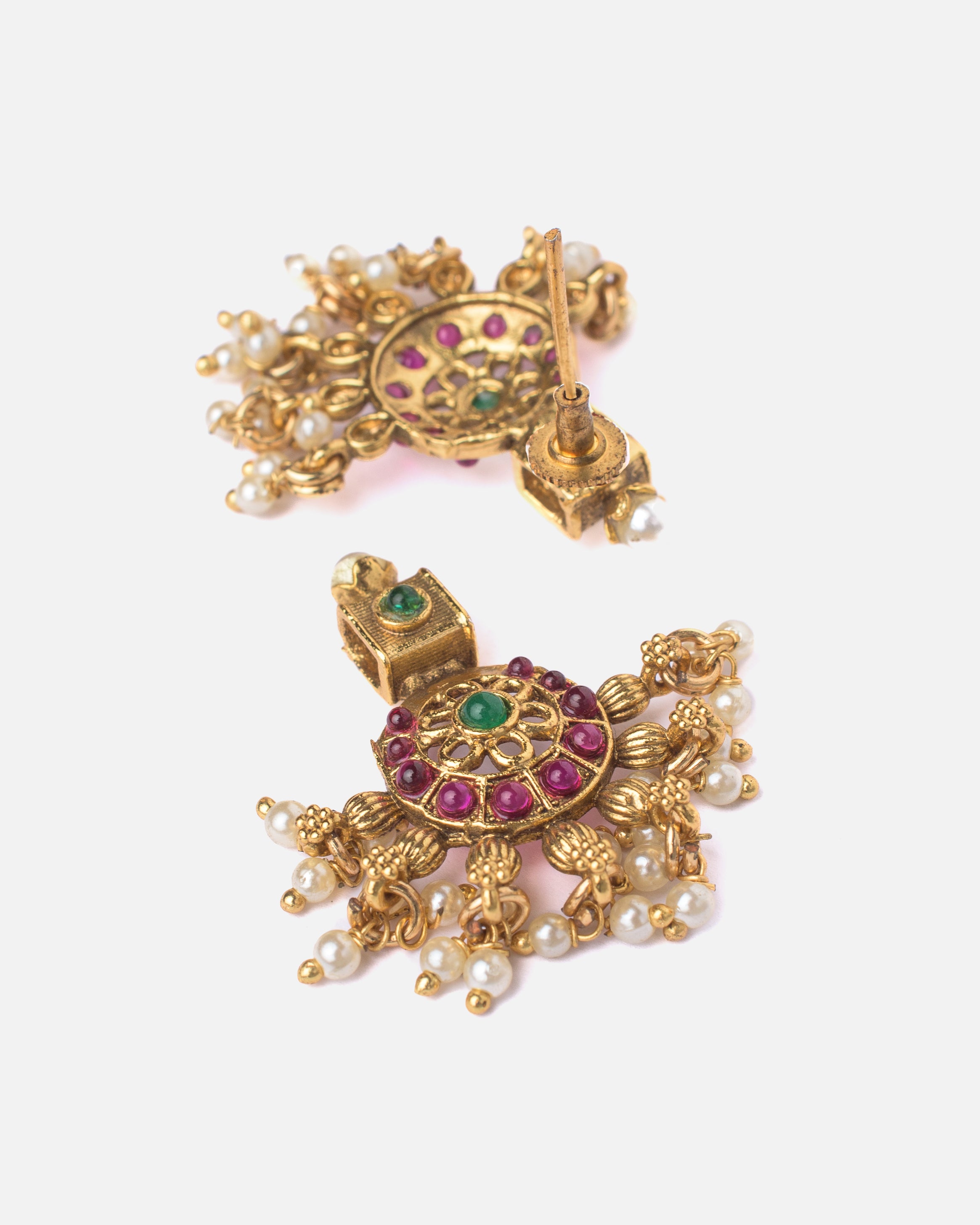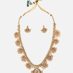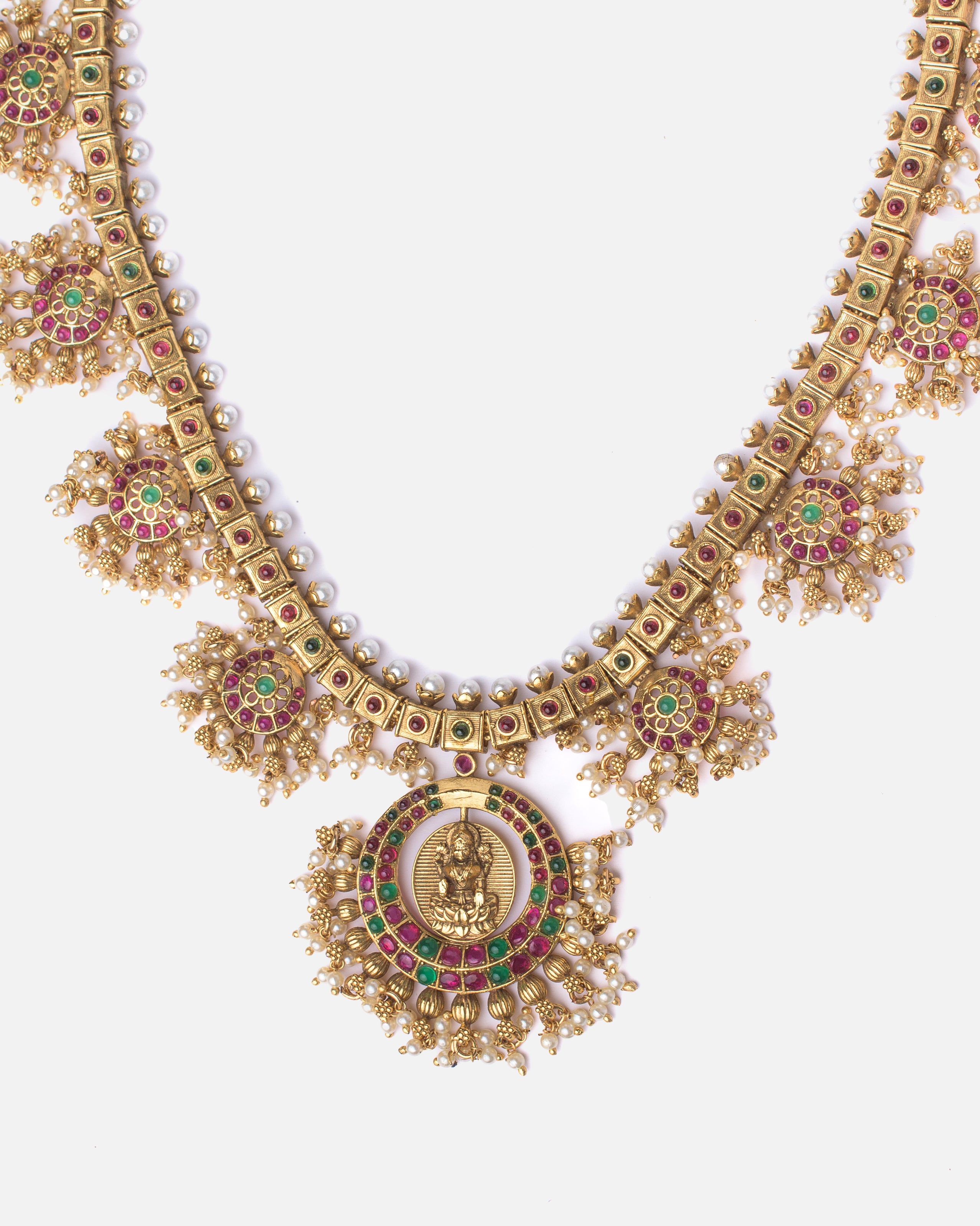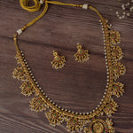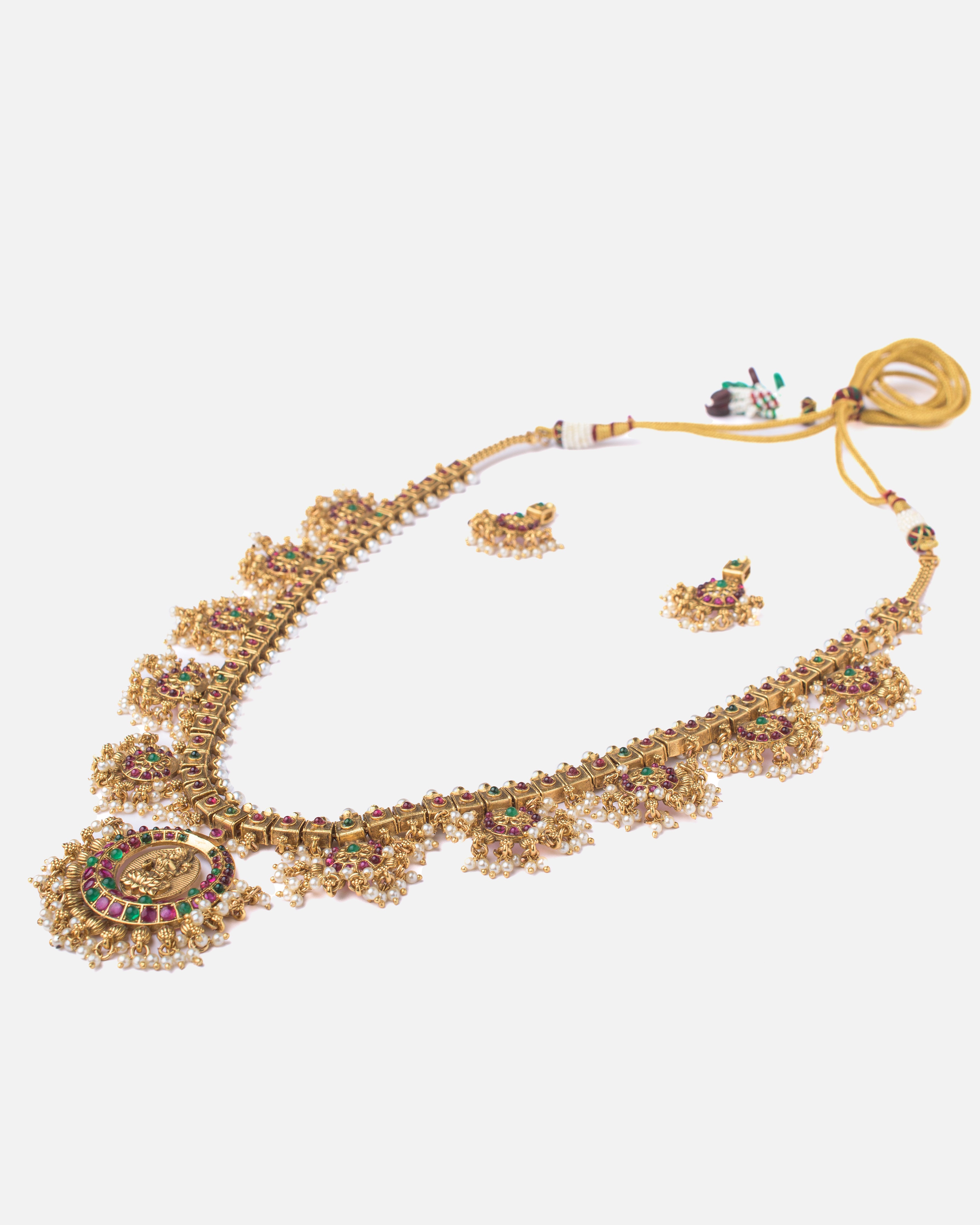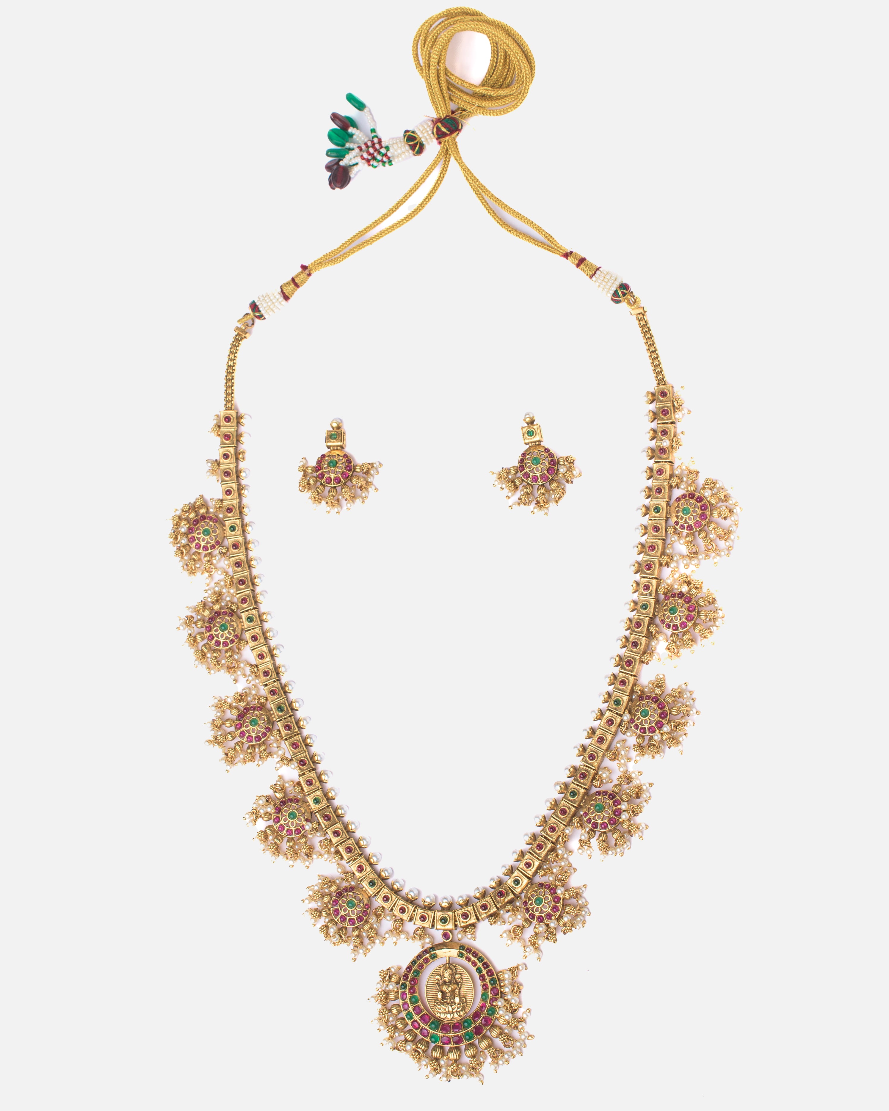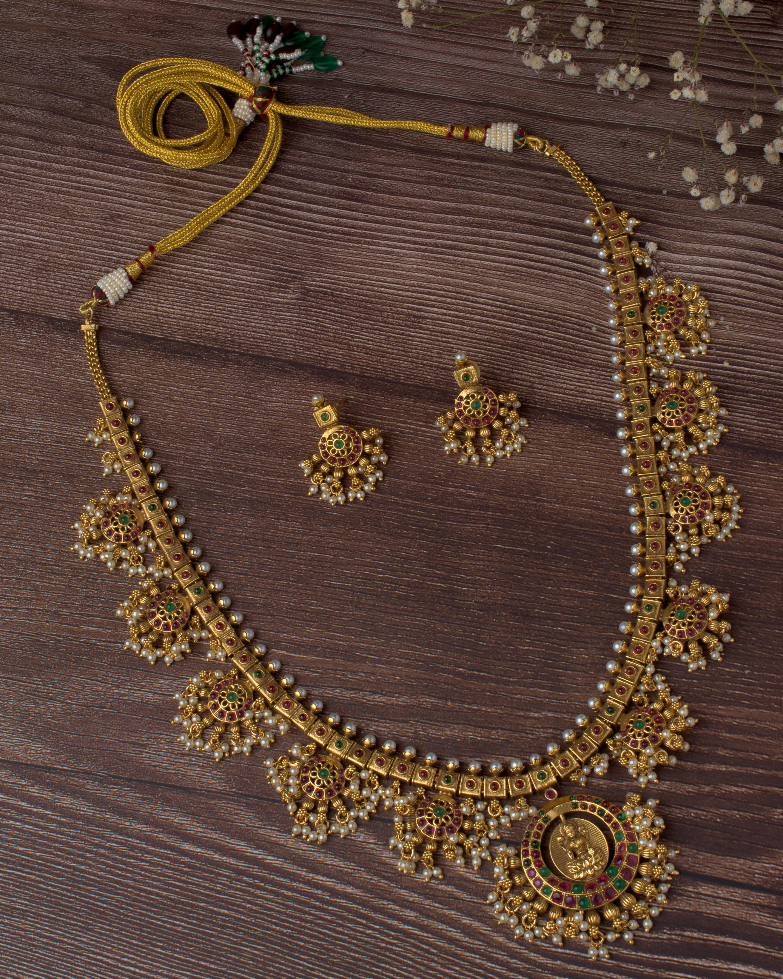 This stunning traditional necklace set features an antique gold finish with intricate temple-style motifs and embedded stones. Paired with matching earrings, it’s perfect for weddings and festive occasions.