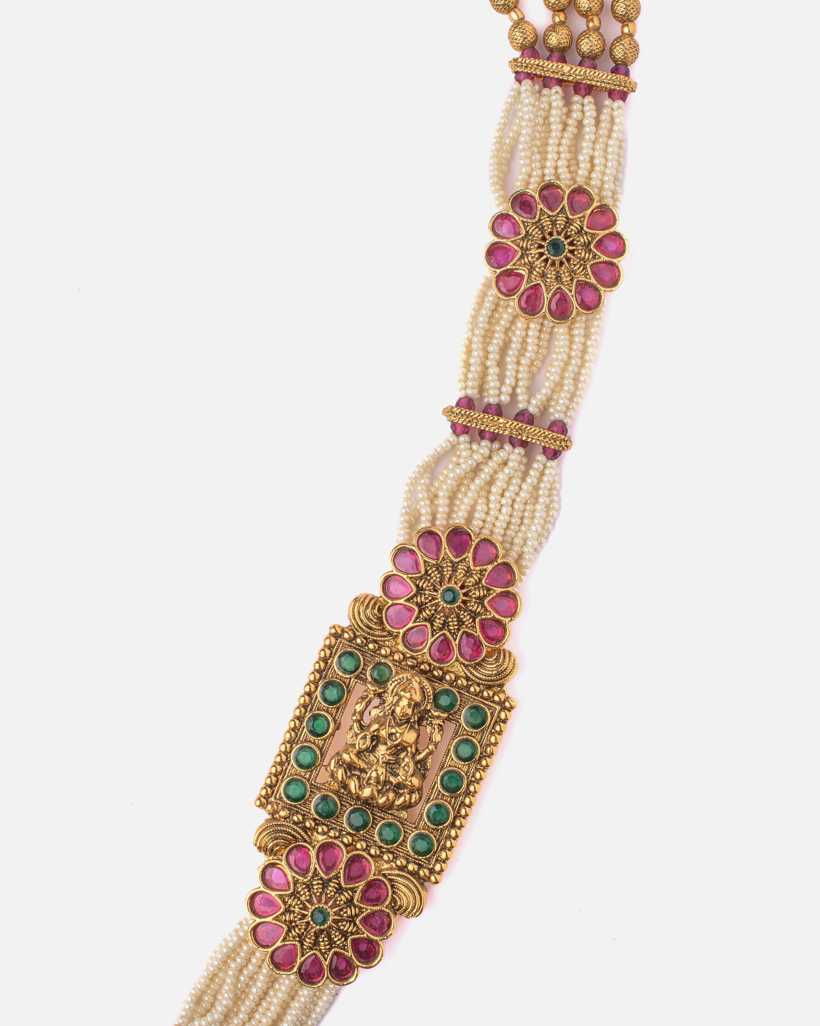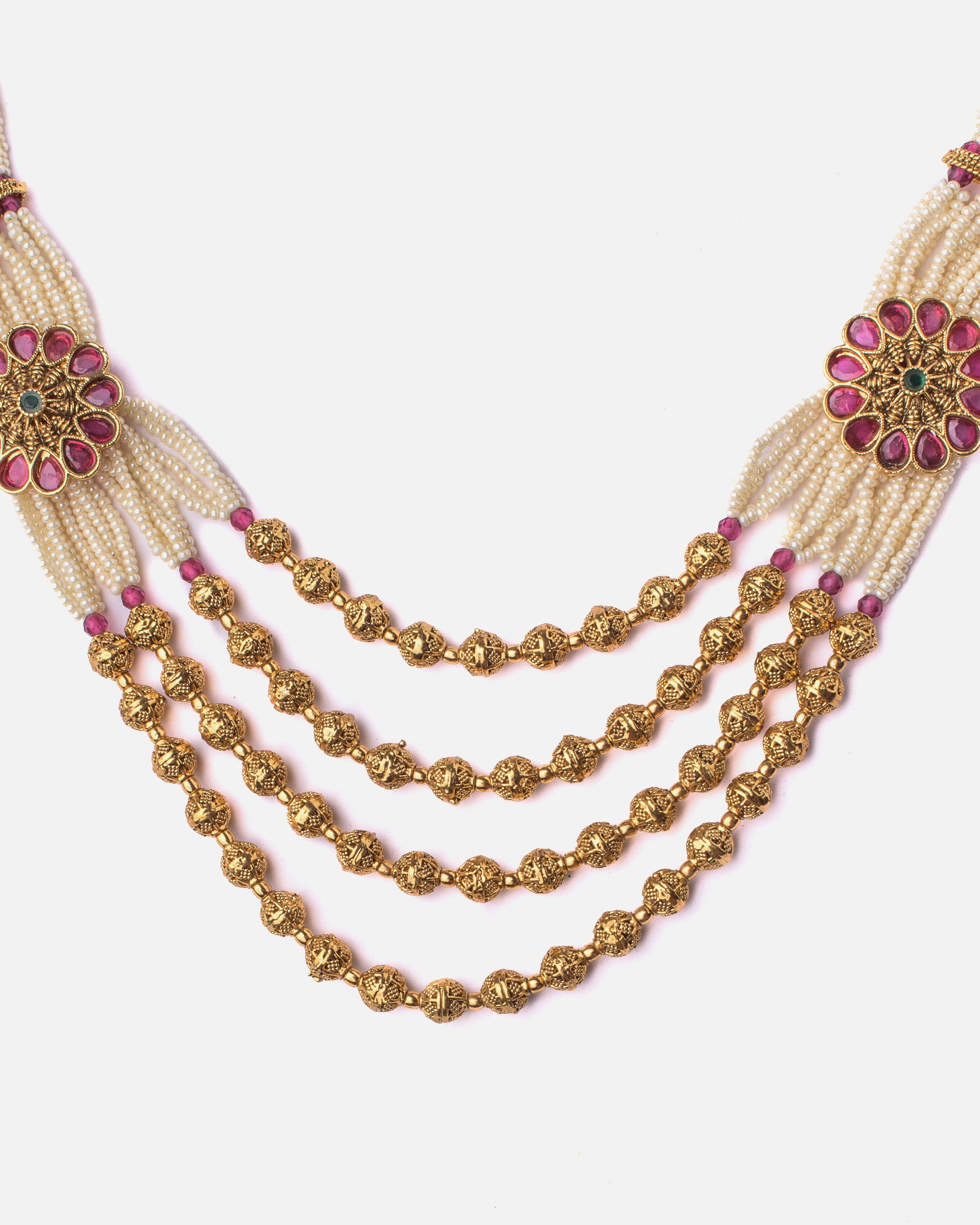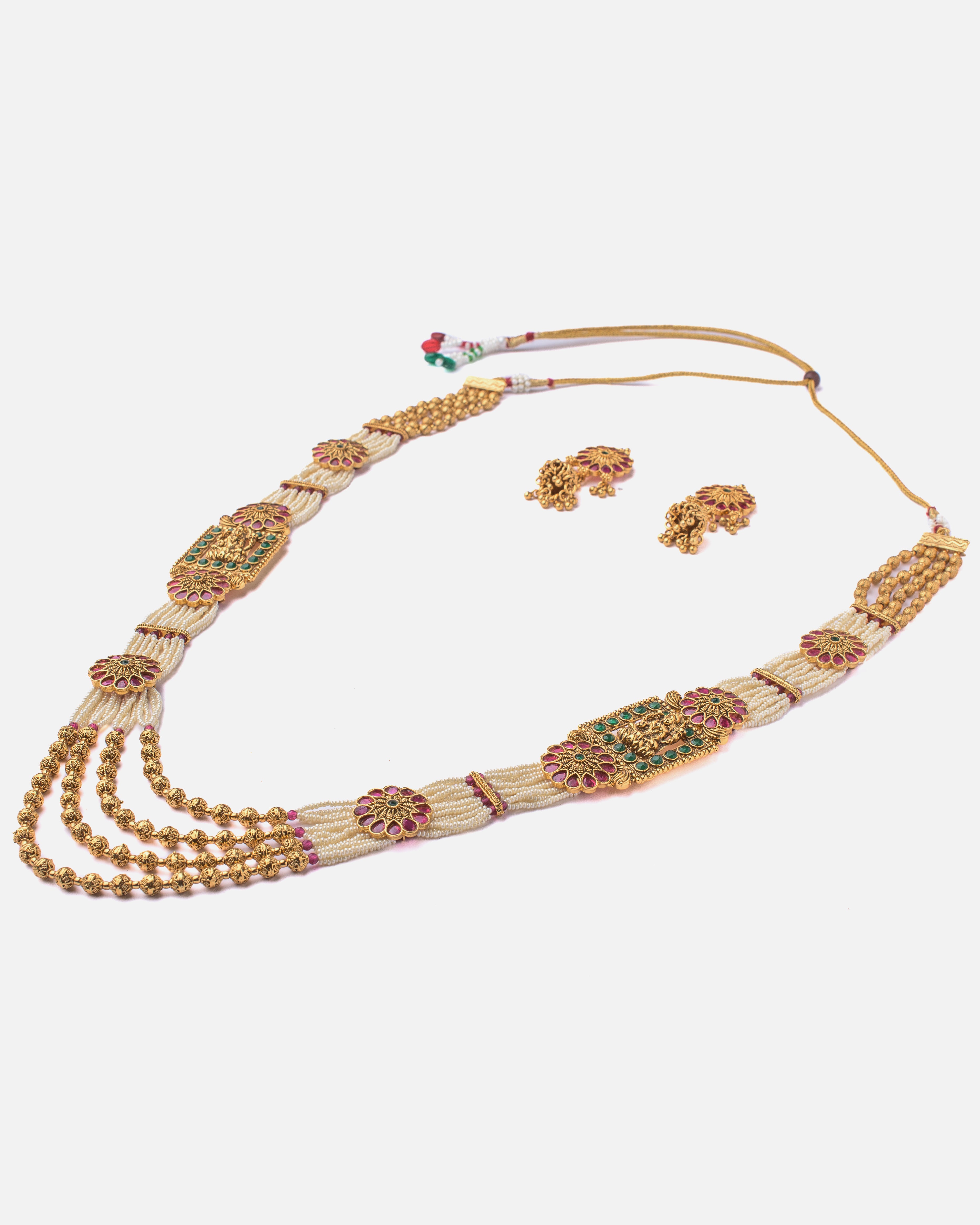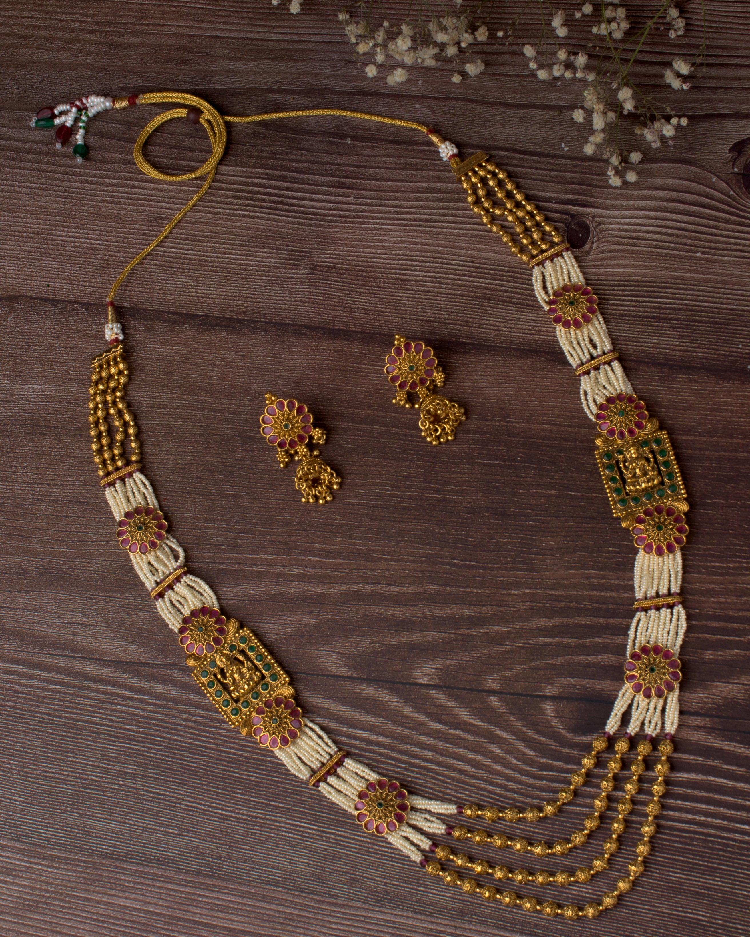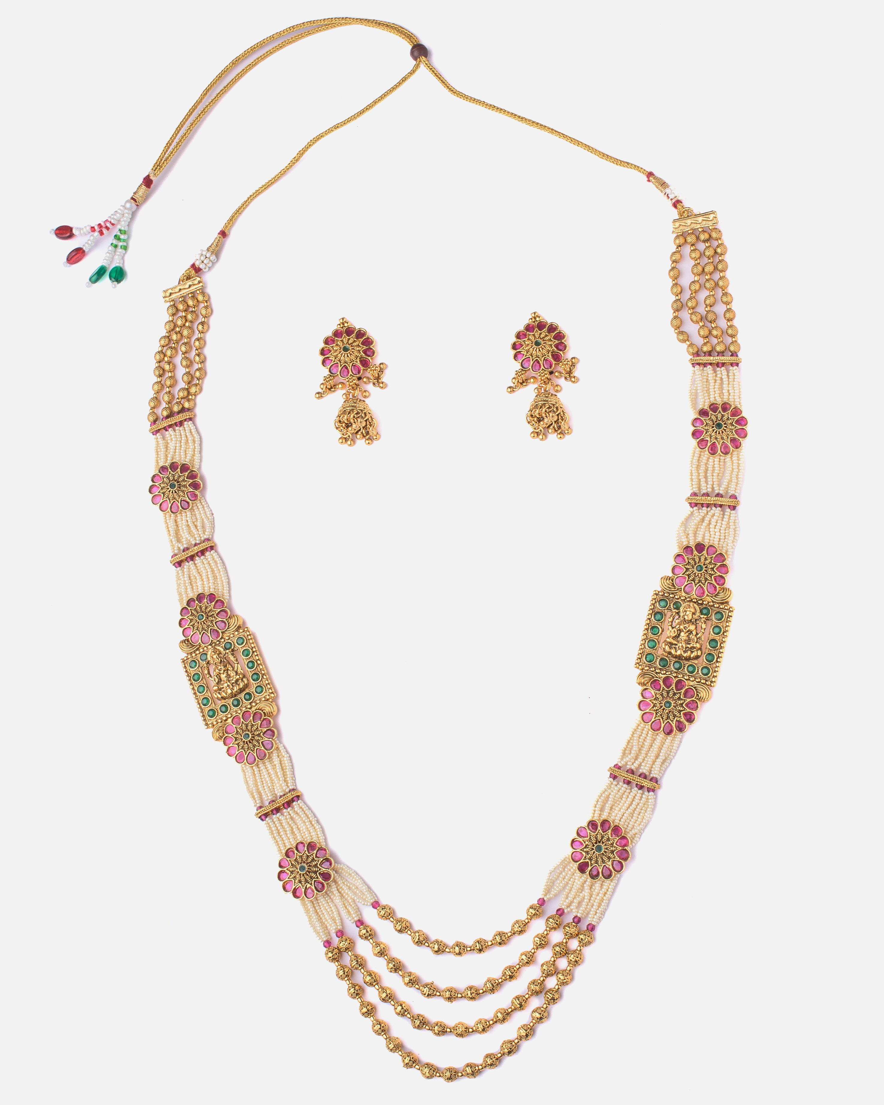 Elegant long necklace set featuring intricate gold-toned beads, pearl accents, and floral motifs. Designed with multiple strands for a regal look, perfect for weddings and festive occasions. Matching earrings included.