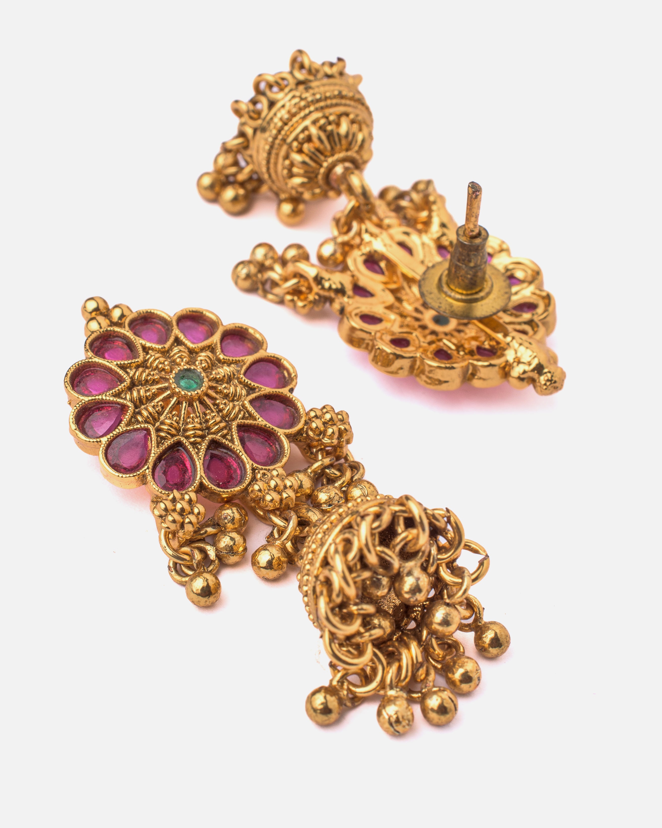 Saadgi Gold Plated Red Womens Long Necklace Set with Pair of Earrings