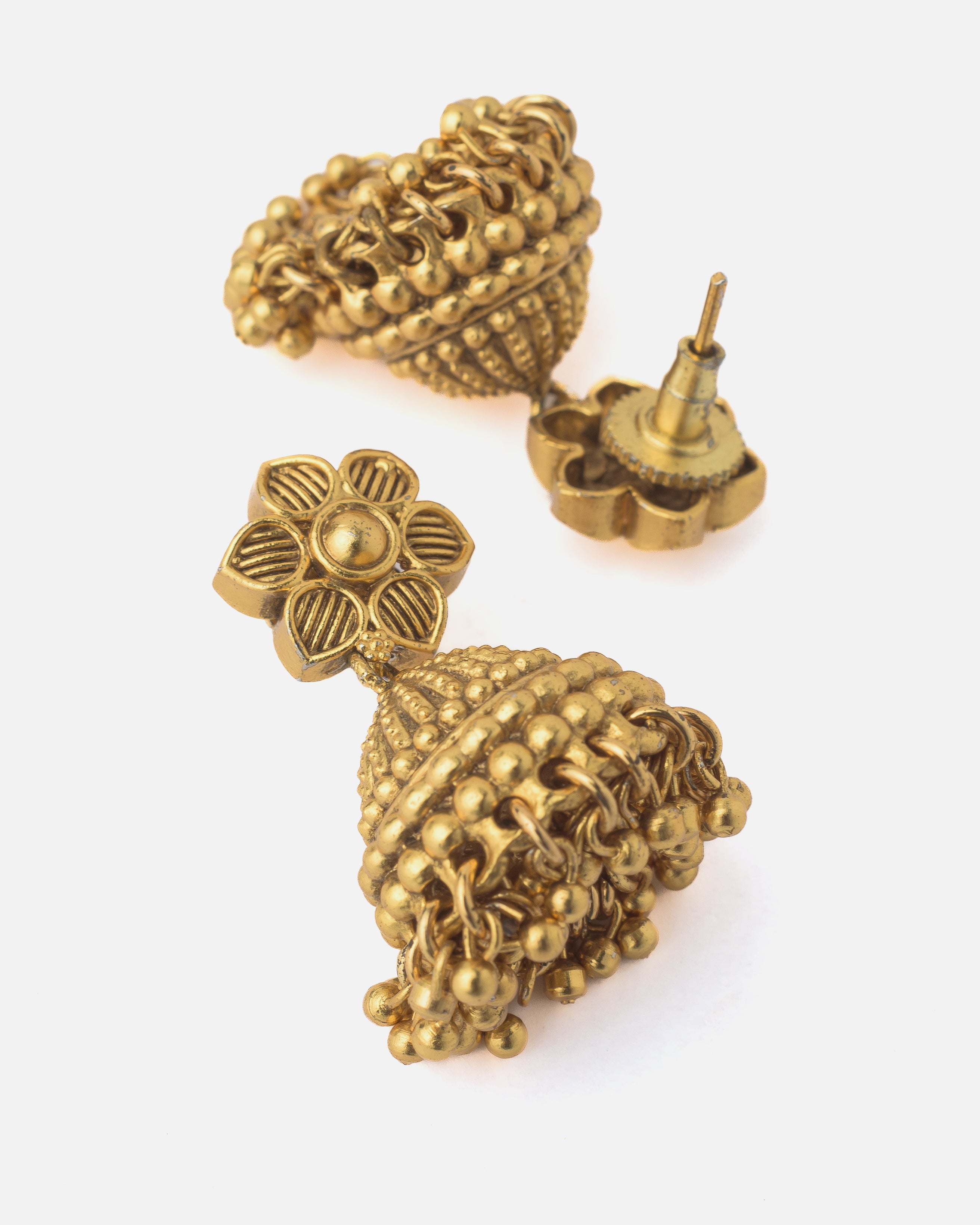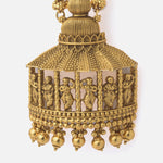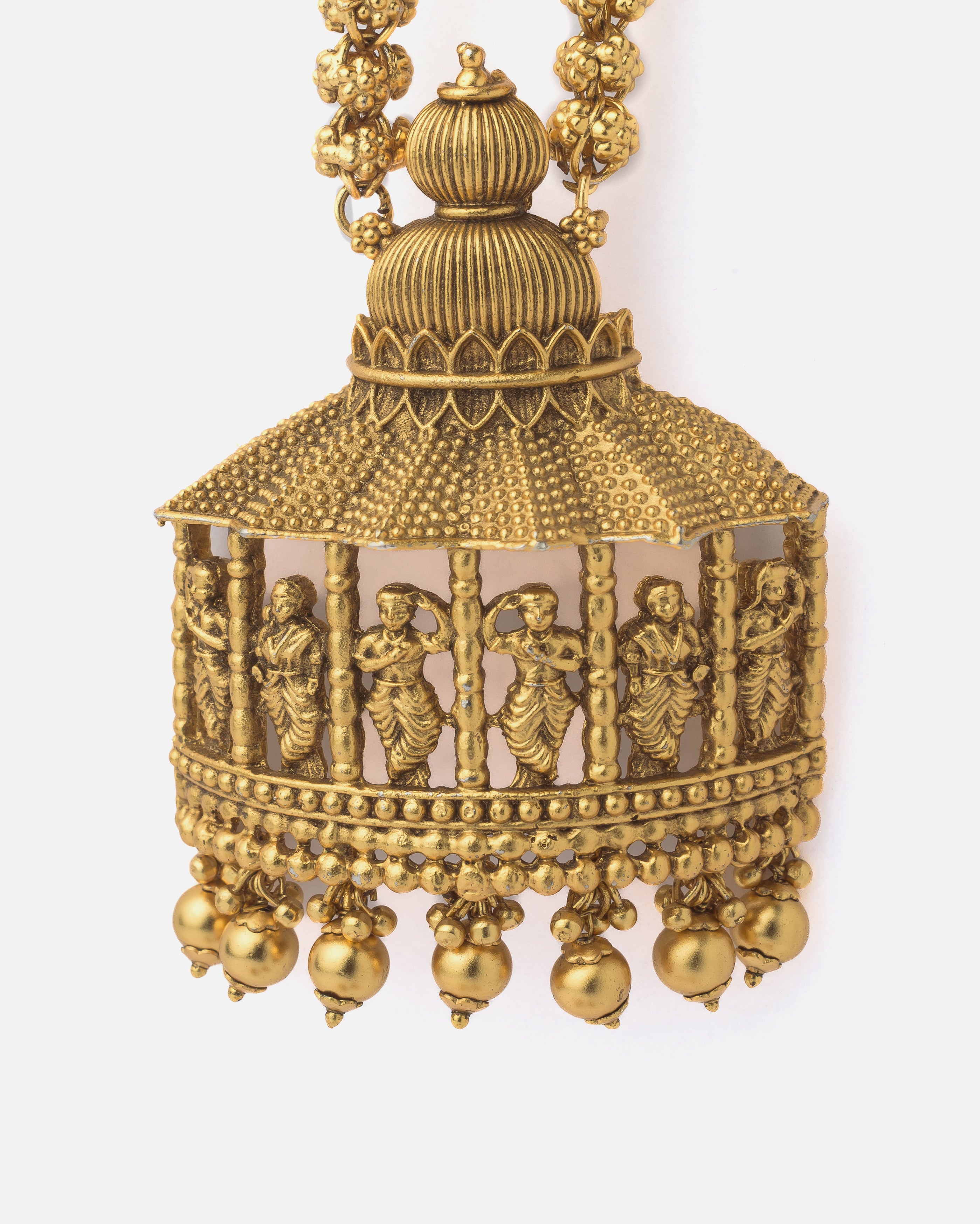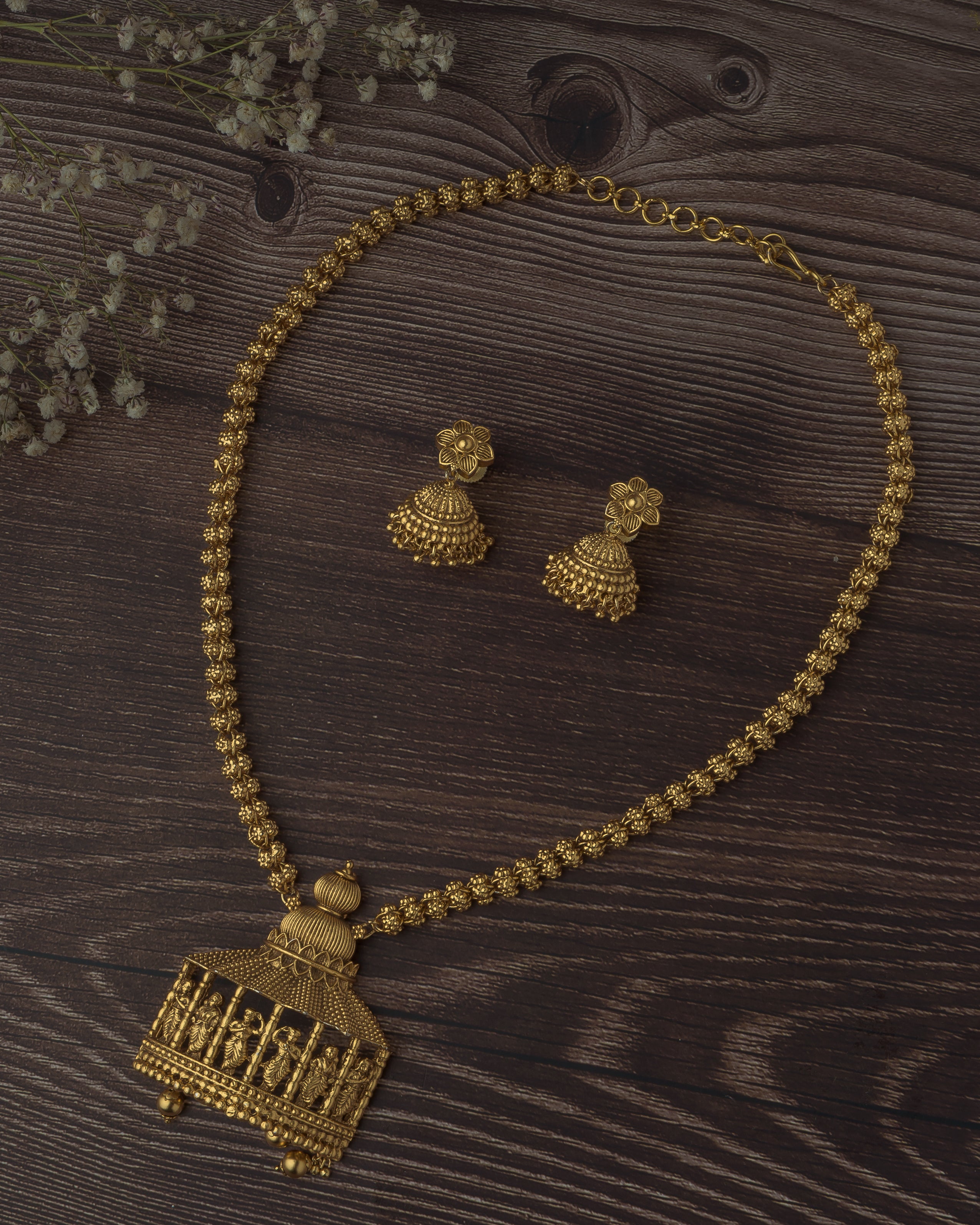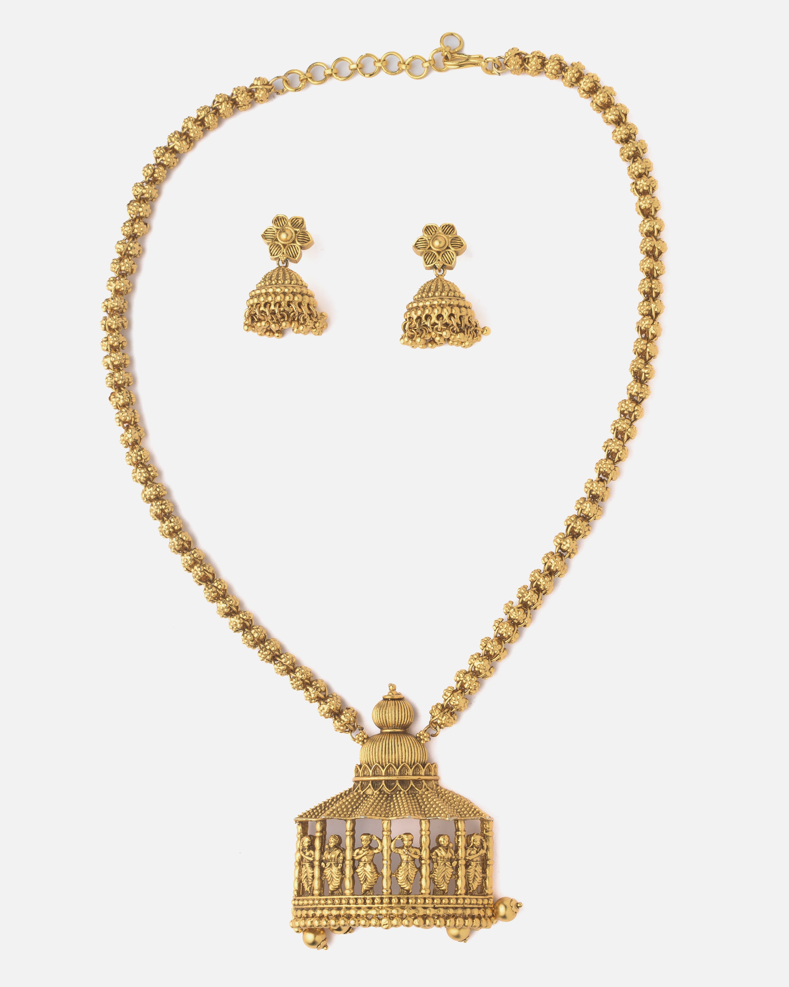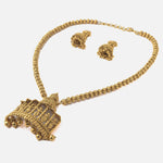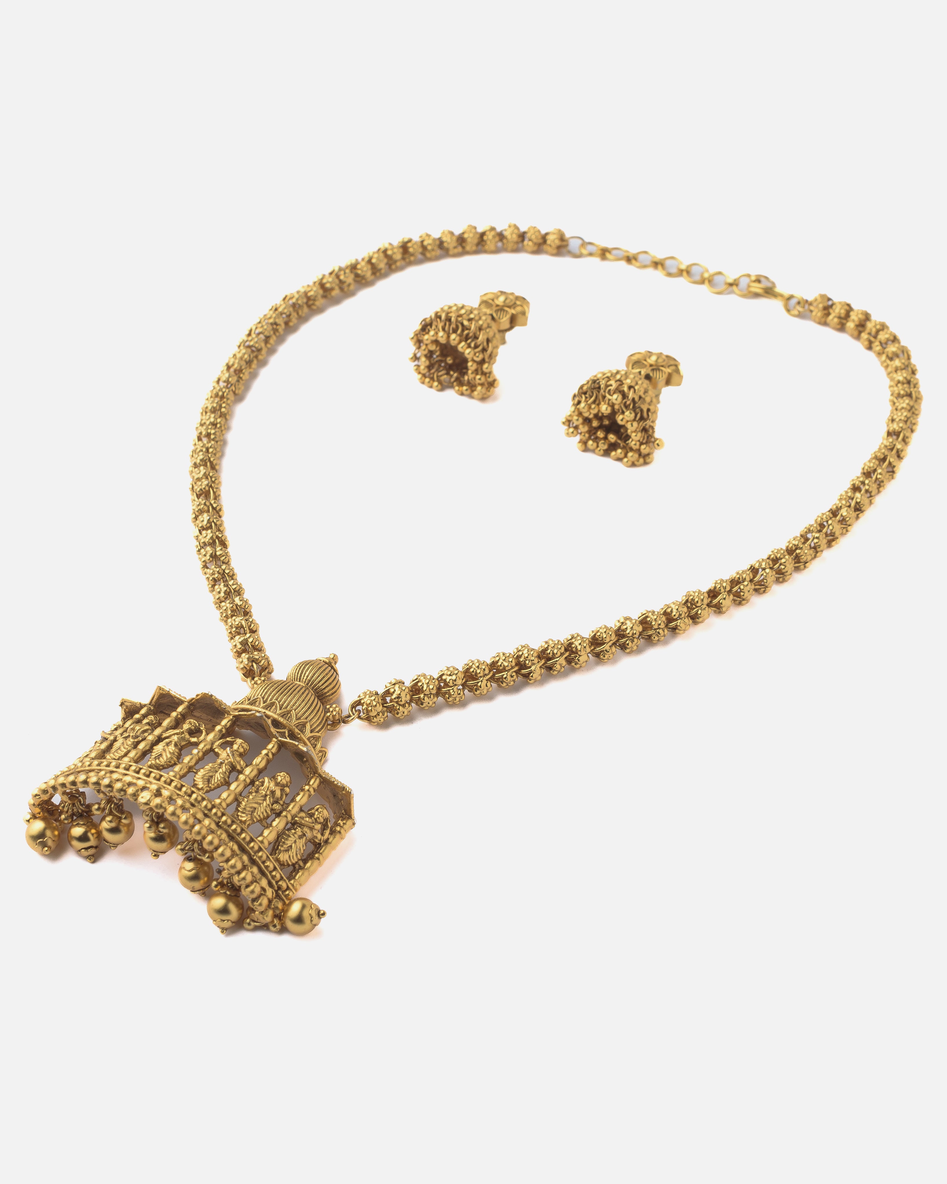 Elevate your traditional look with this exquisite gold-toned necklace and earring set. Featuring intricate temple-inspired design, it’s perfect for festive occasions and ethnic ensembles.
