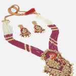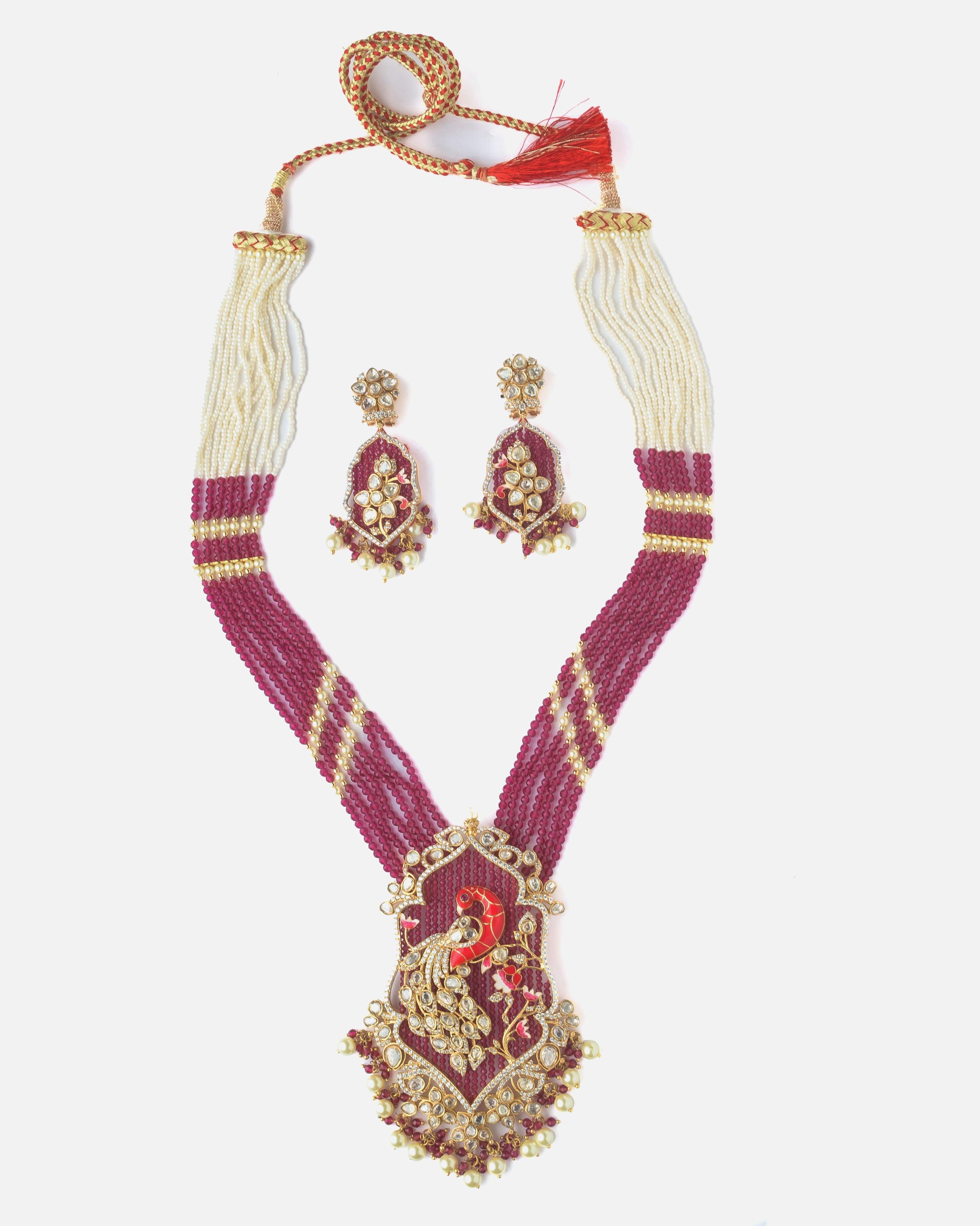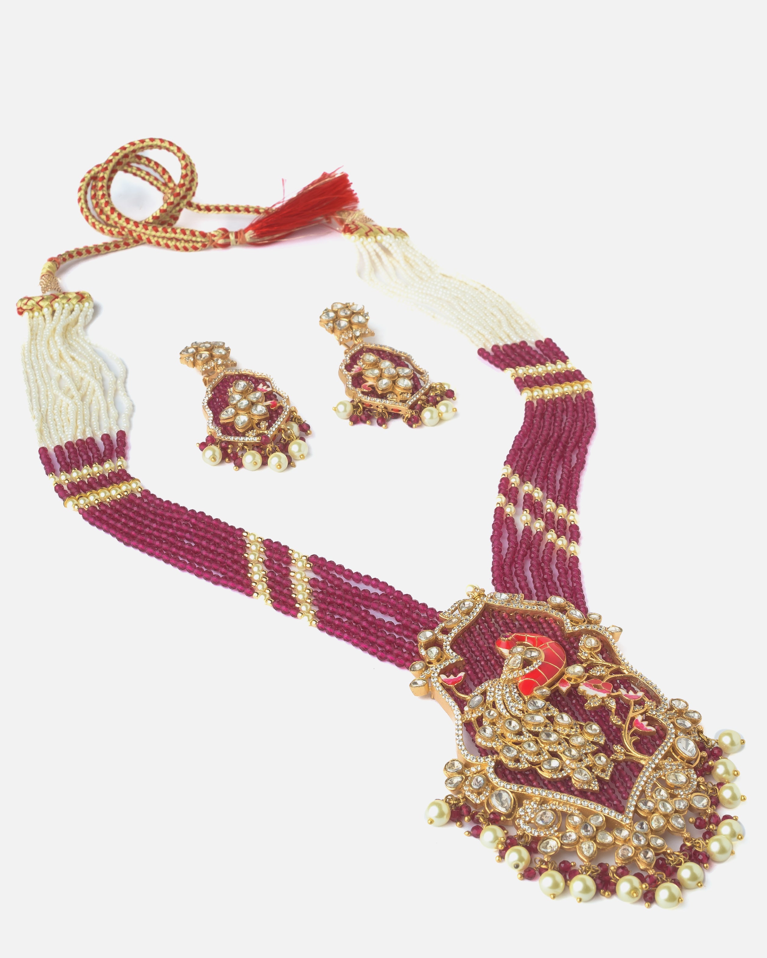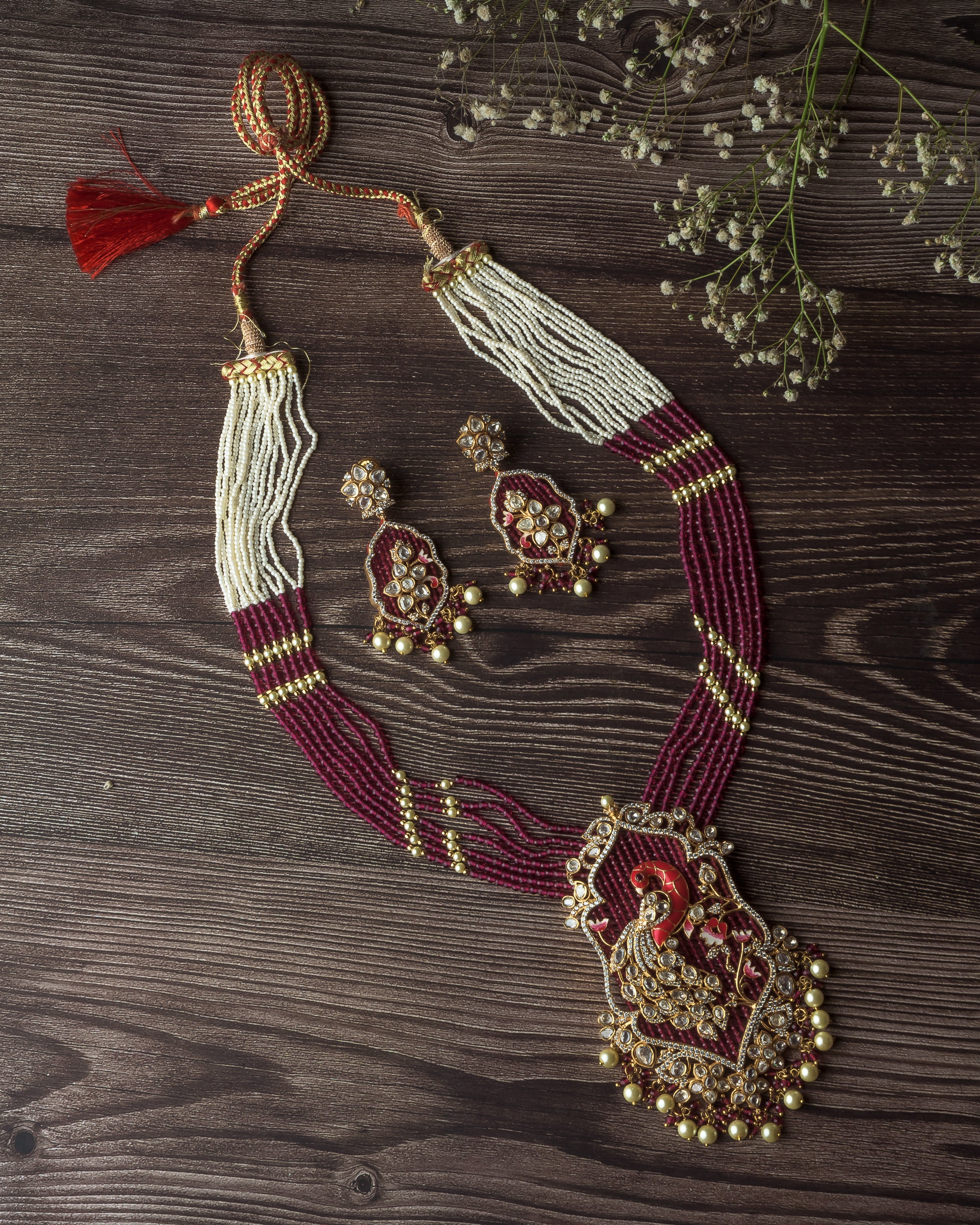 Elegant handcrafted necklace set with maroon and white bead strands, featuring a detailed peacock pendant with pearl drops. Paired with matching earrings, perfect for weddings and traditional occasions.