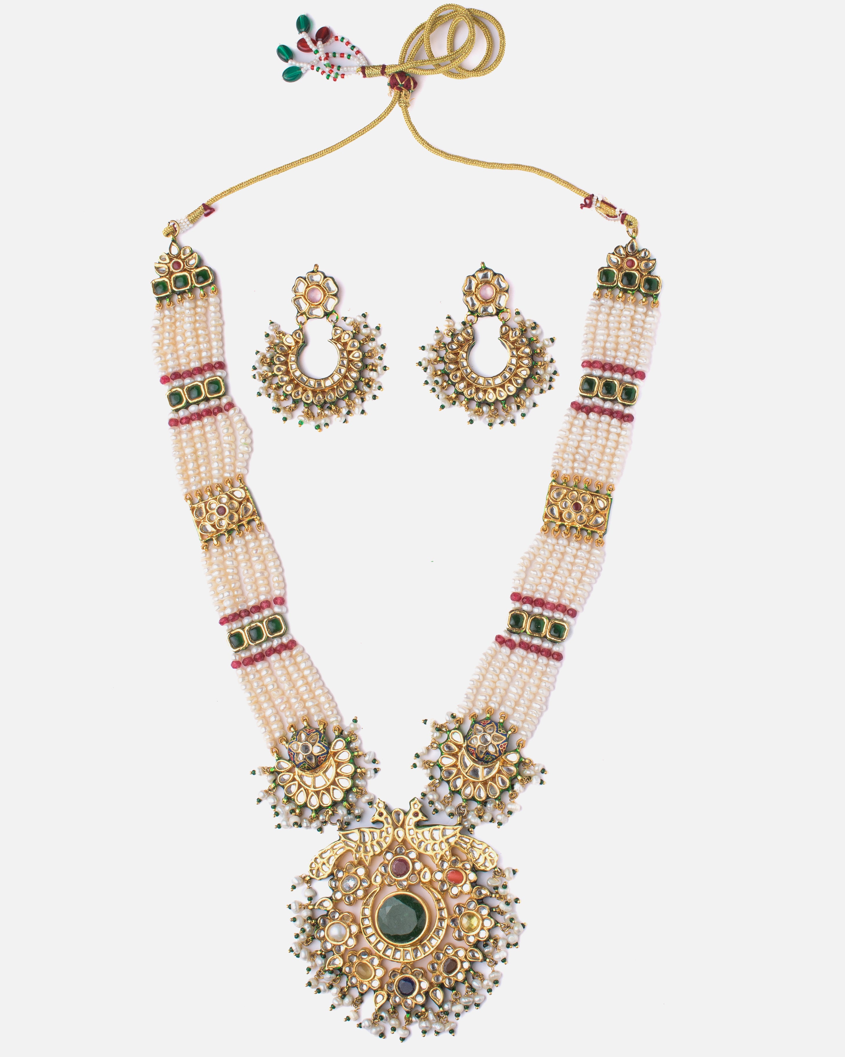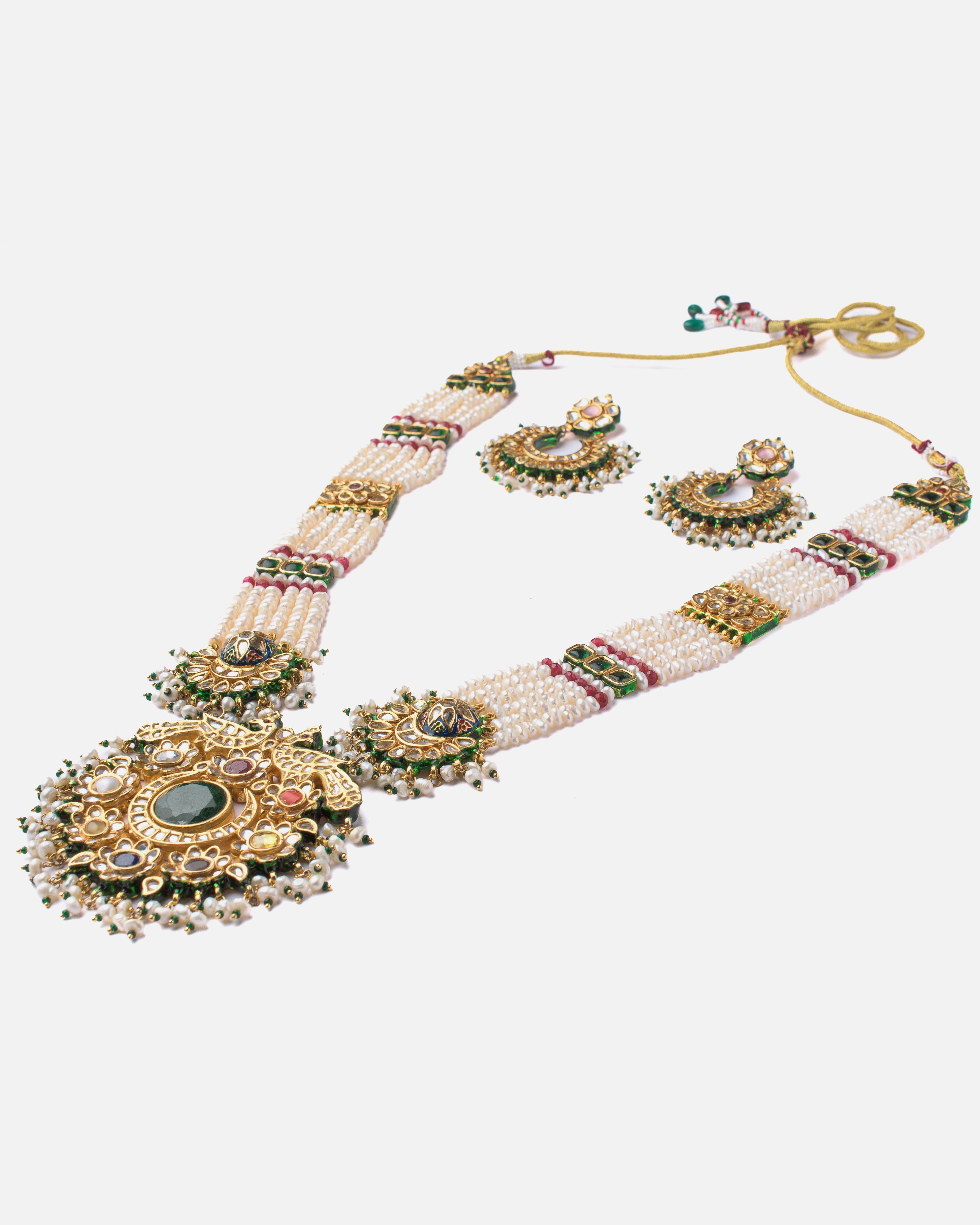 Elevate your ethnic look with this regal necklace set featuring layered pearl strands, intricate gold-toned detailing, and matching earrings. Perfect for weddings, festive occasions, and grand events.