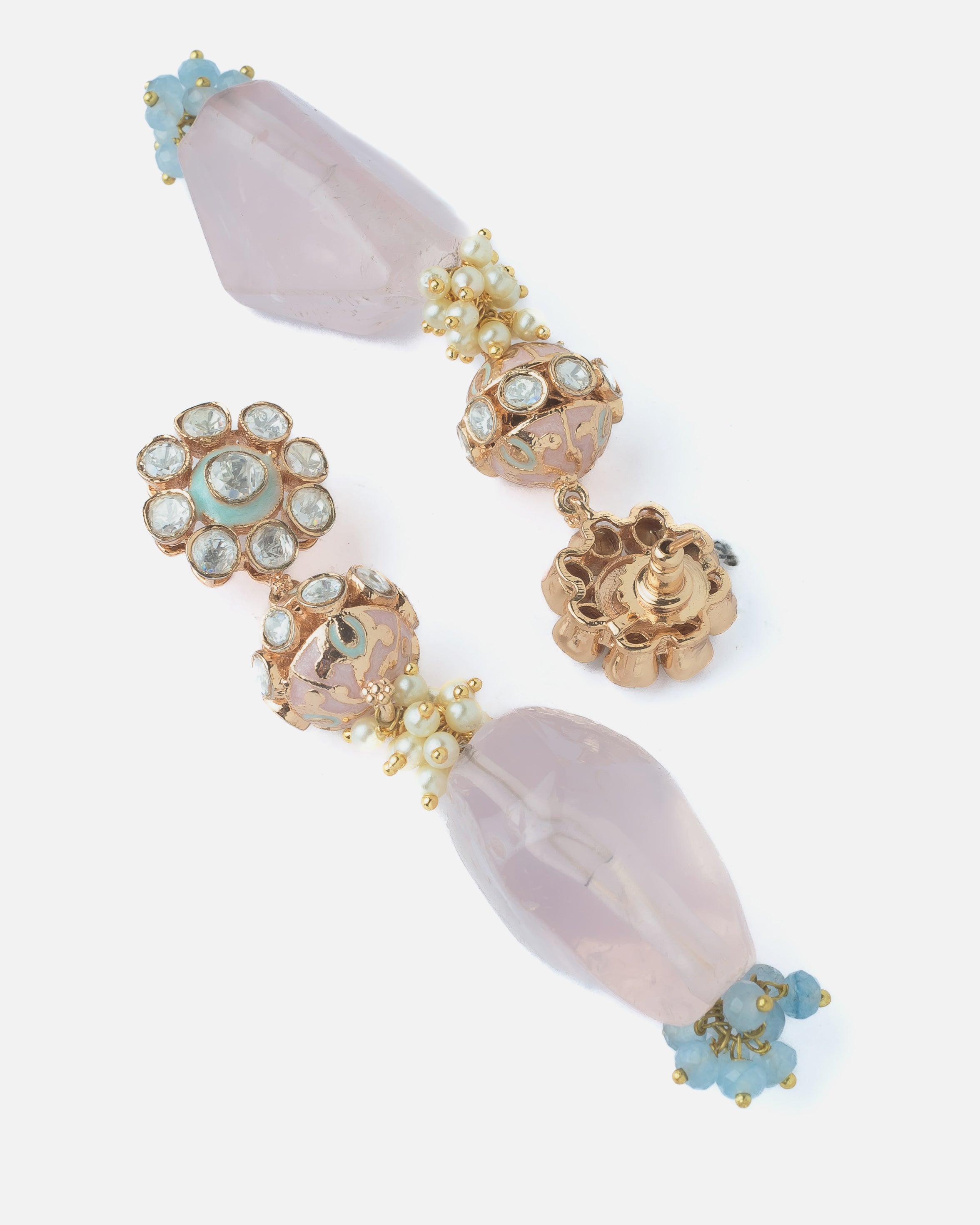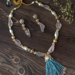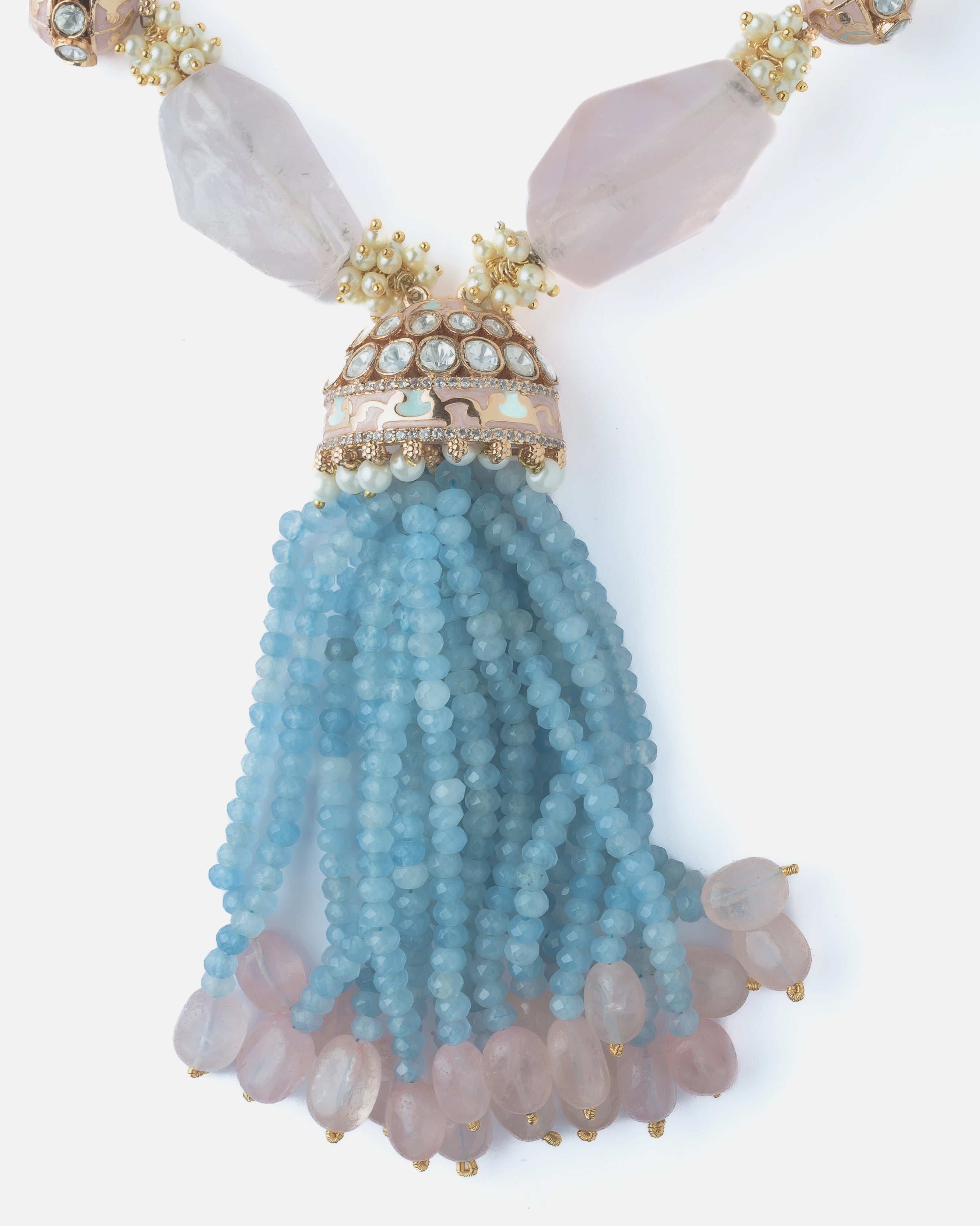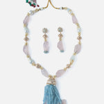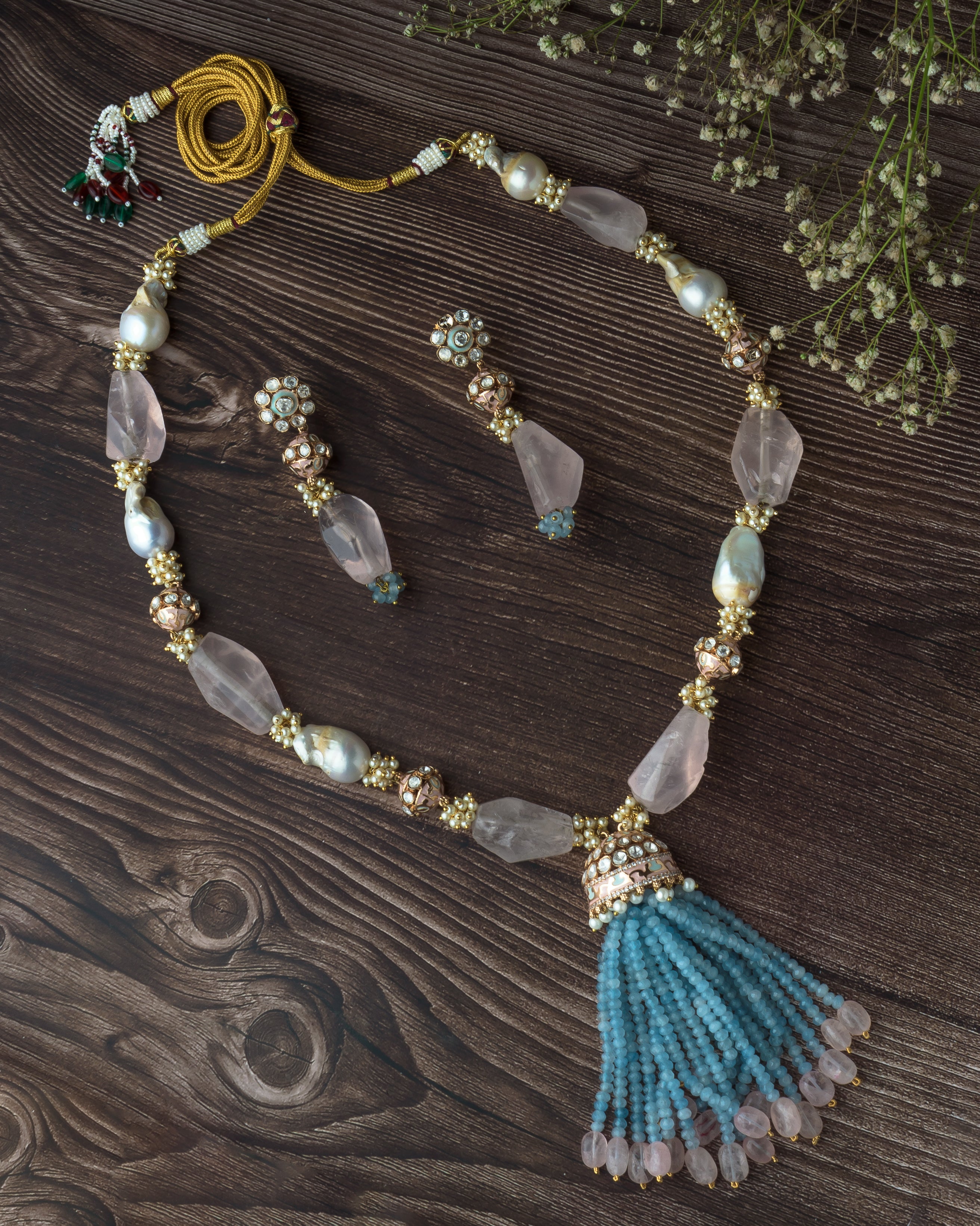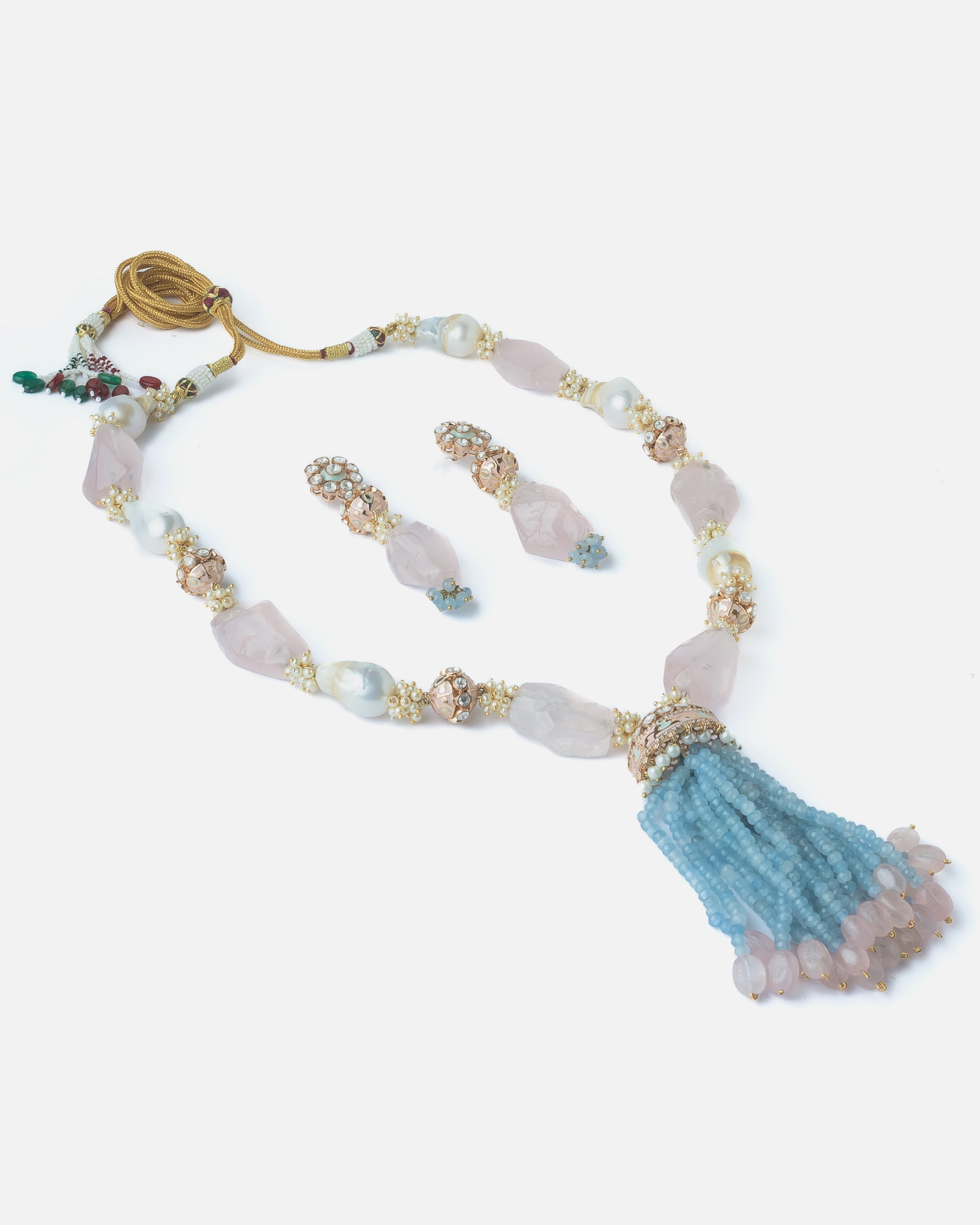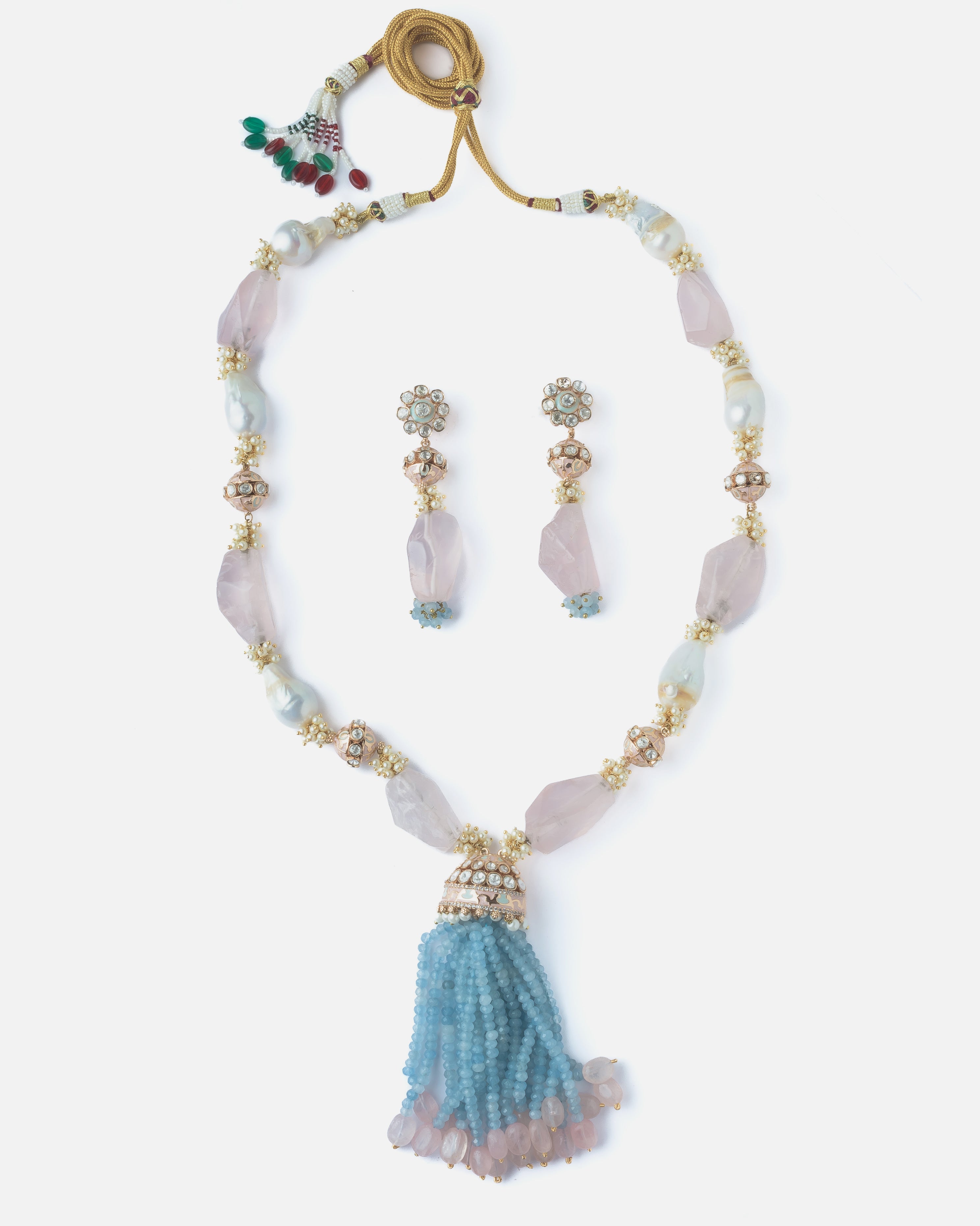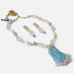 Elegant handcrafted necklace set featuring rose quartz, baroque pearls, and gold-toned beads. Accented with a vibrant blue beaded tassel and matching earrings, perfect for festive or ethnic occasions.