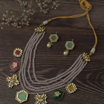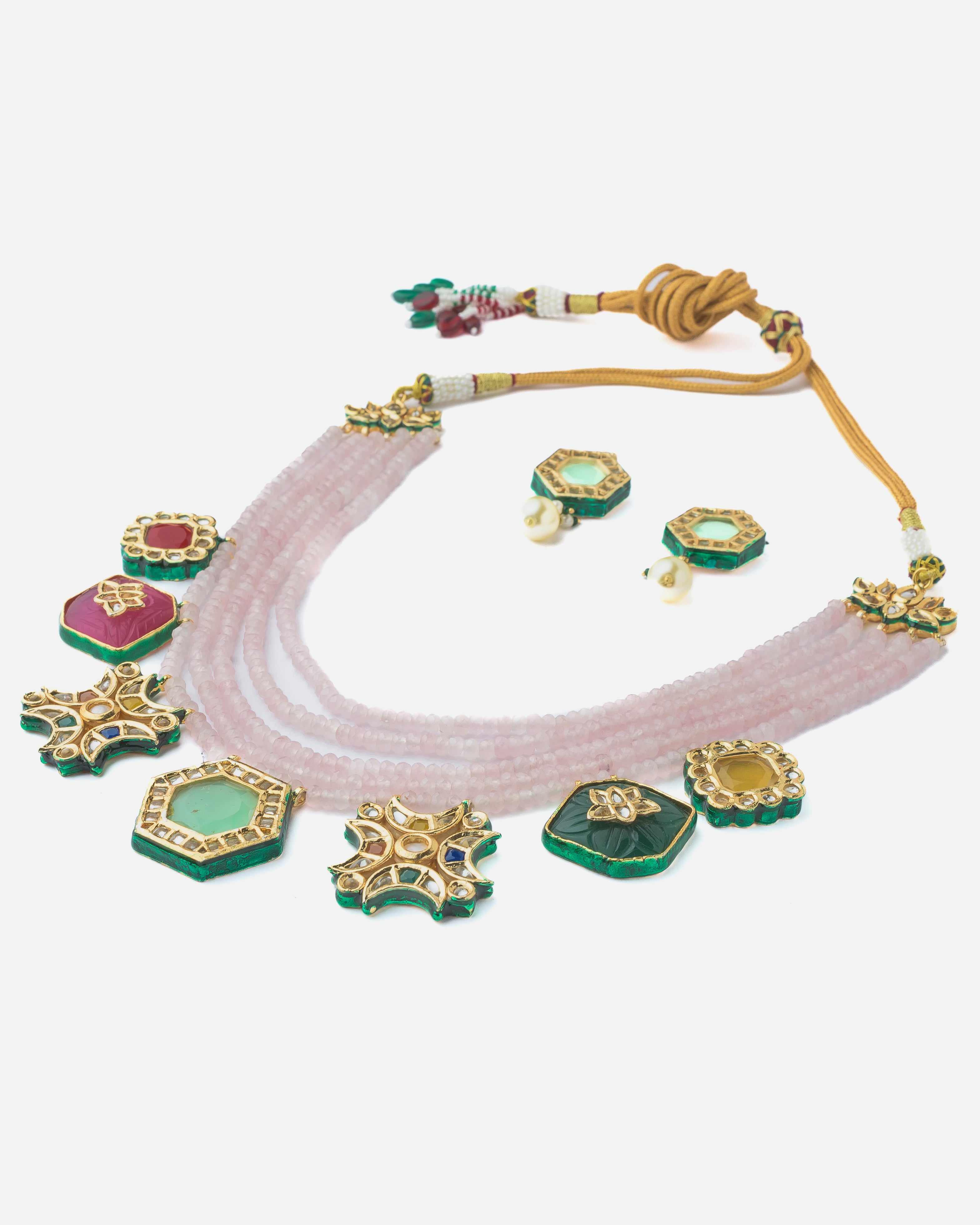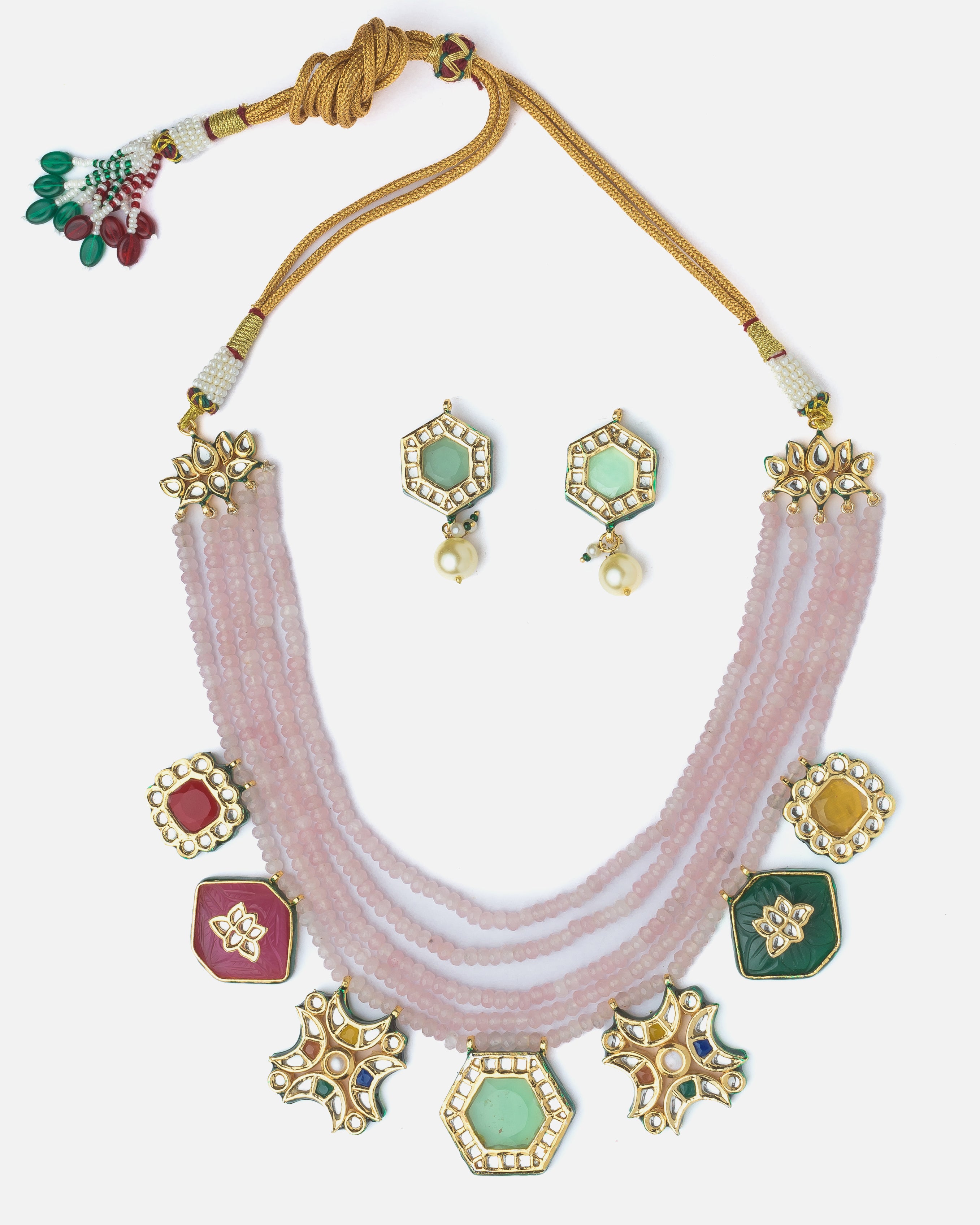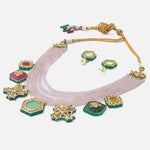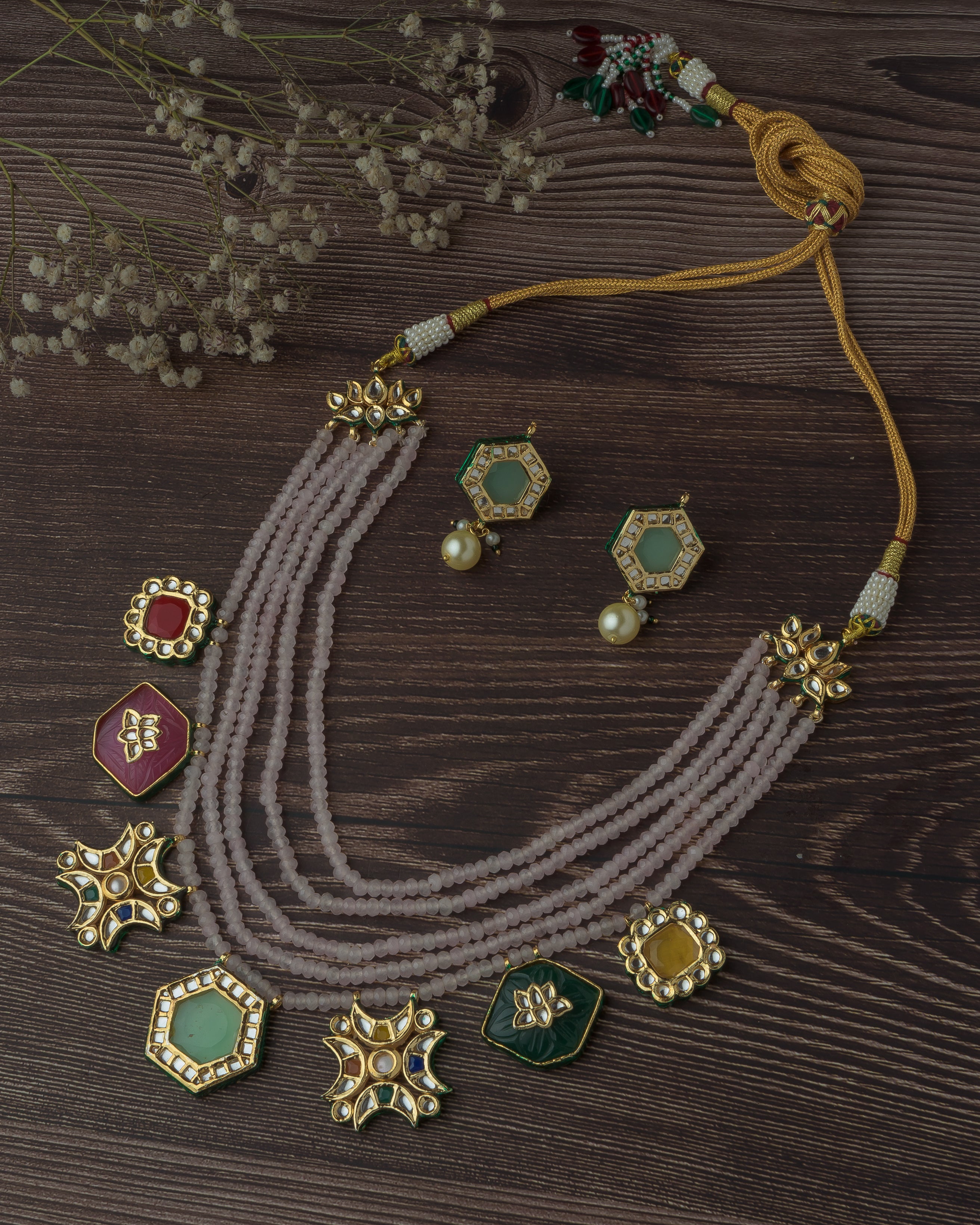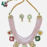 Elegant handcrafted necklace set featuring multi-strand beads and vibrant enamel pendants. Paired with matching earrings, perfect for festive and traditional occasions. Adds charm to any outfit.