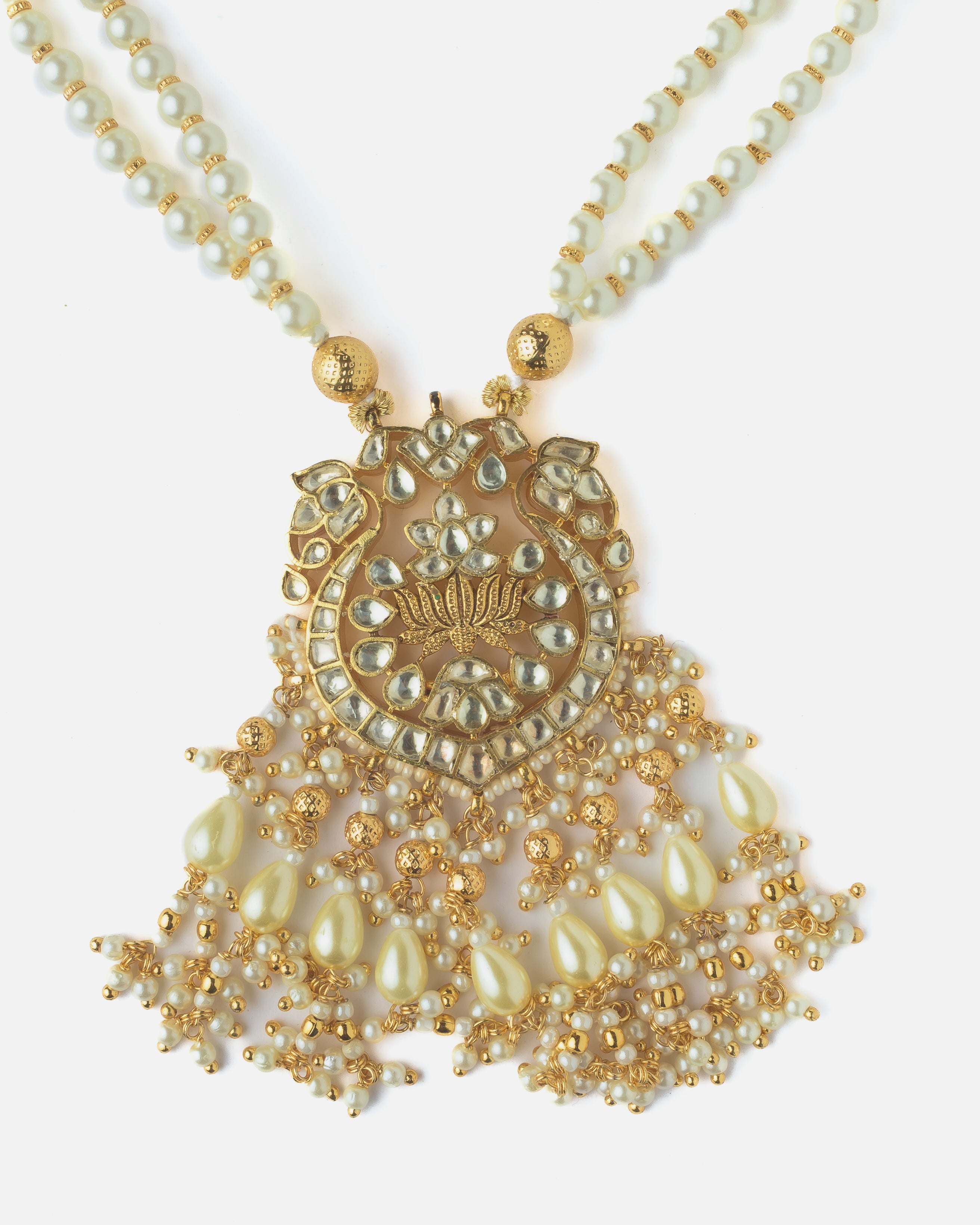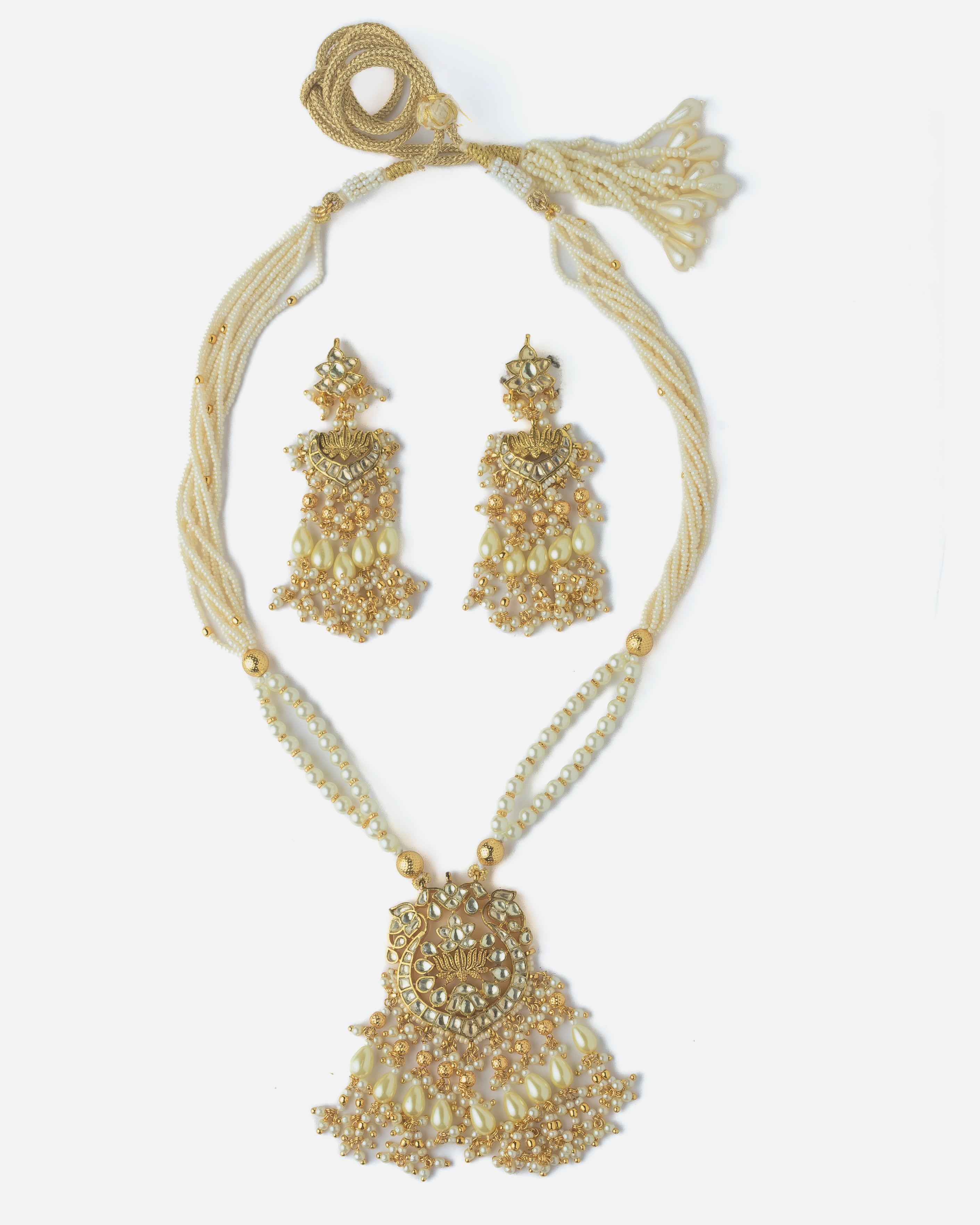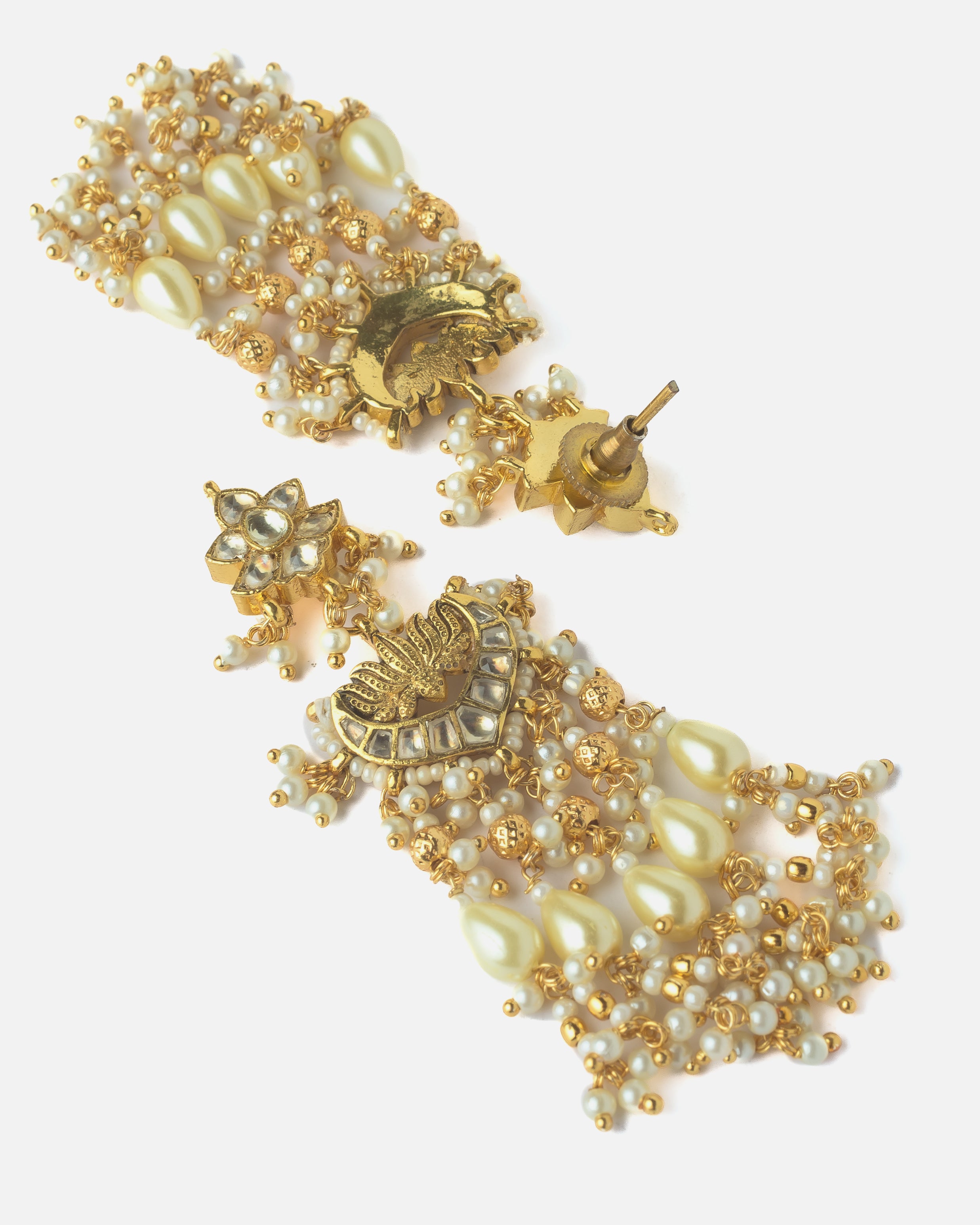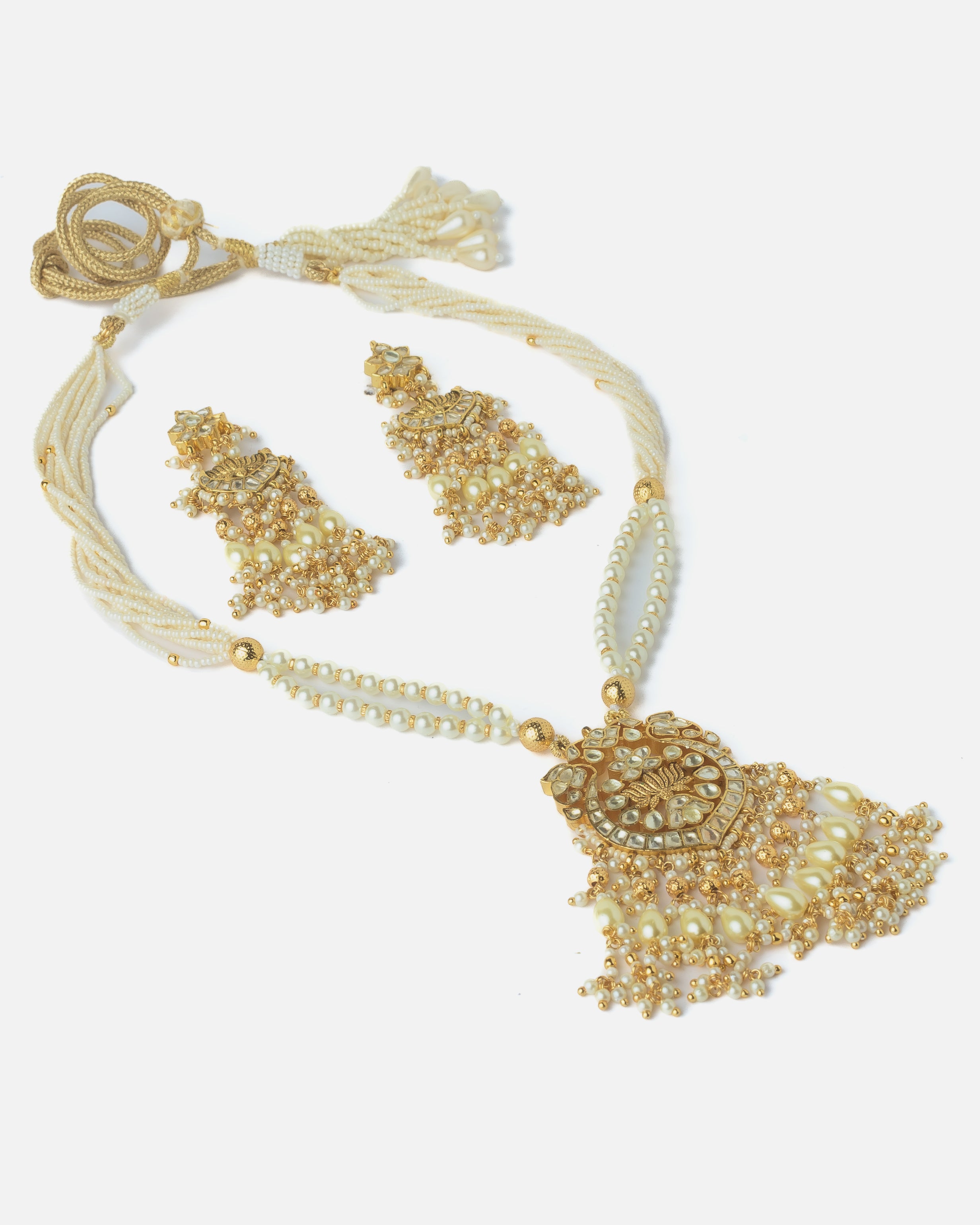 Elevate your ethnic charm with this elegant pearl-beaded necklace set, featuring a detailed peacock pendant and matching earrings. Perfect for weddings, festivals, and traditional celebrations.