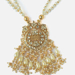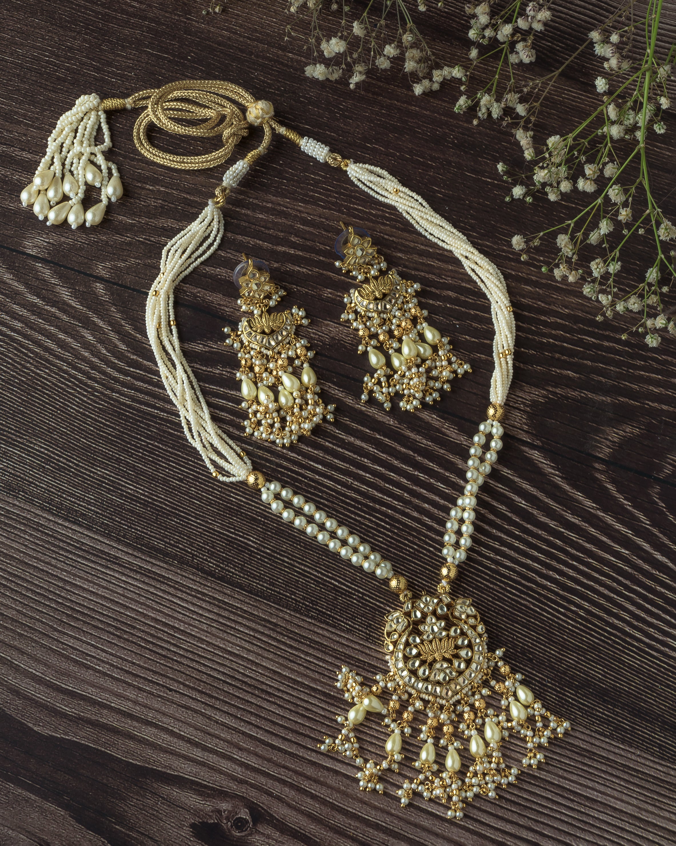 Gold Plated White Womens Pearl Long Necklace Set with Pair of Earrings