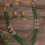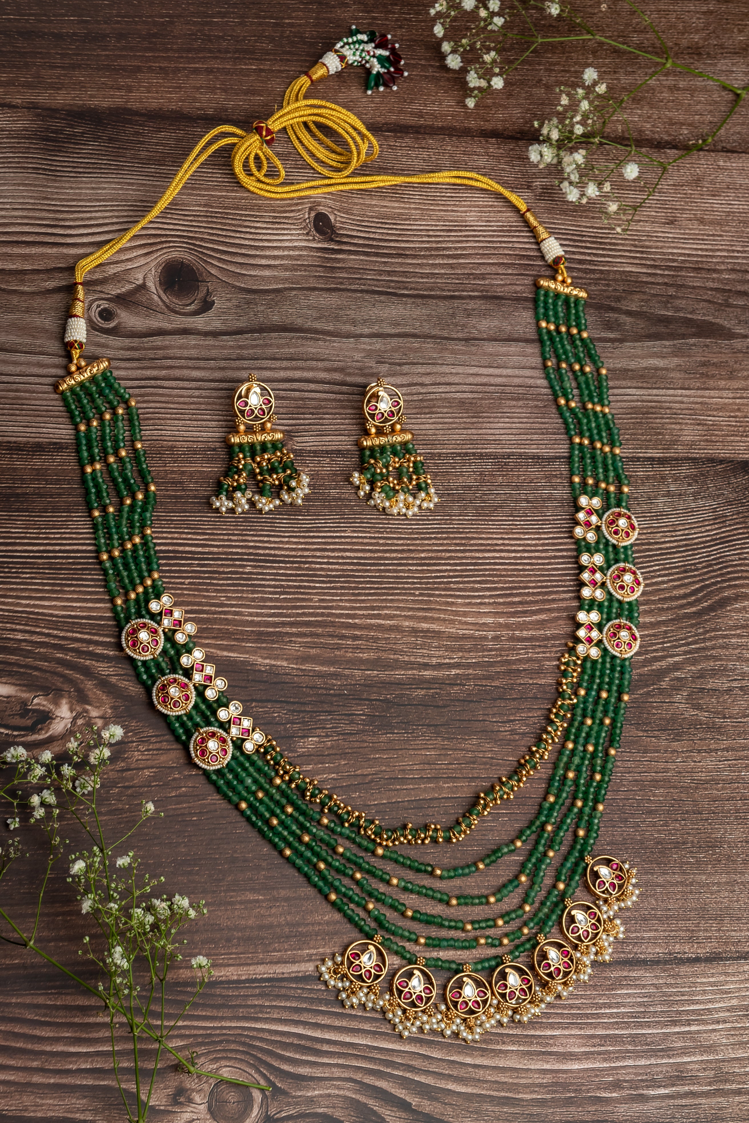 A stunning green beaded necklace with intricate gold and gemstone accents, paired with matching chandelier earrings. Perfect for traditional or festive occasions, blending elegance with cultural charm.