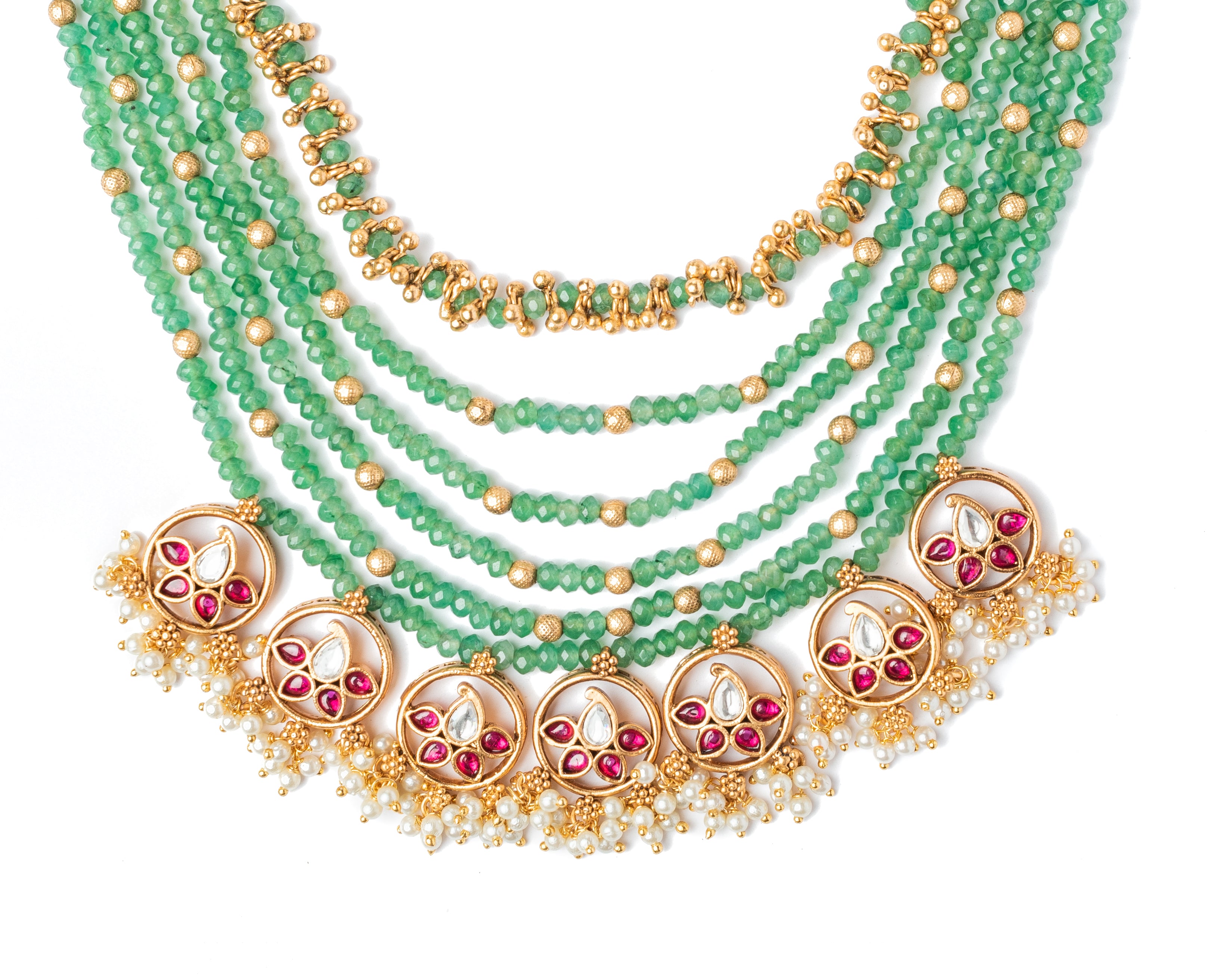 - Elegant Design: Multi-layered green beaded necklace with gold-tone accents and intricate detailing.