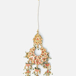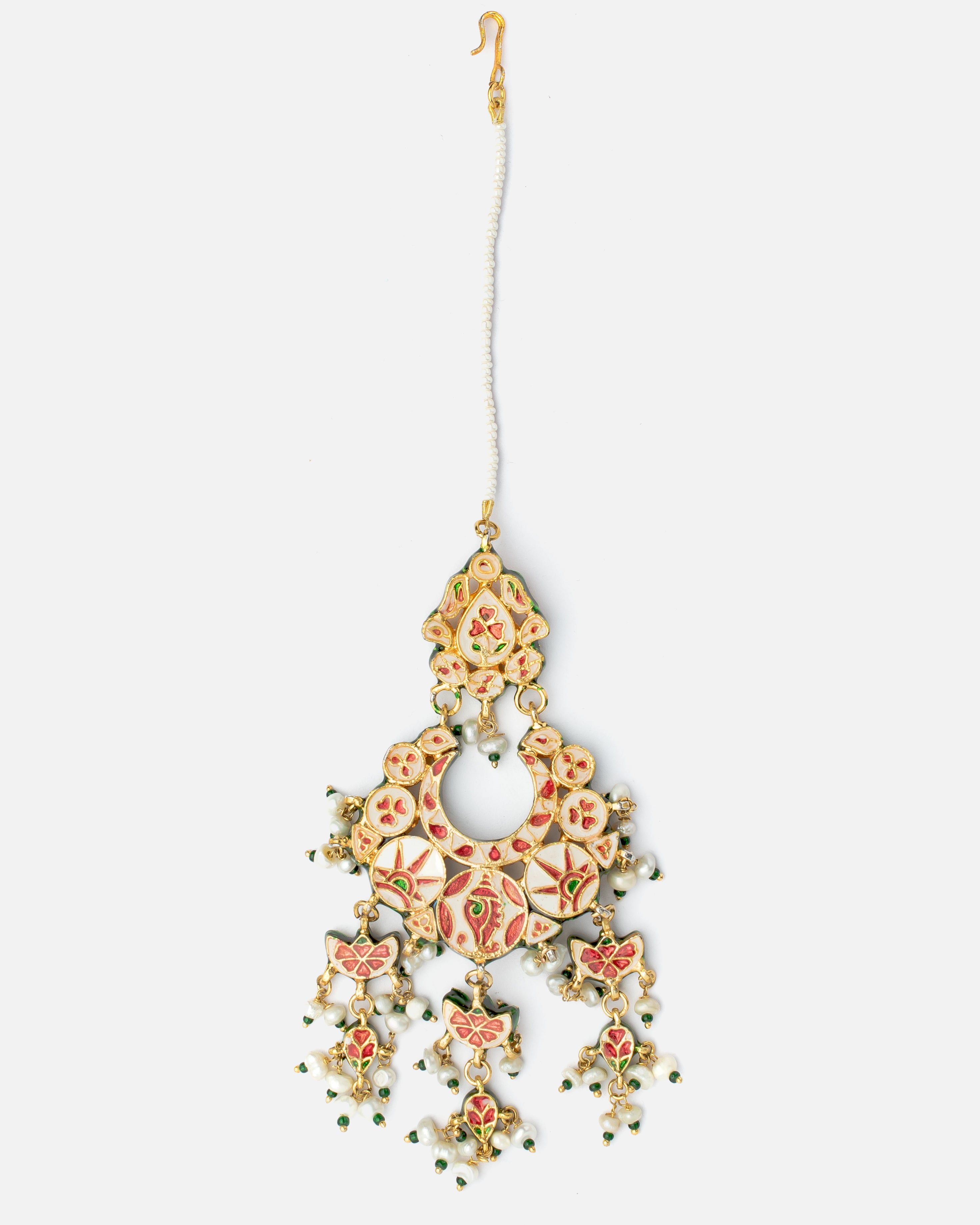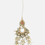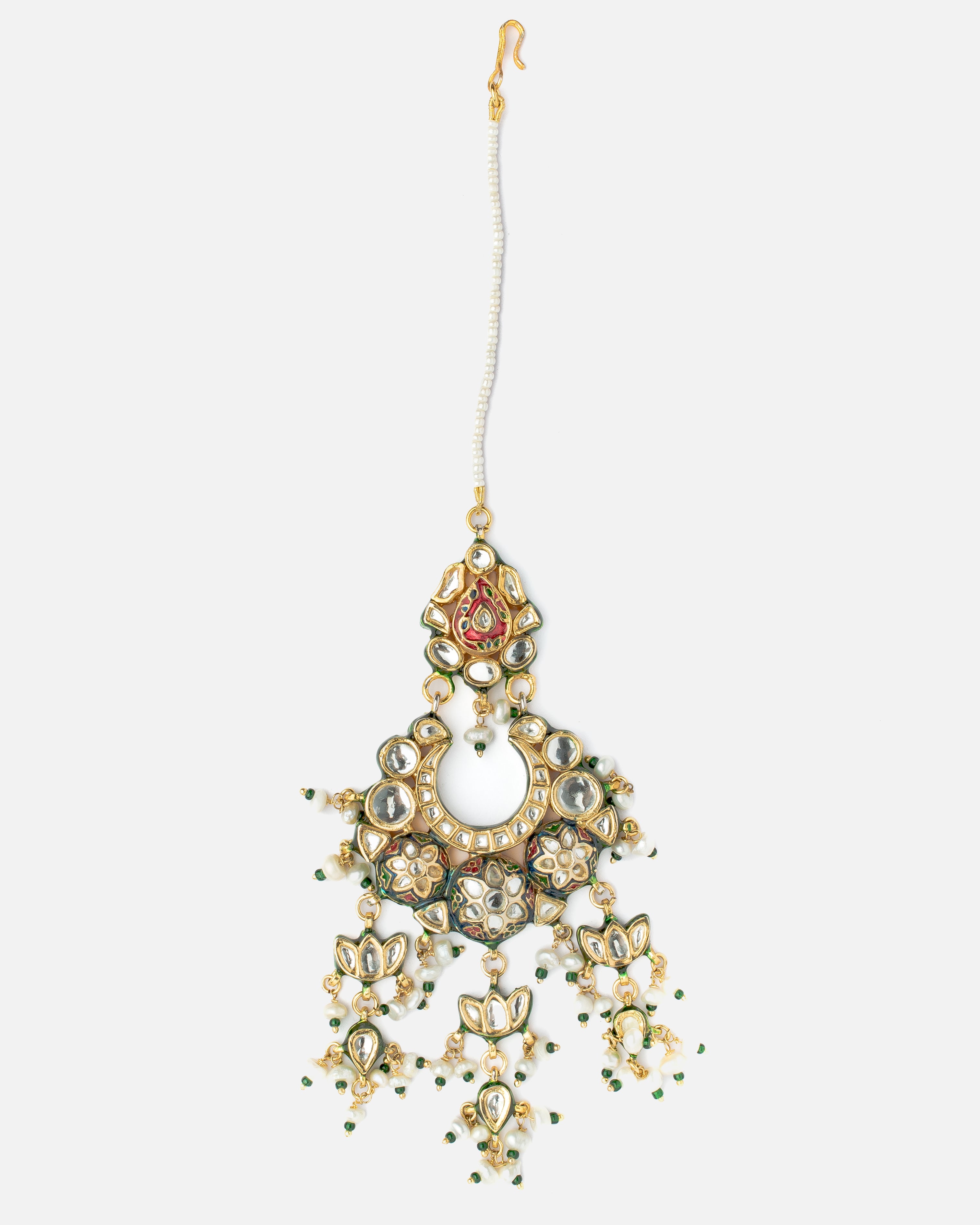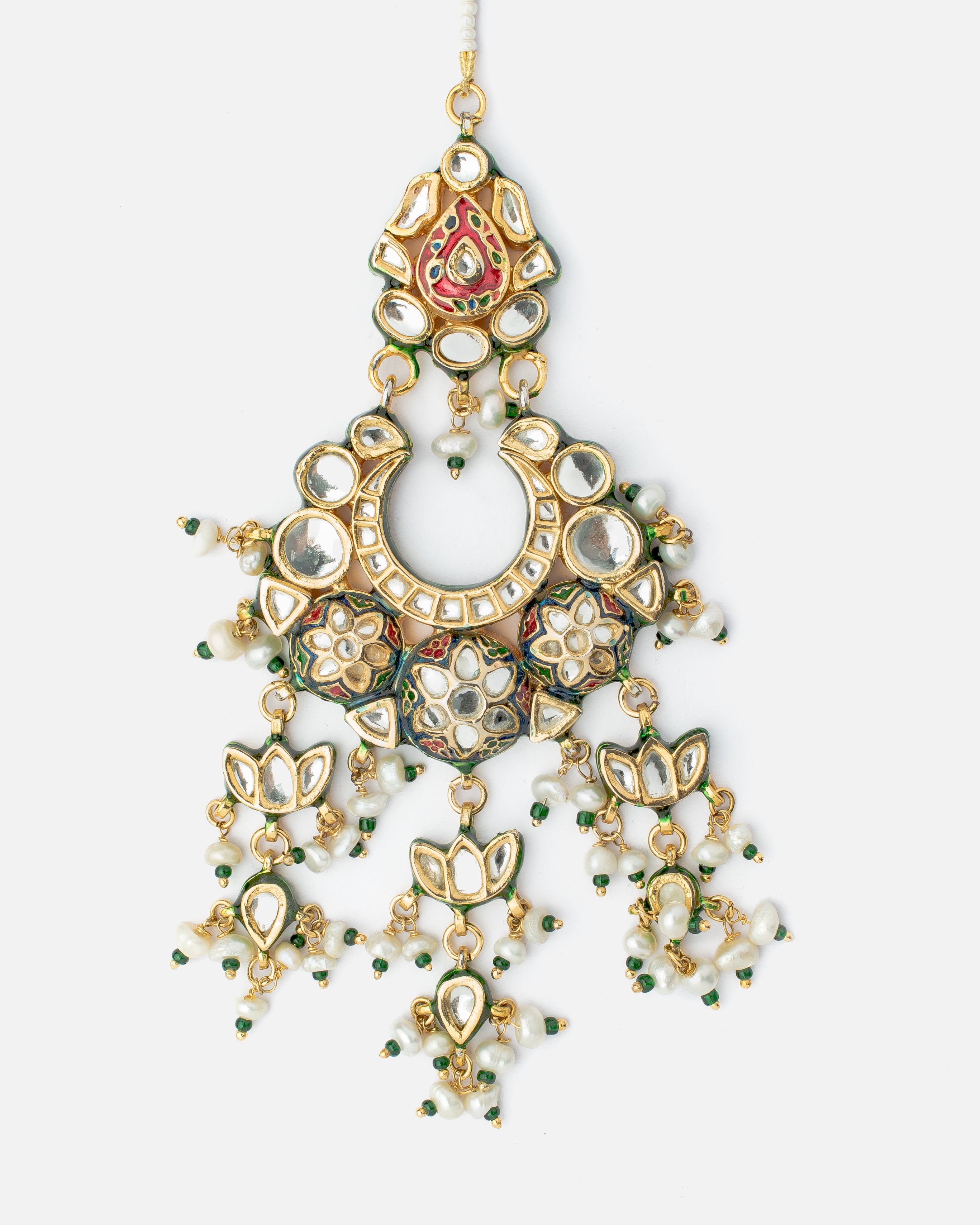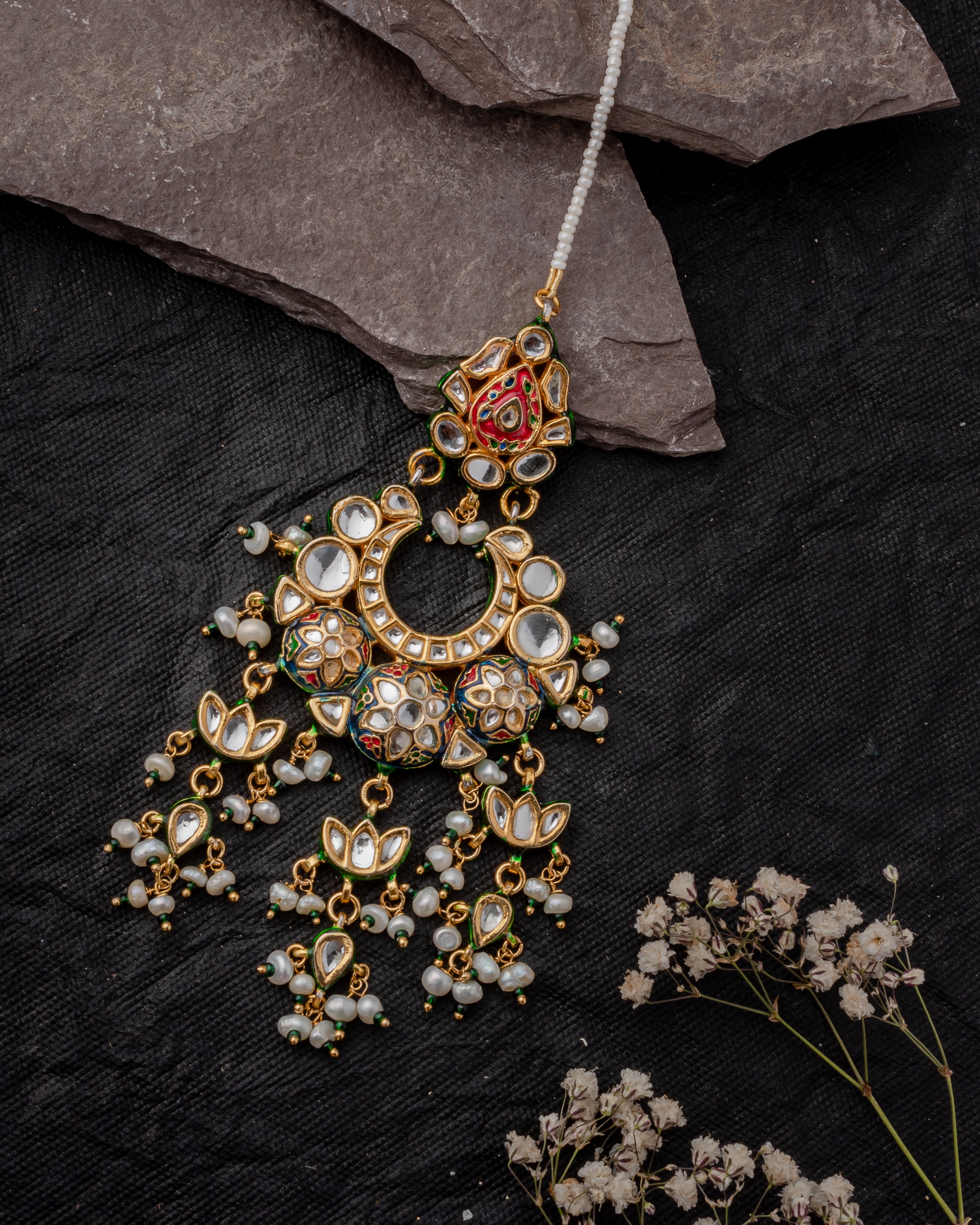 Elevate your bridal charm with this exquisite maangtikaa, showcasing intricate Kundan work, colorful accents, and delicate pearl detailing. Perfect for adding a royal and elegant touch to your special day ensemble.