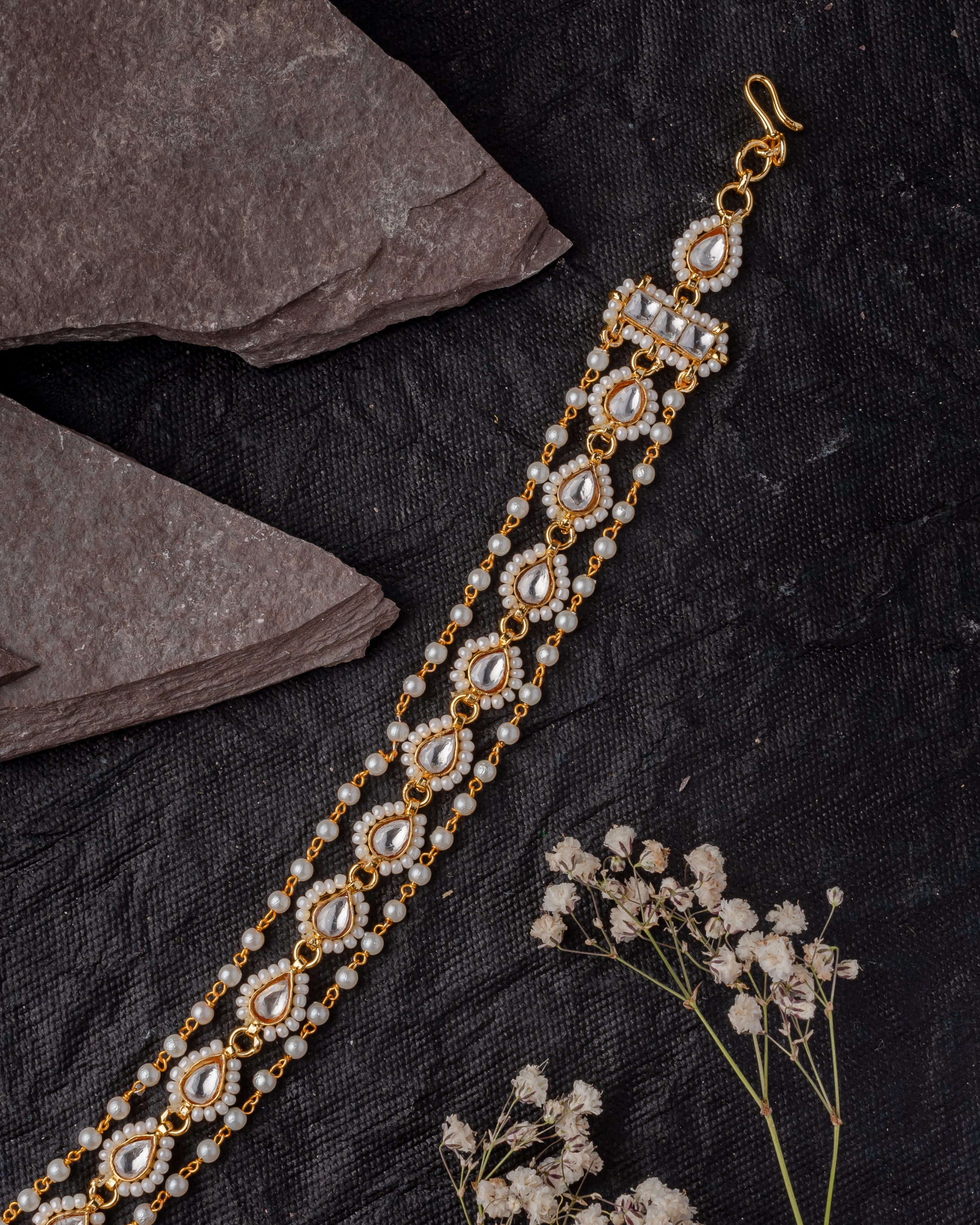 Elevate your bridal charm with this elegant Maathapatti featuring intricate pearl and Kundan detailing. A timeless accessory, perfect for weddings and festive occasions, offering a touch of royal sophistication.