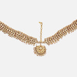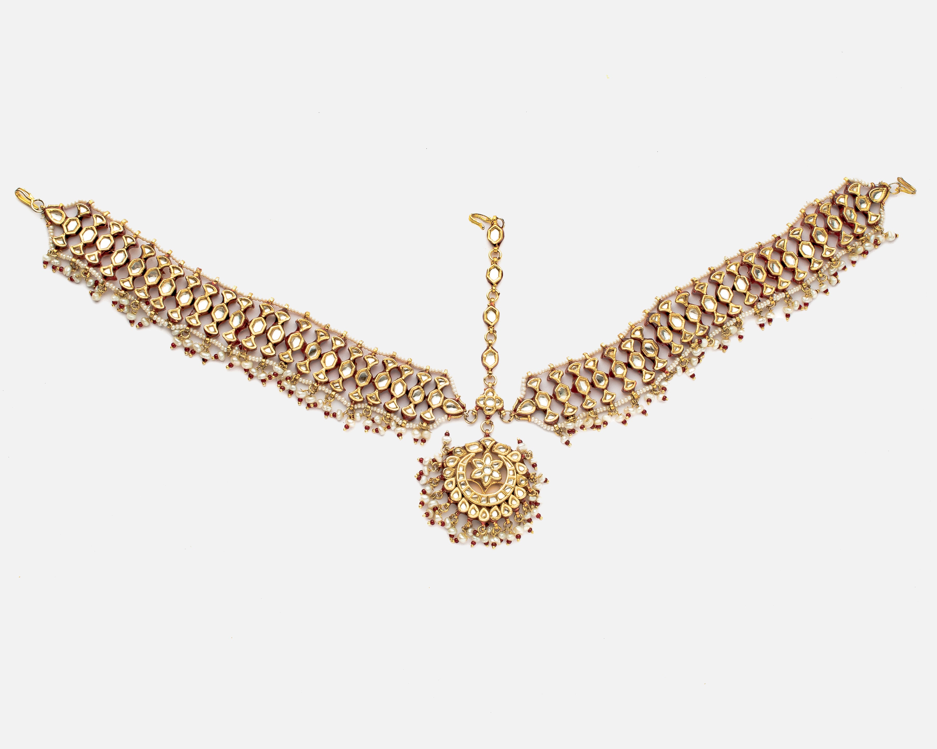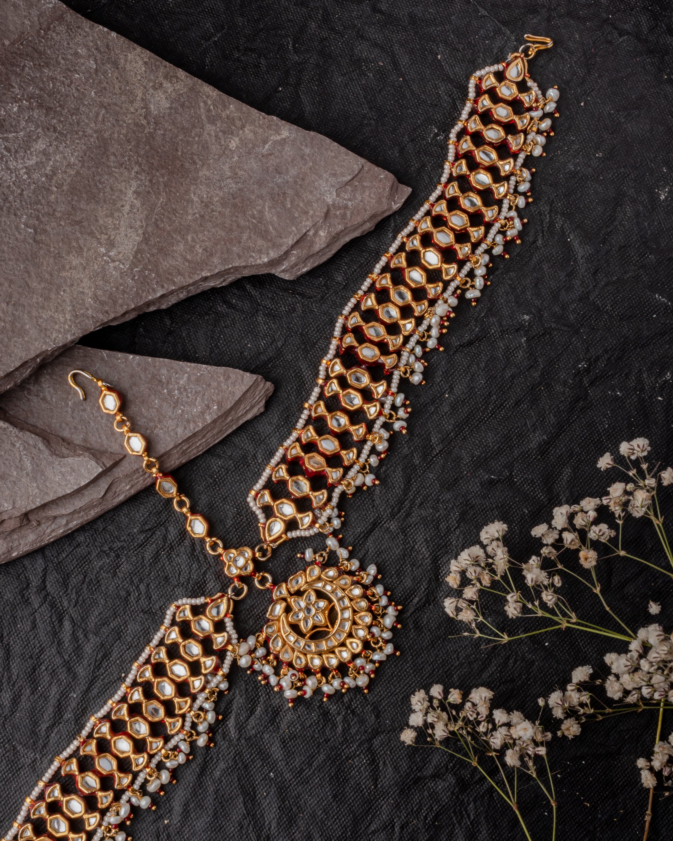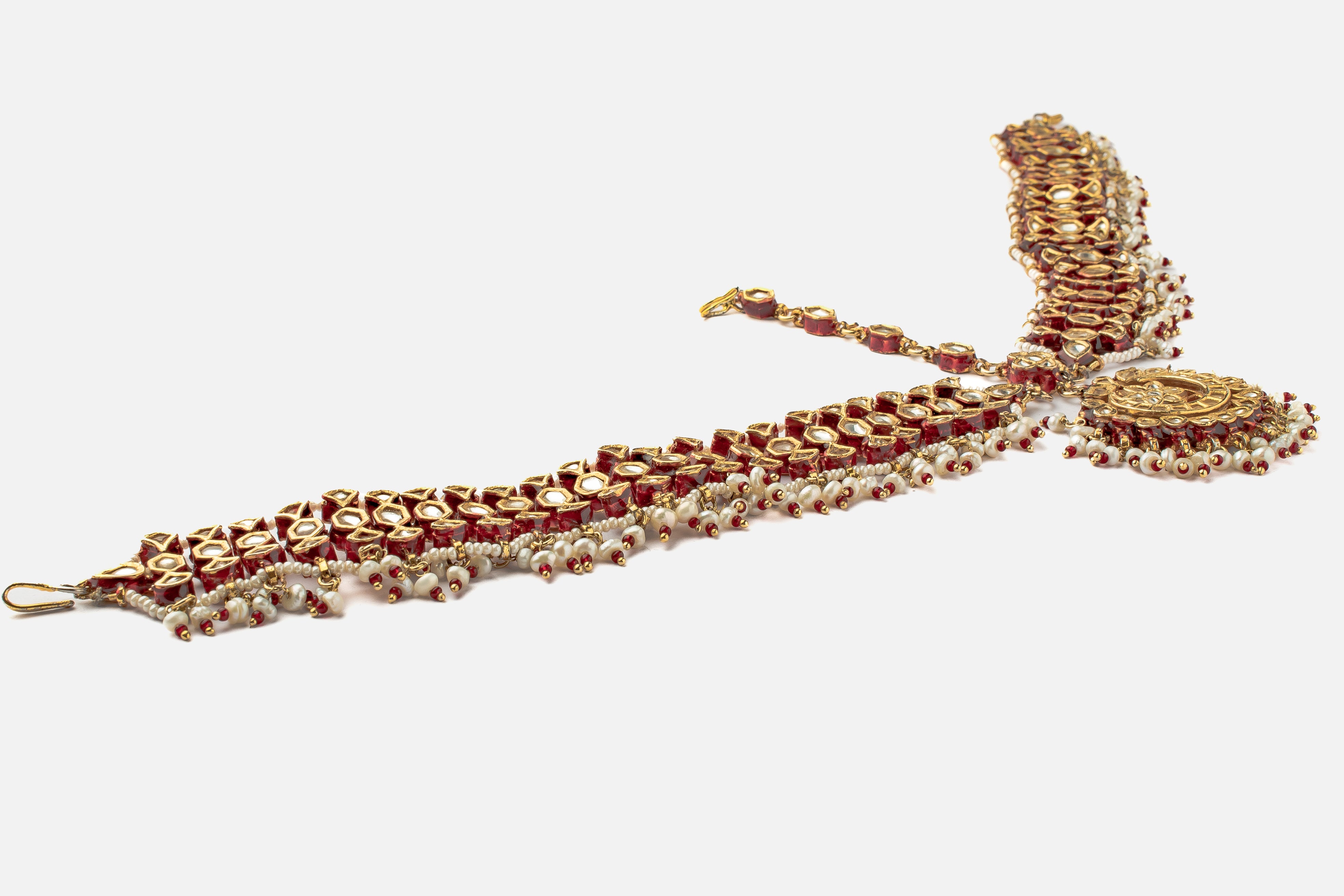 Elegant gold-tone matha patti with intricate Kundan work, red enamel detailing, and pearl embellishments. A perfect blend of tradition and luxury, ideal for bridal or festive wear, enhancing your regal look.