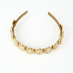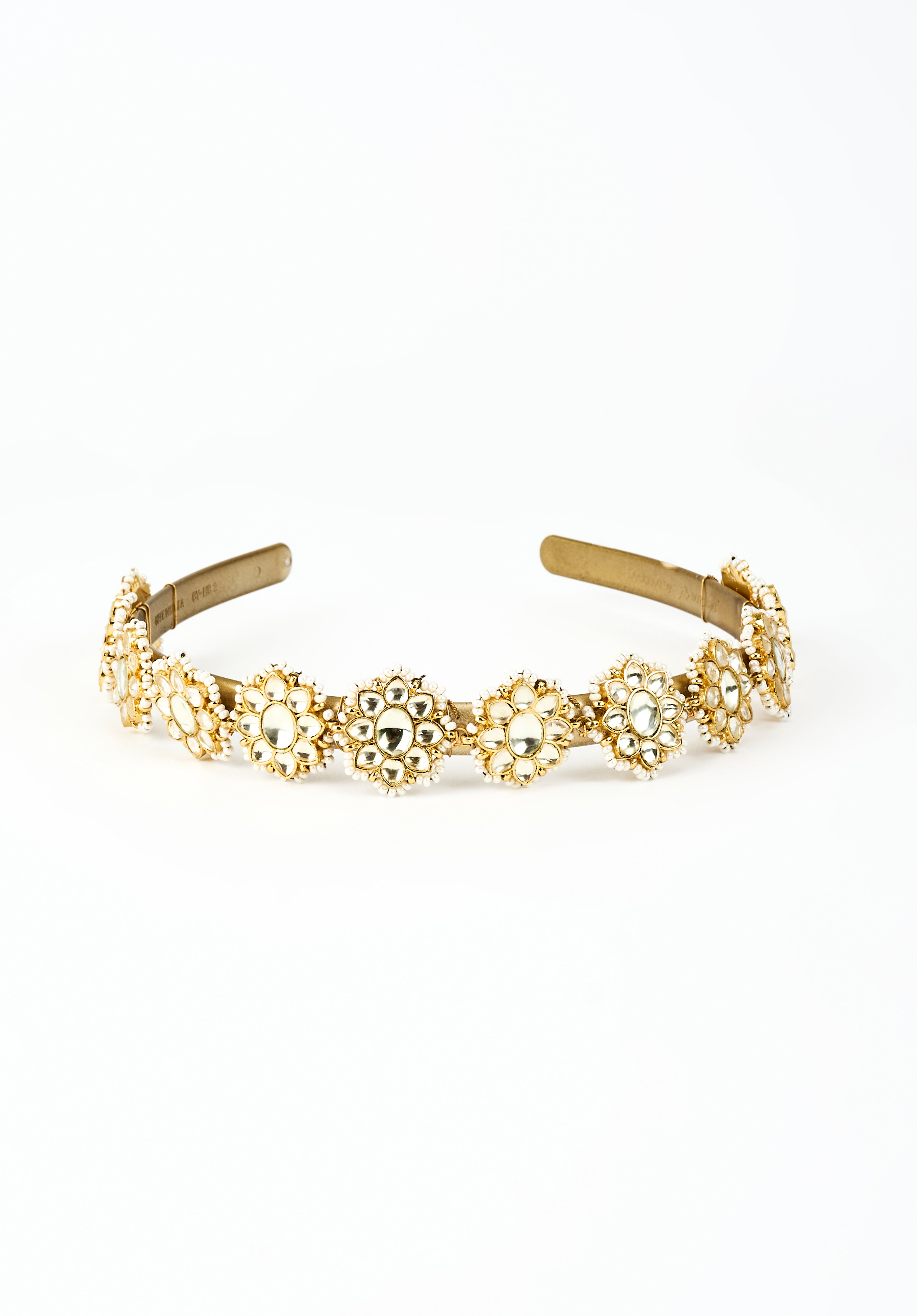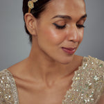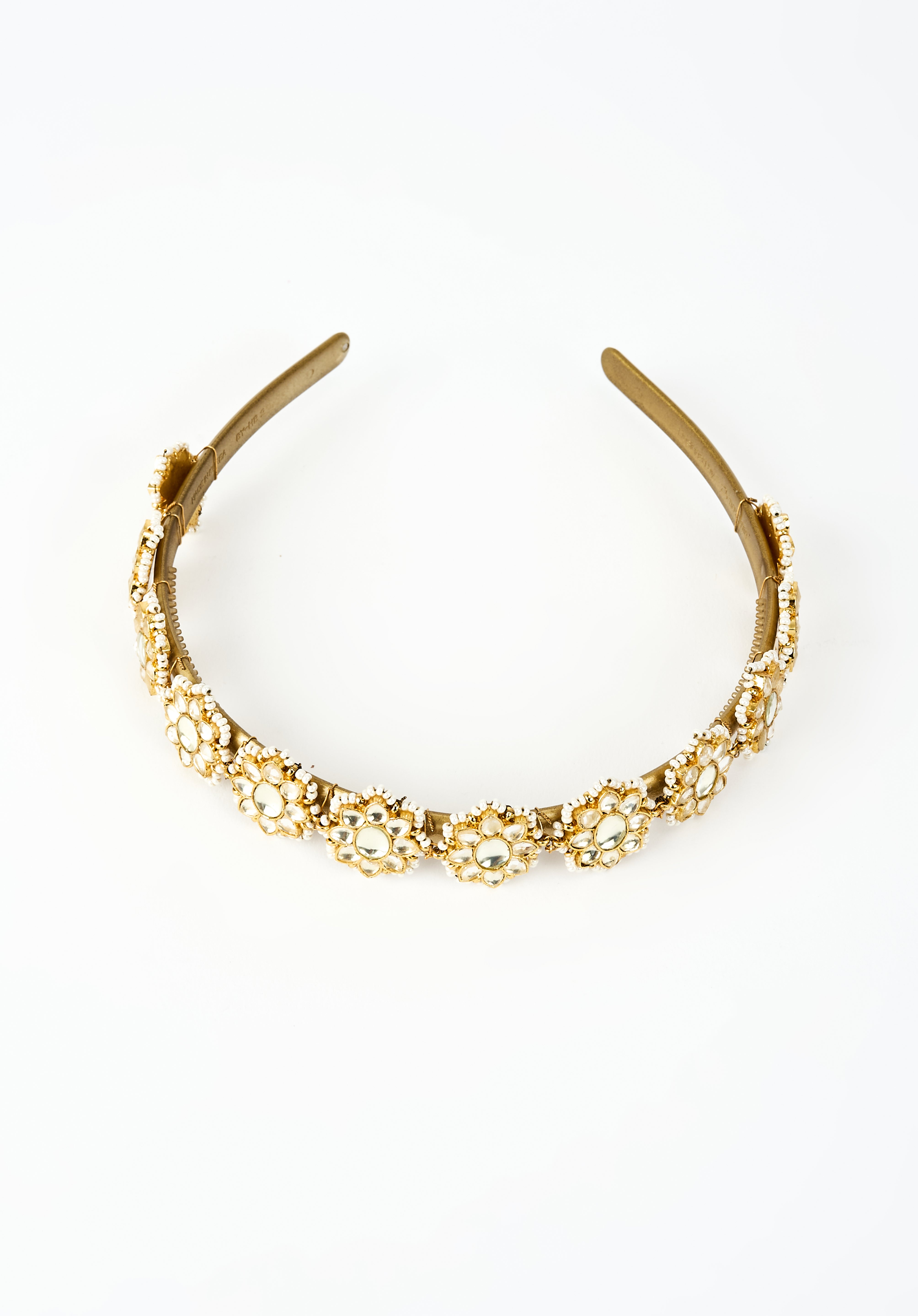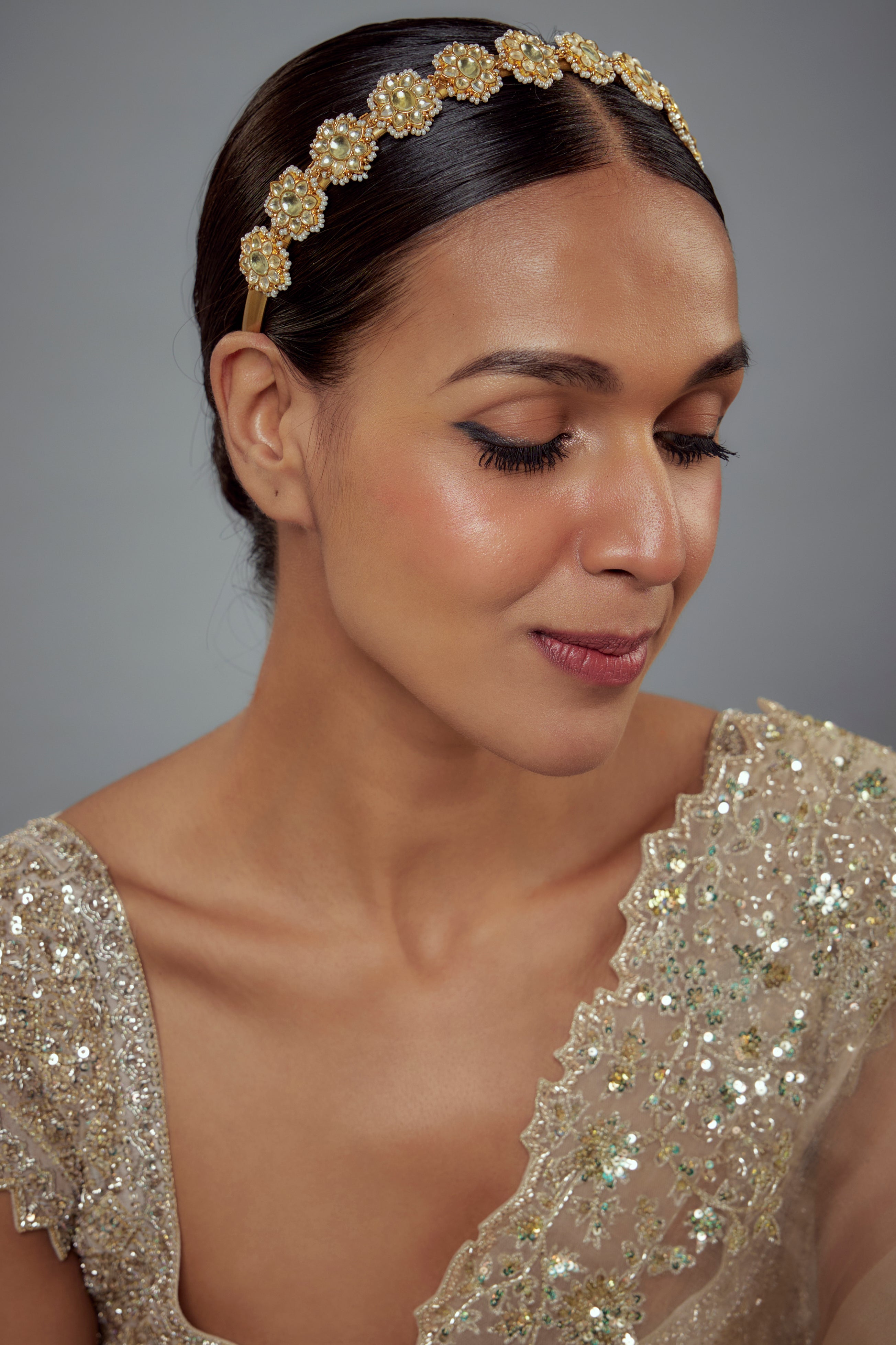 Enhance your elegance with this handcrafted floral headband adorned with intricate pearl & gold detailing.Perfect for wedding or festive occasion,it blend traditional charm with modern sophistication.