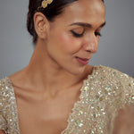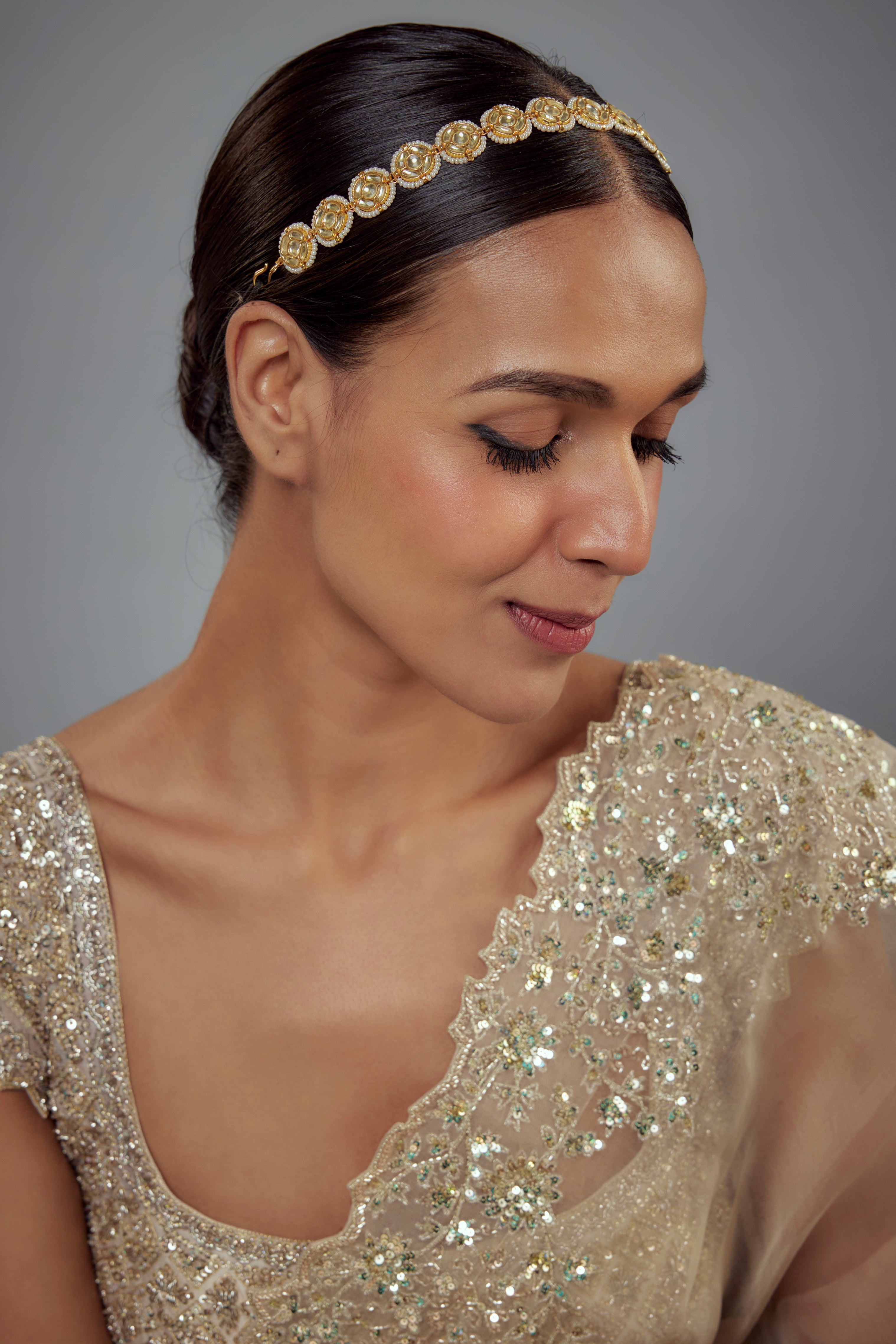 A stunning gold-embellished headband paired with a sequined saree blouse, exuding elegance & sophistication. Perfect for weddings, festive occasions or evening events to elevate style effortlessly.