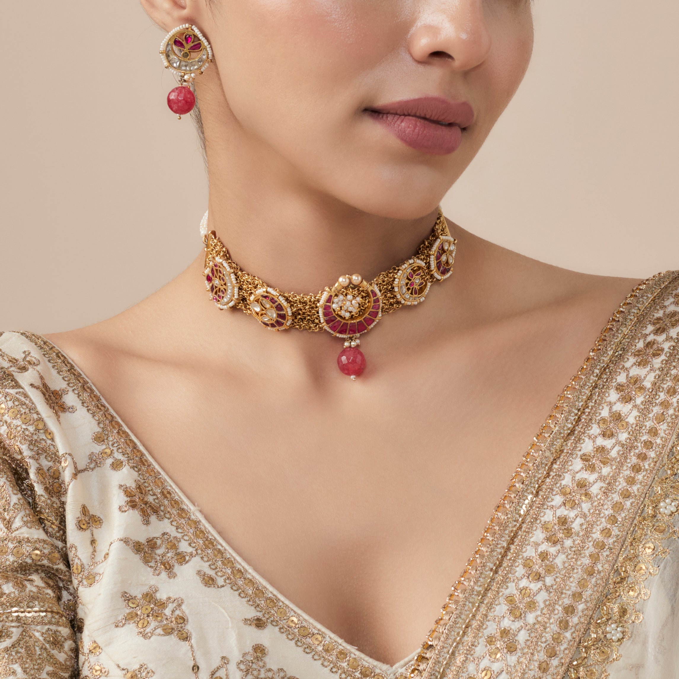 Morpankh Gold Plated Pink Womens Beaded Choker Necklace Set with Pair of Earrings