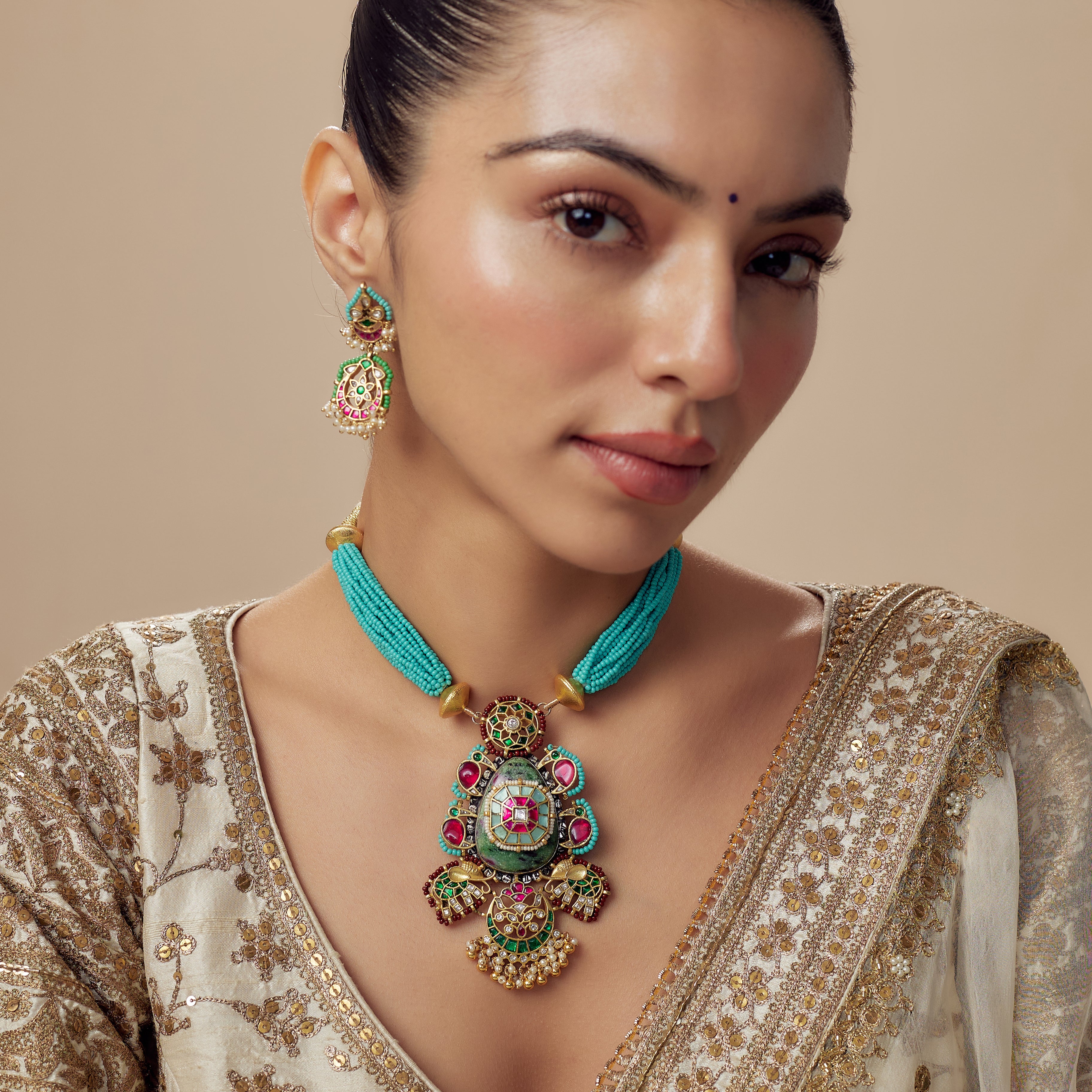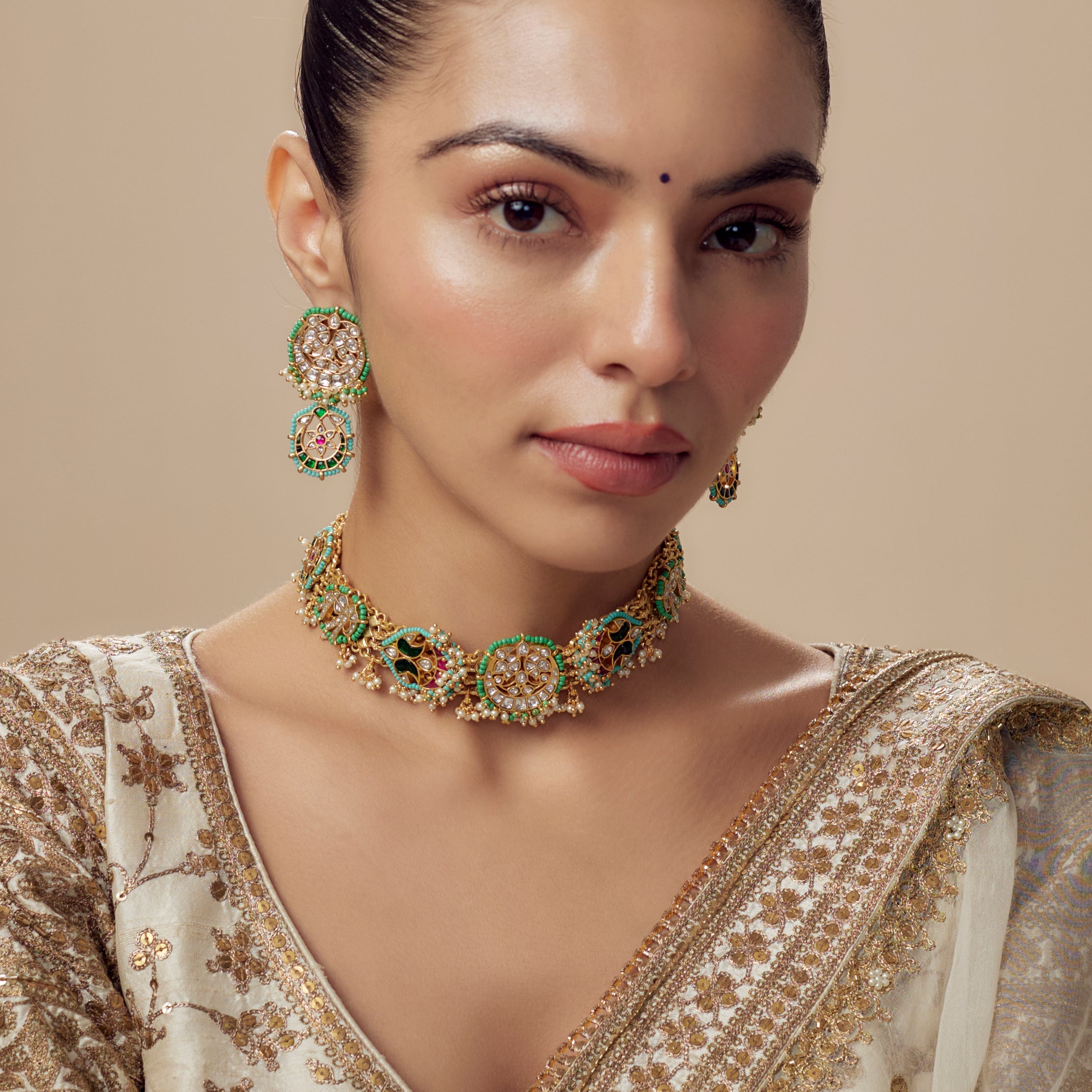Morpankh Gold Plated Green Womens Beaded Choker Necklace Set with Pair of Earrings (Freesize)