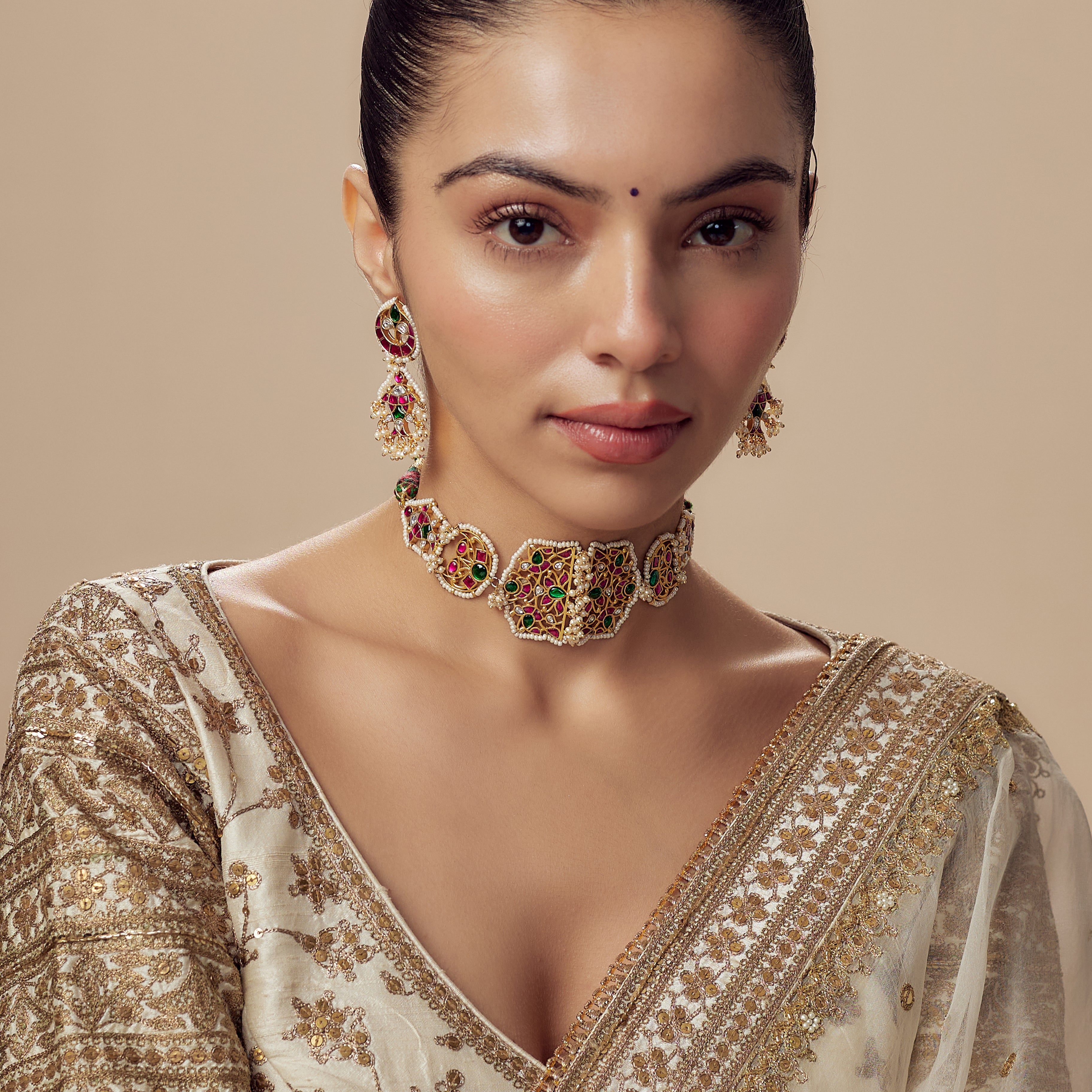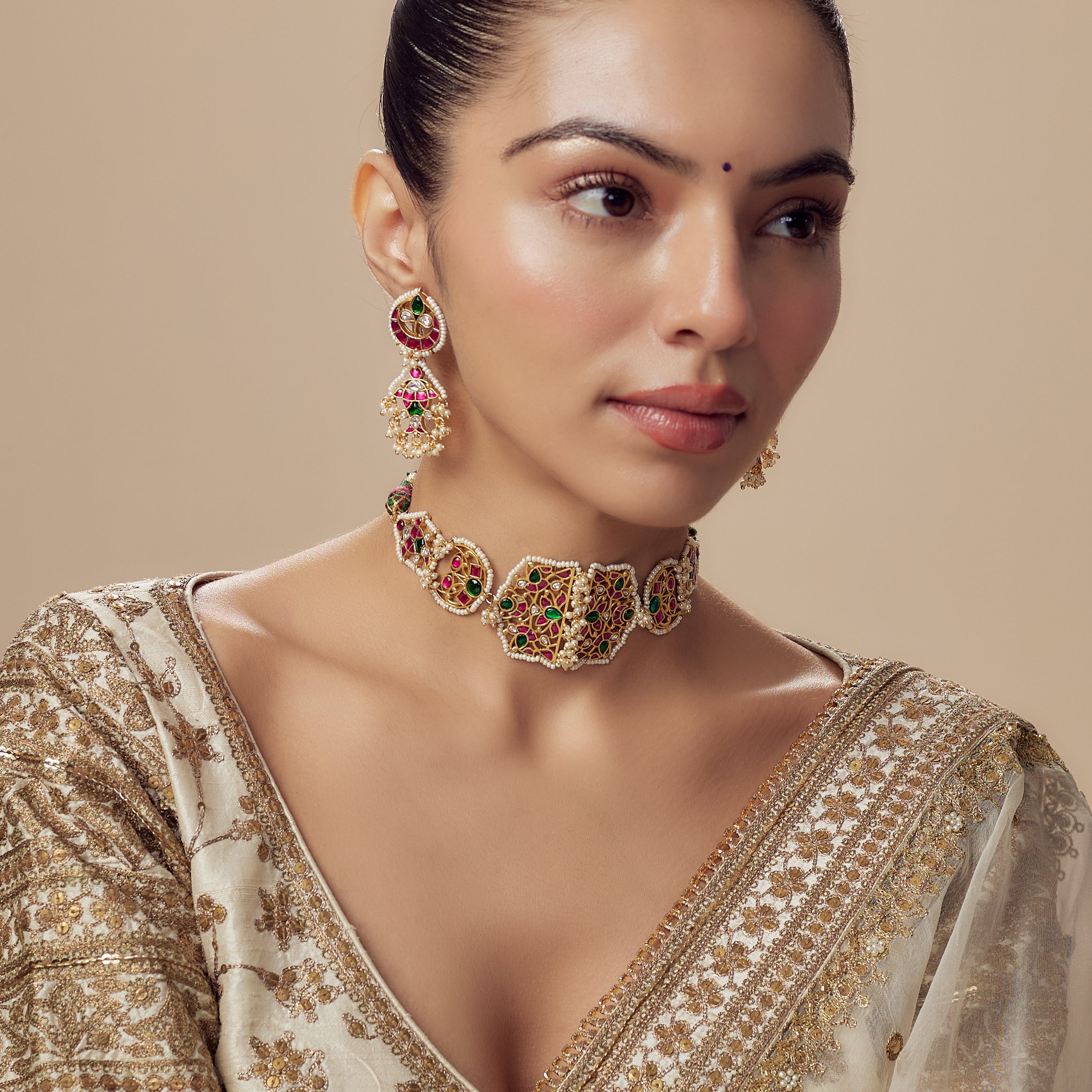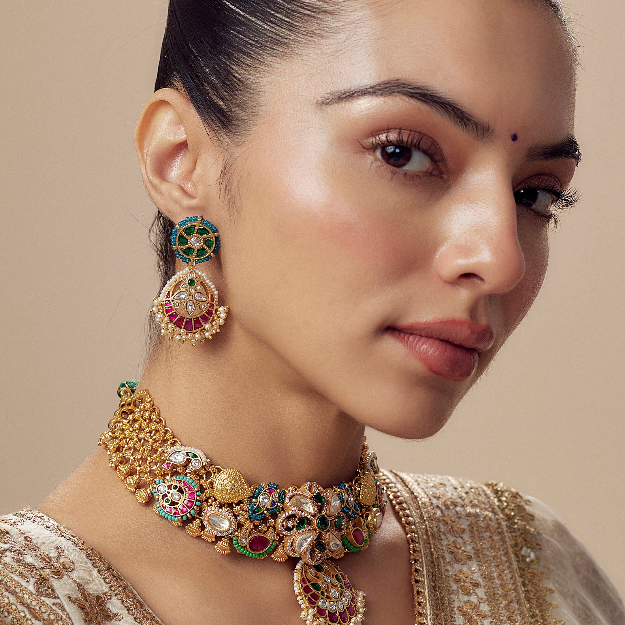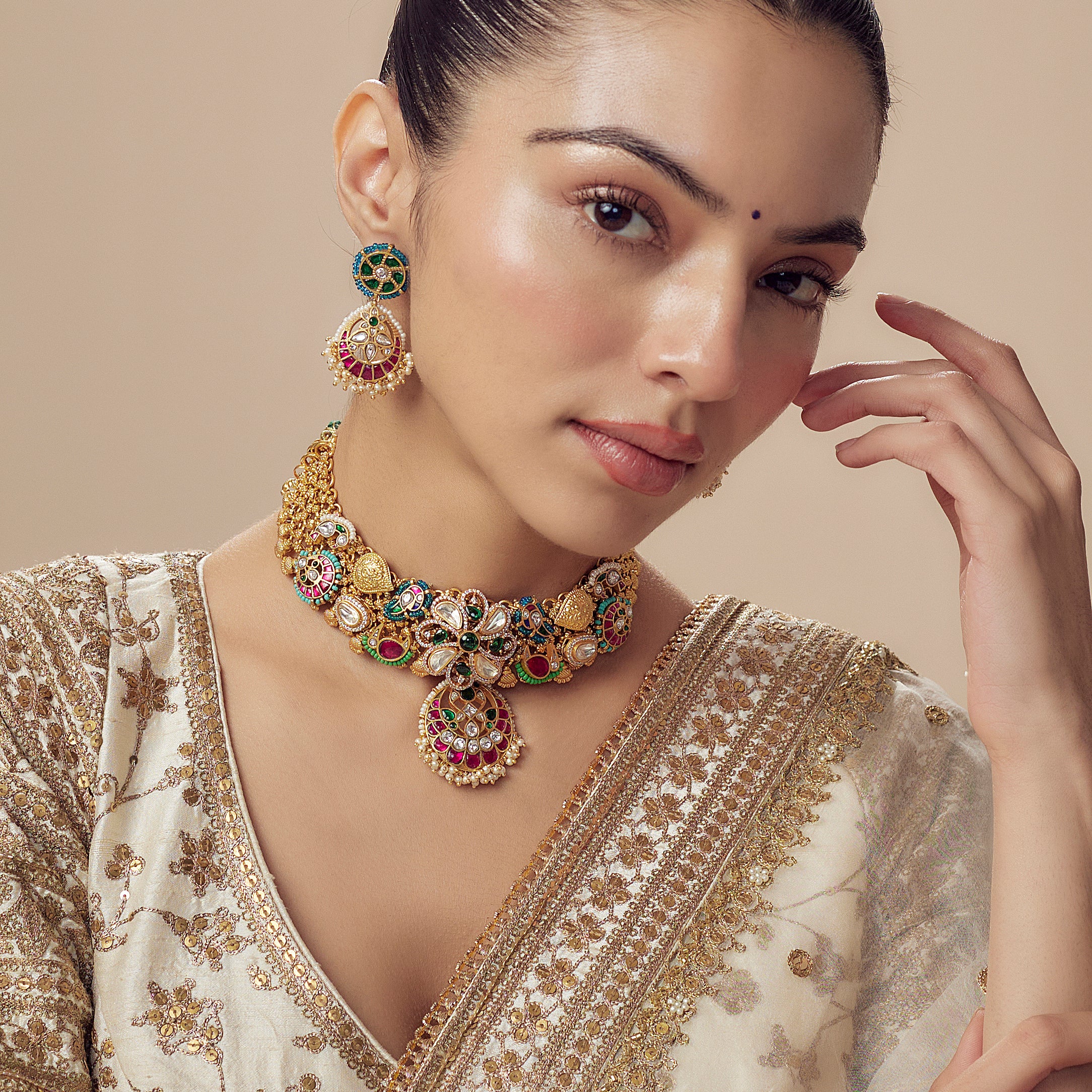 Morpankh Gold Plated Multicolored Womens Kundan, Polki Choker Necklace Set with Pair of Earrings (Freesize)