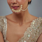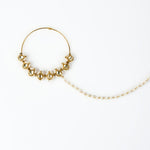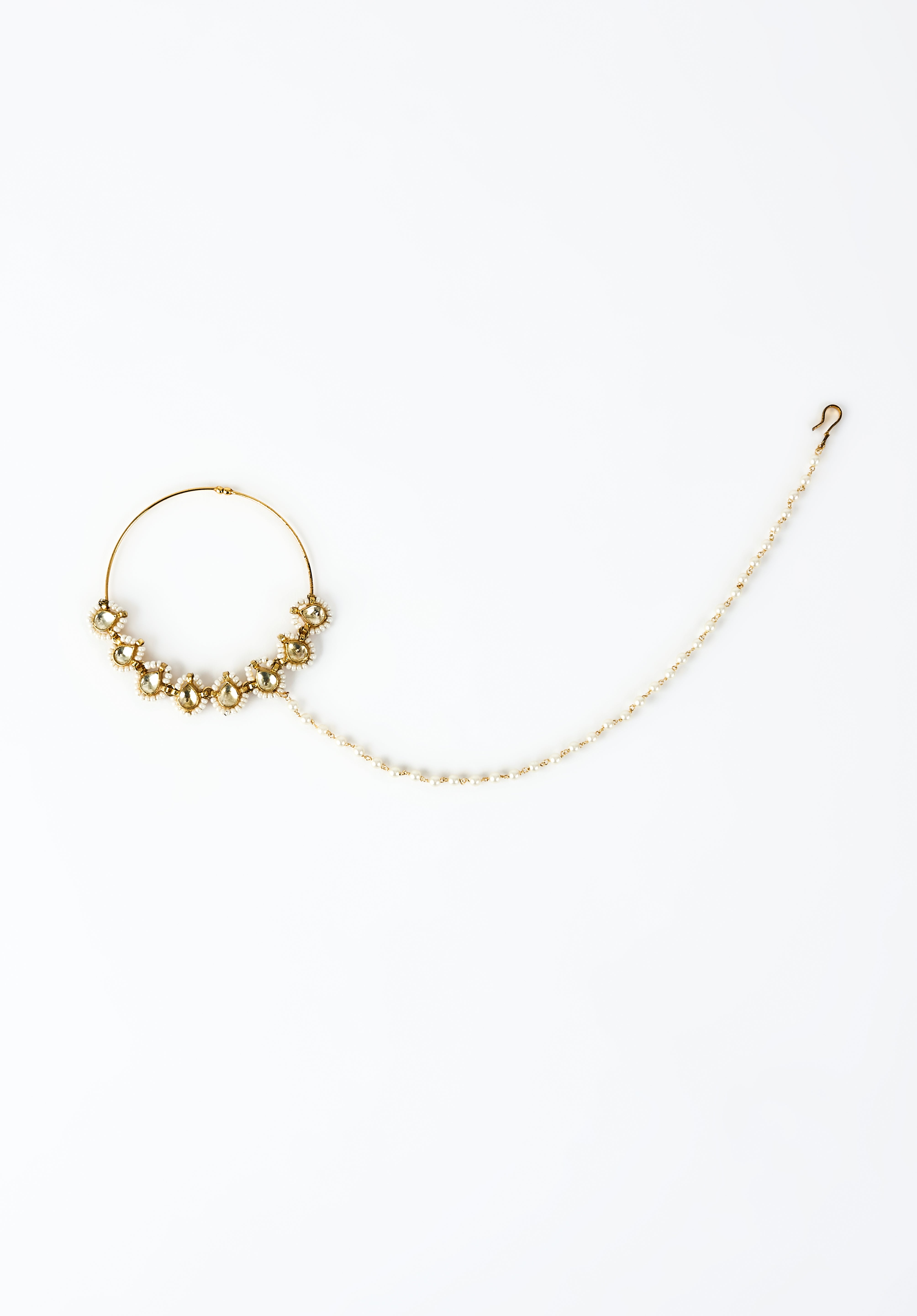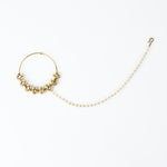 This elegant gold-toned nath features intricate Kundan work & delicate pearl details. Designed with a secure chain attachment, it adds traditional charm & sophistication to bridal and festive looks.