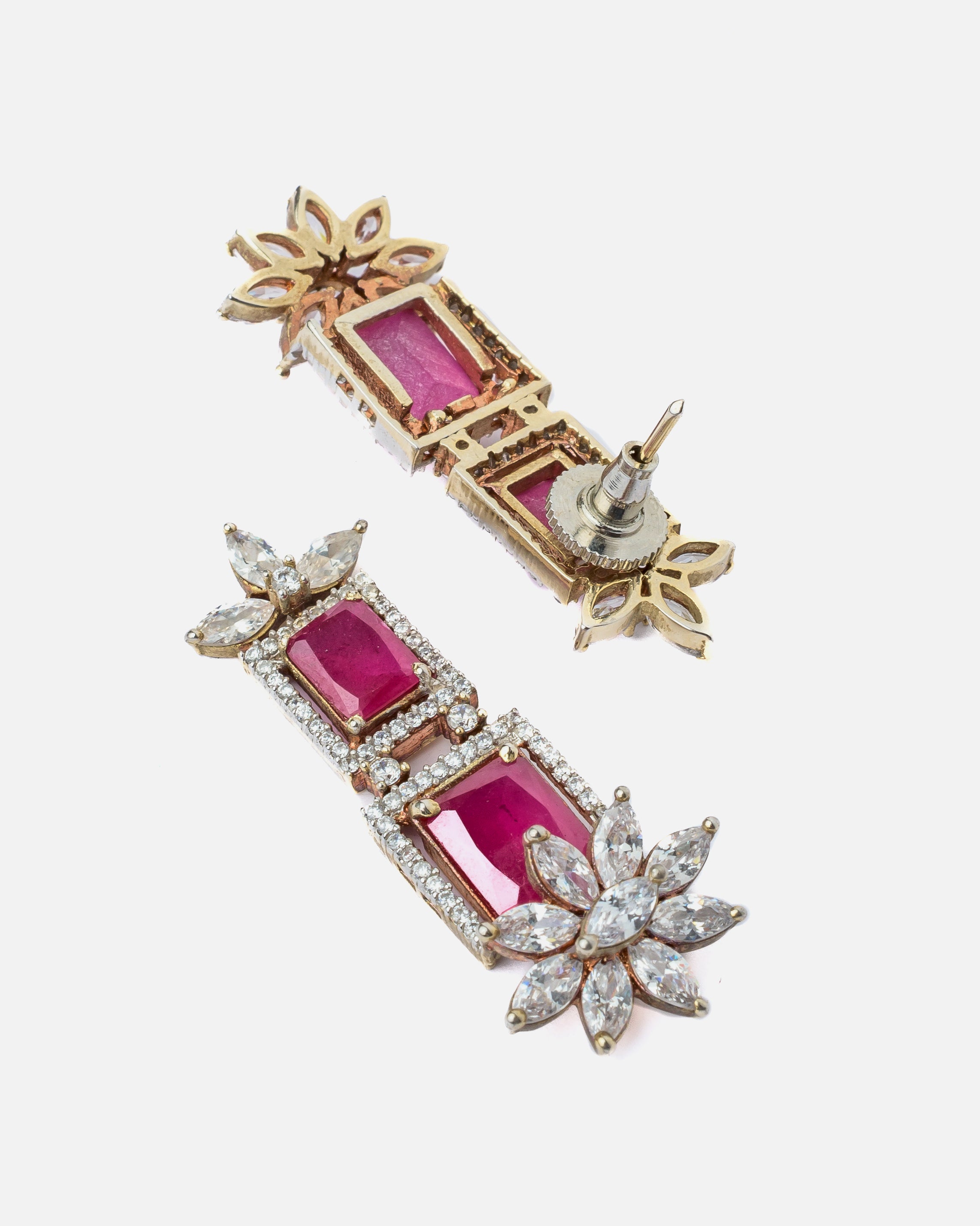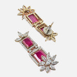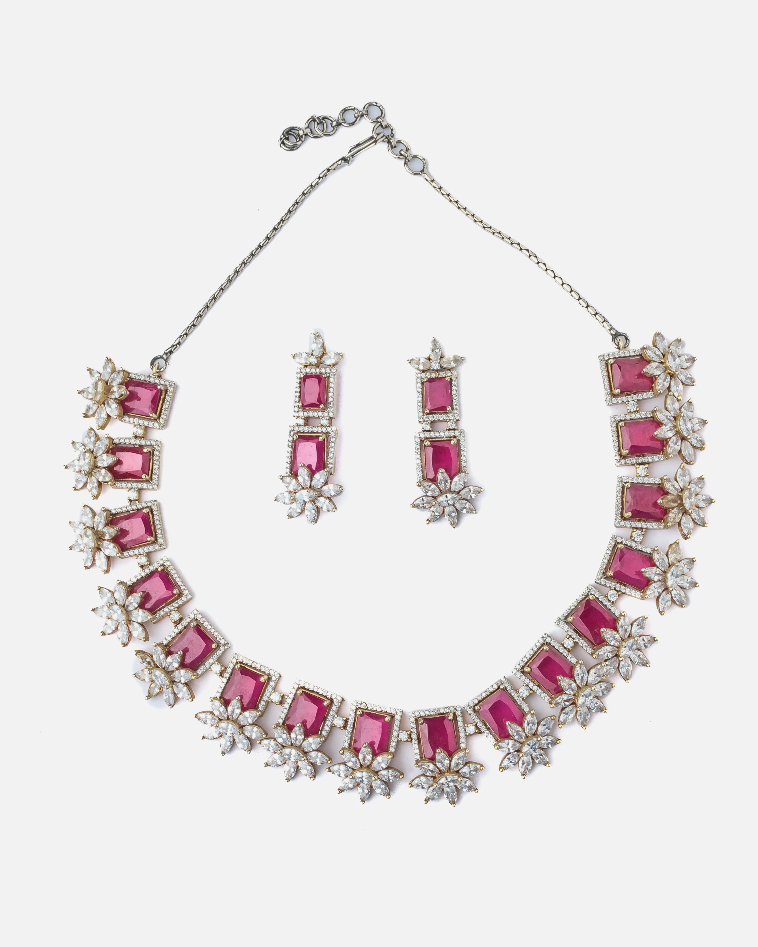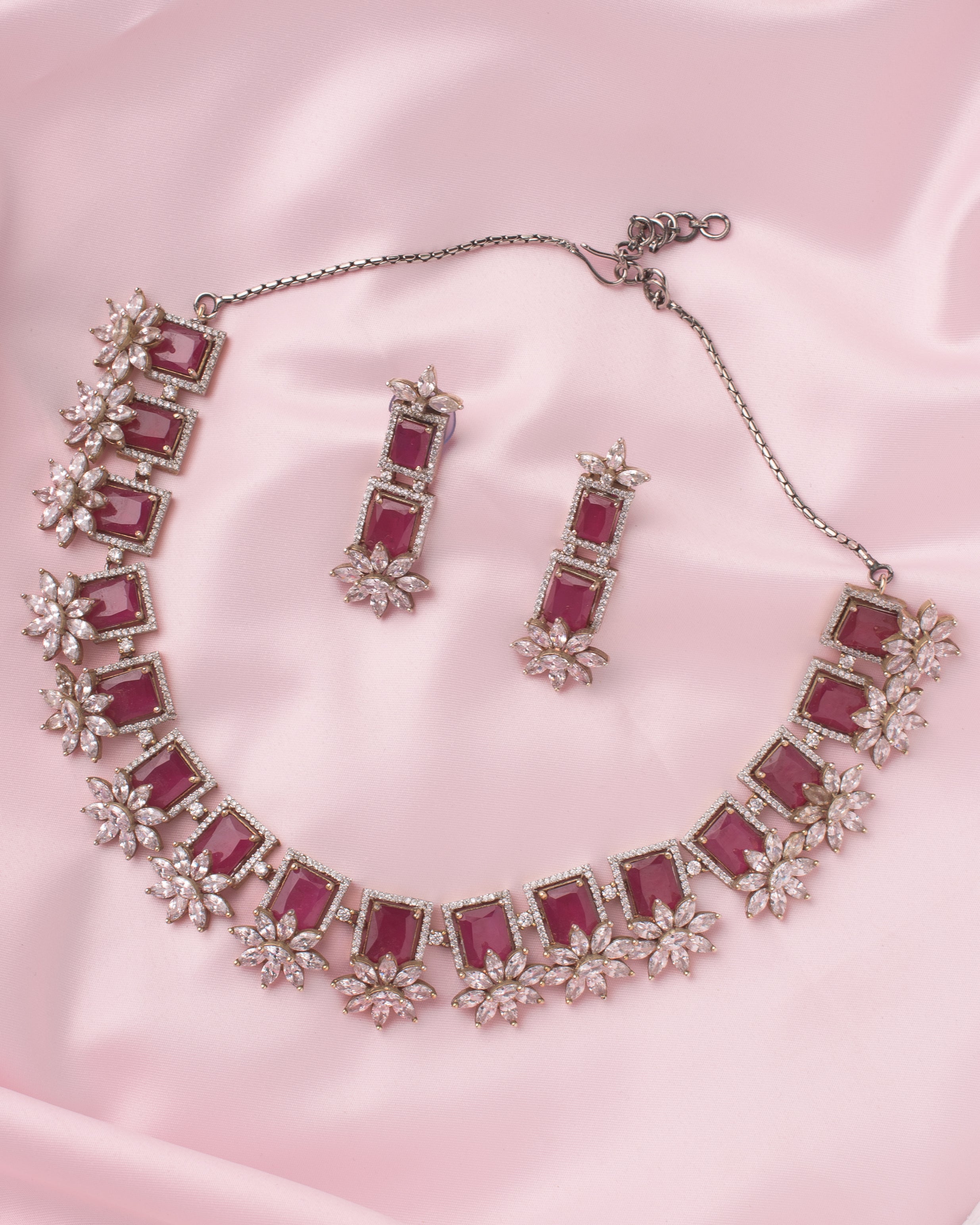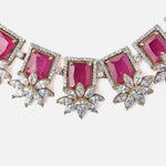 Elegant ruby-red necklace and earring set, adorned with sparkling crystals in a floral-inspired design. The rich gemstone hue and intricate detailing make it a perfect choice for weddings, parties, or special occasions.