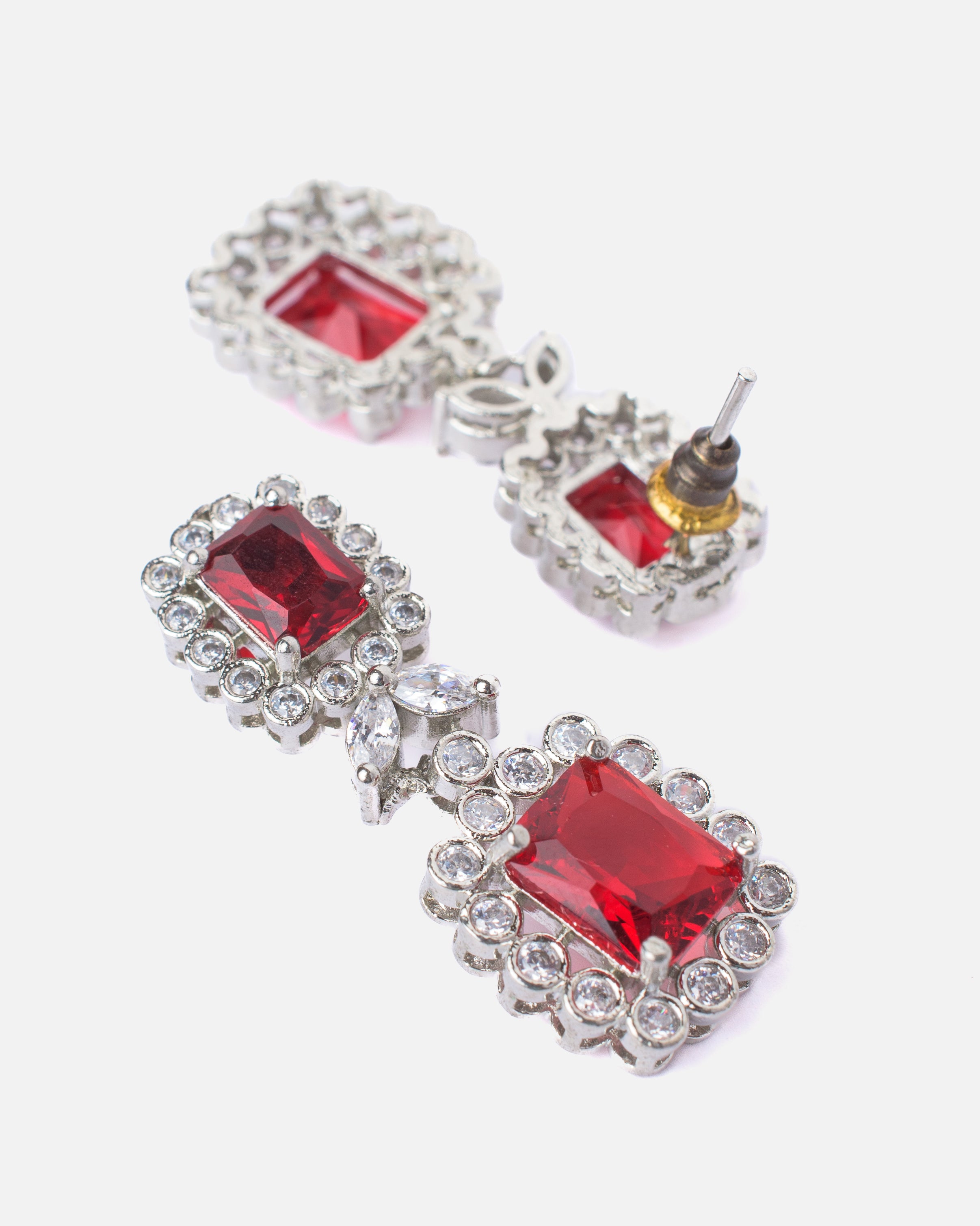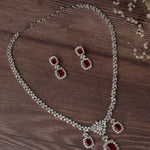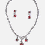 Dazzling silver-tone necklace set adorned with shimmering stones and deep red gemstone drops. Designed for elegance, perfect for weddings and evening events. Comes with matching earrings for a complete look.