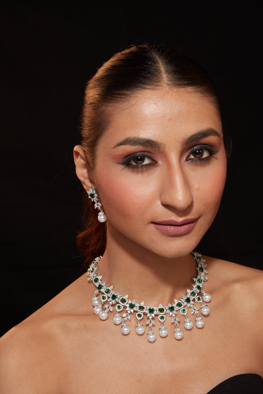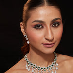 Graceful pearl and emerald-green necklace set with delicate detailing and matching earrings. A timeless accessory that combines sophistication and charm, perfect for weddings, receptions, or festive occasions.