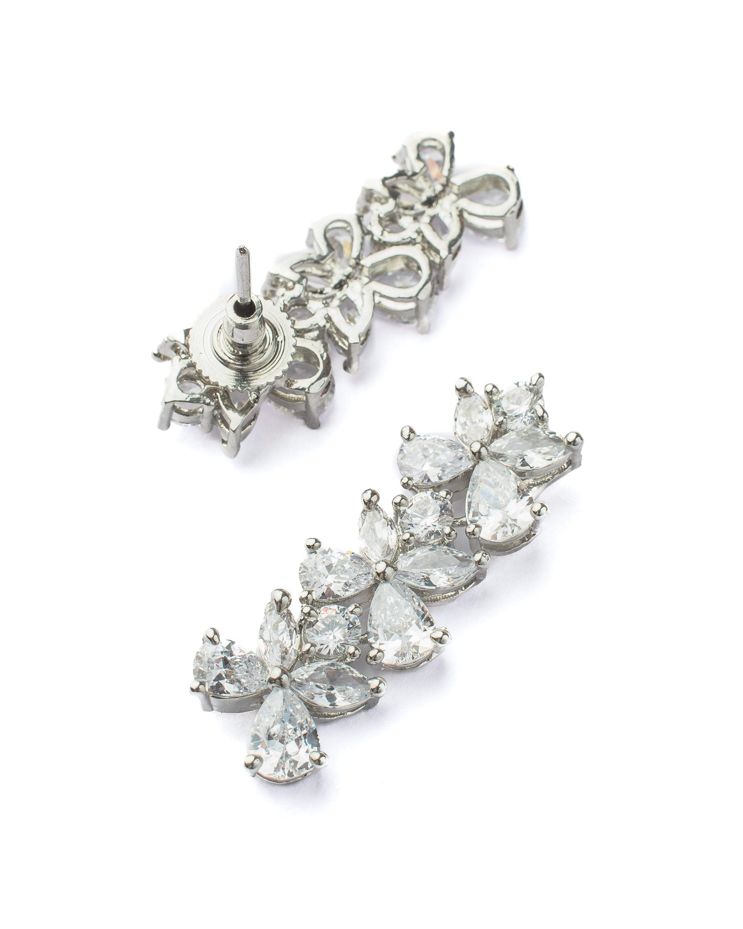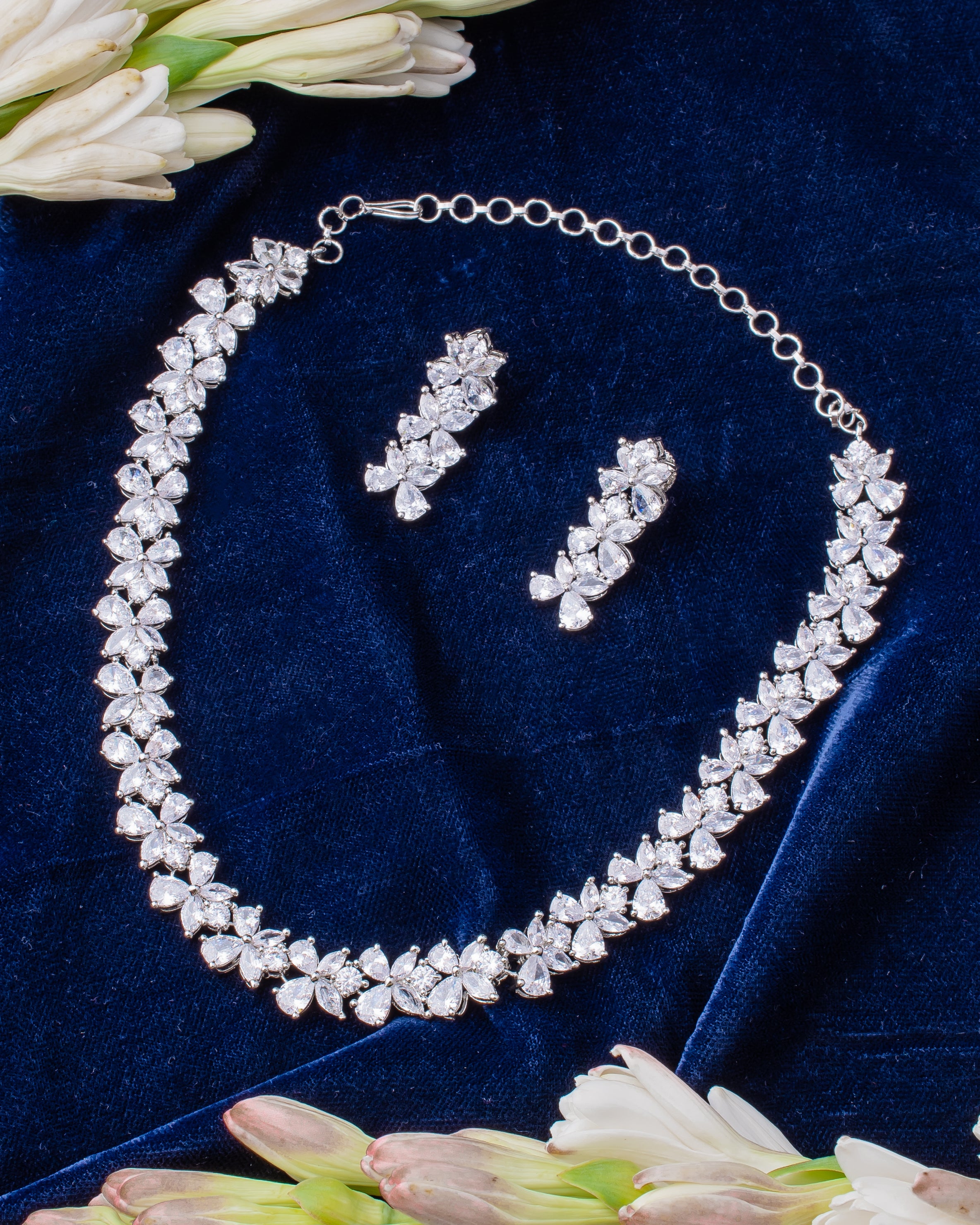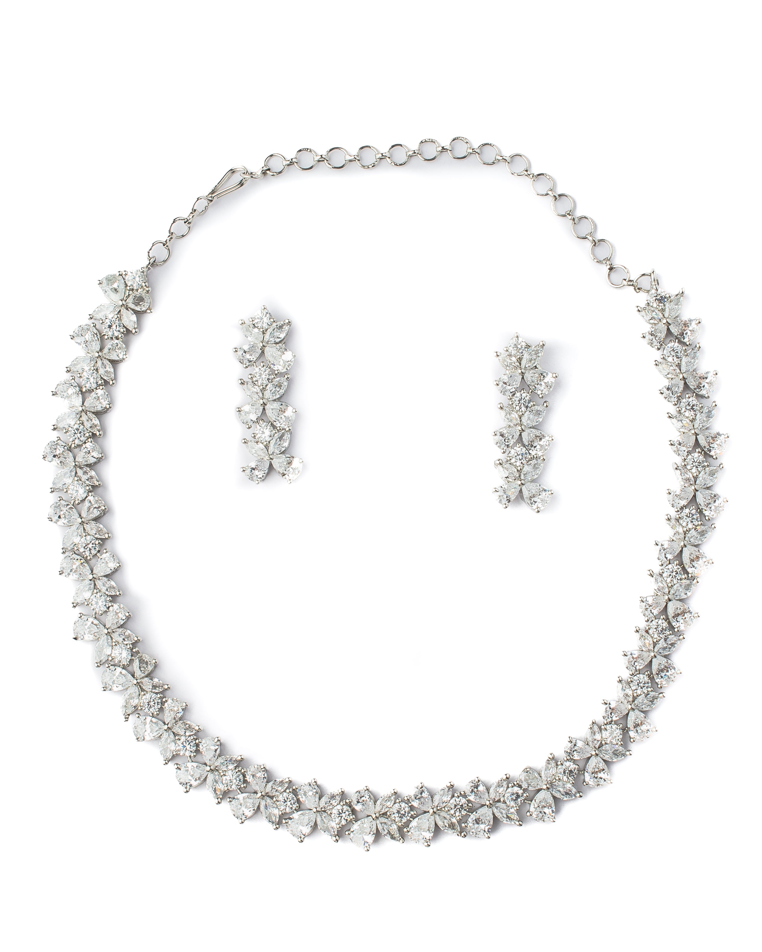 Elegant silver-toned necklace and matching earrings adorned with shimmering crystals in a floral design. Perfect for all occasions. Lightweight yet dazzling, ideal for a statement look.