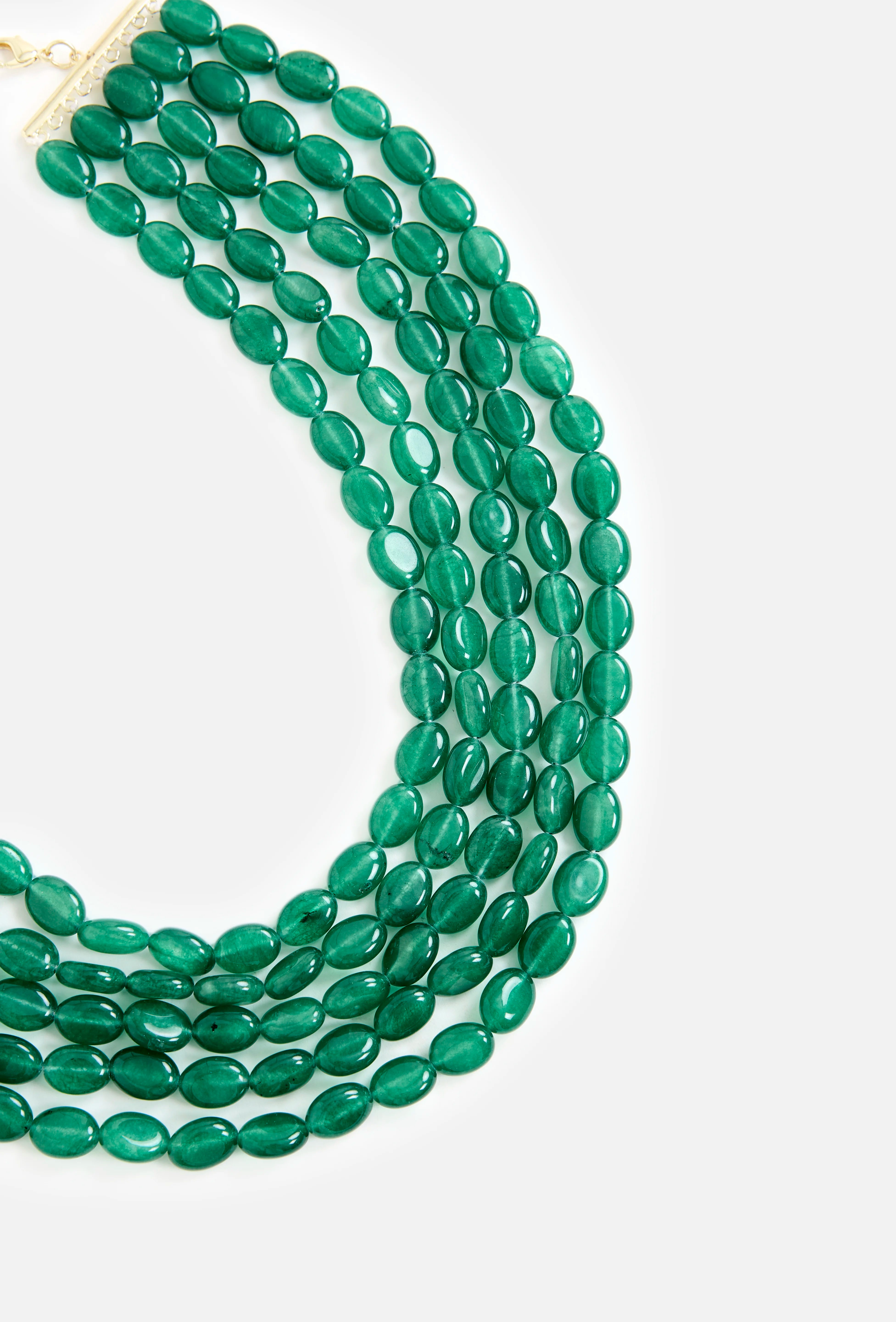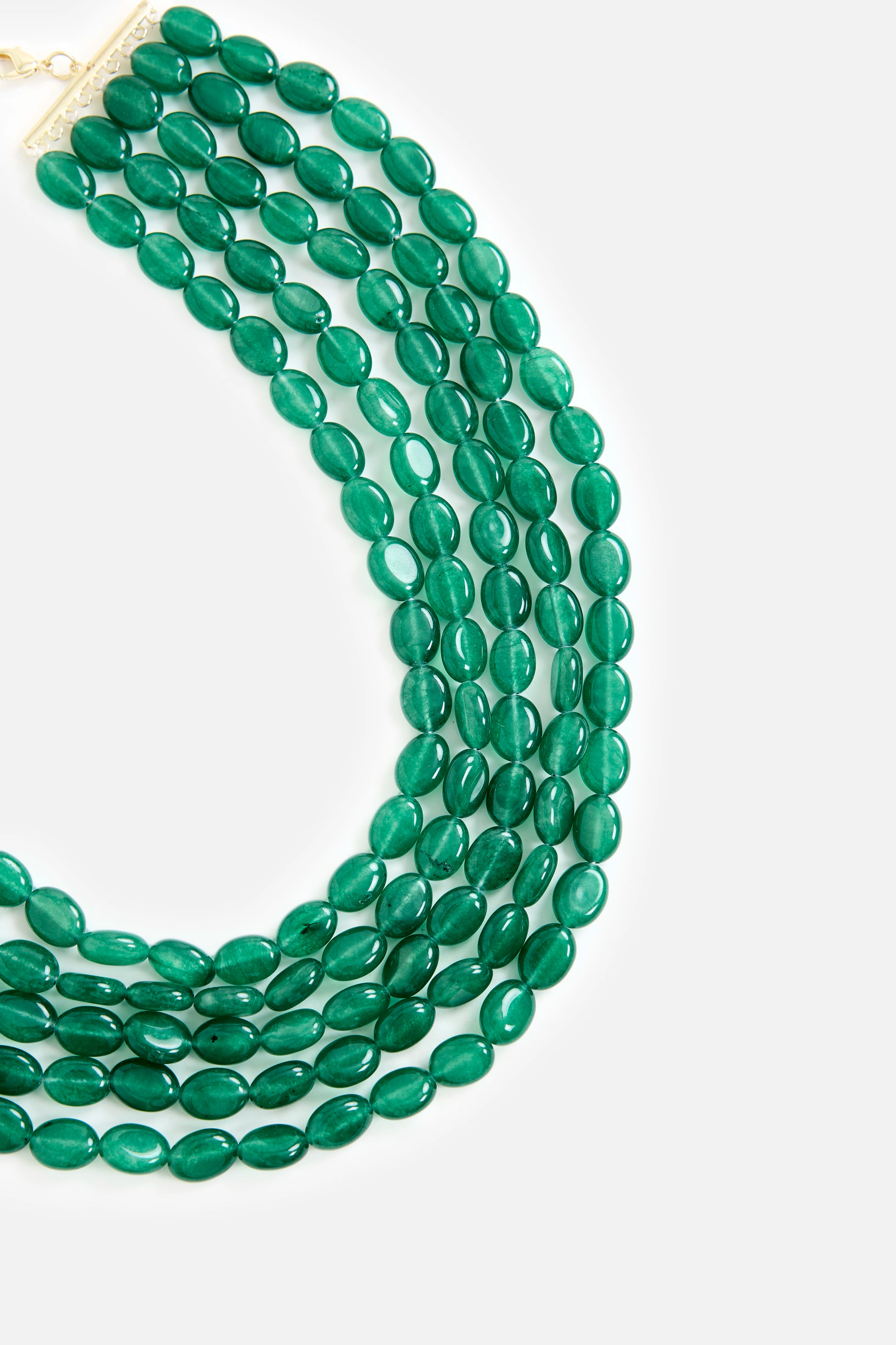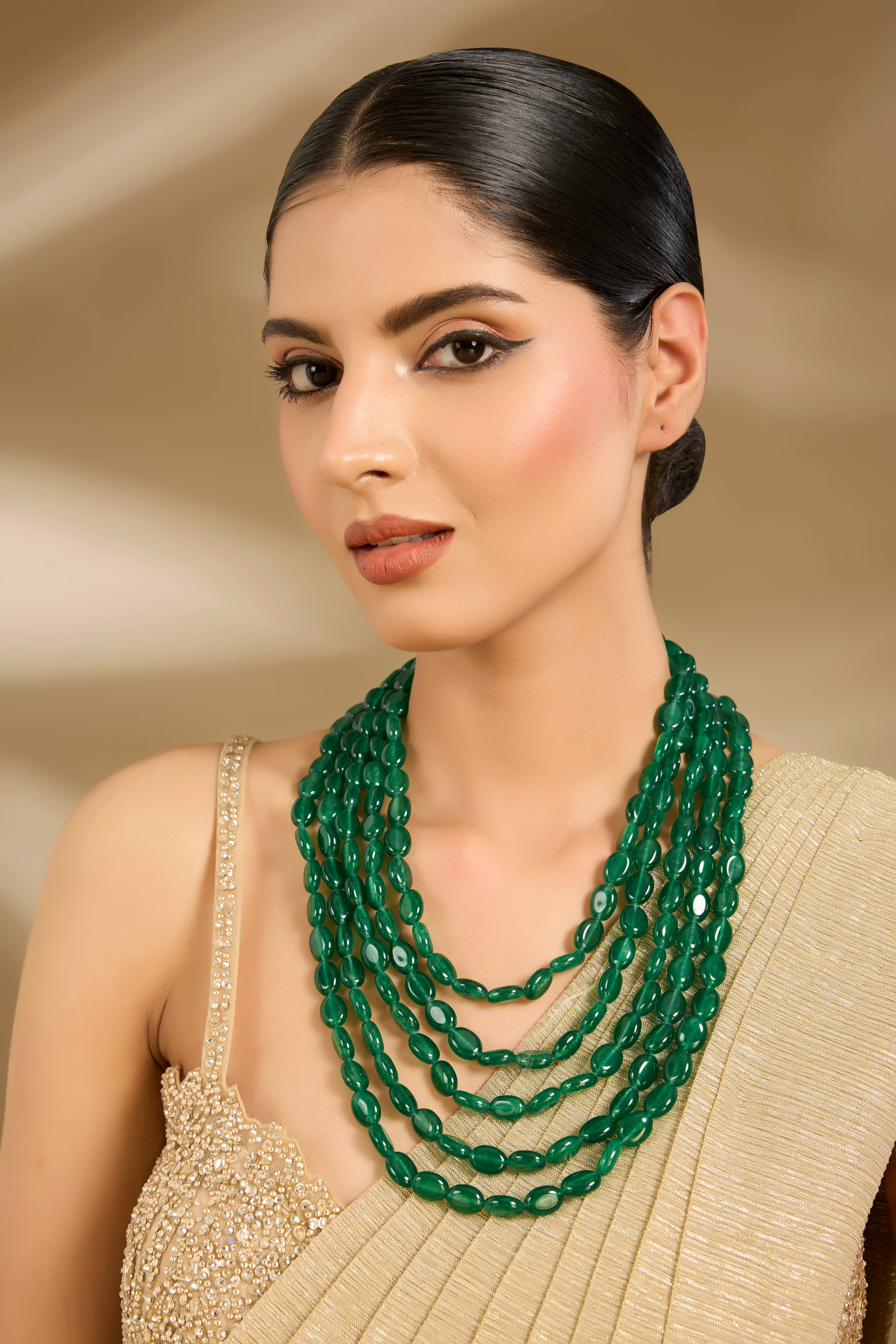 Elegant multi-layered green bead necklace, handcrafted for a bold yet timeless look. Lightweight and versatile, it pairs beautifully with sarees, lehengas, and festive ensembles.