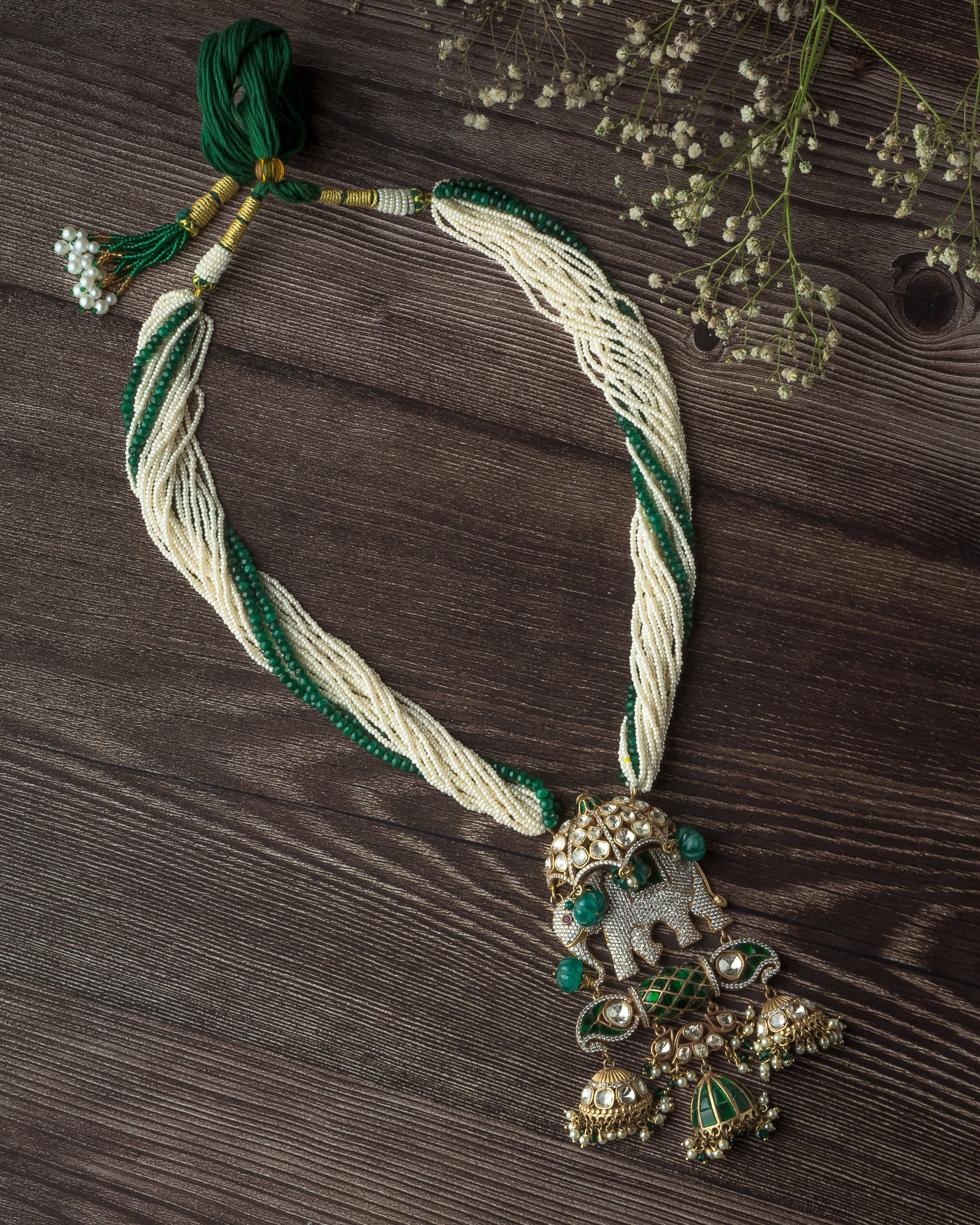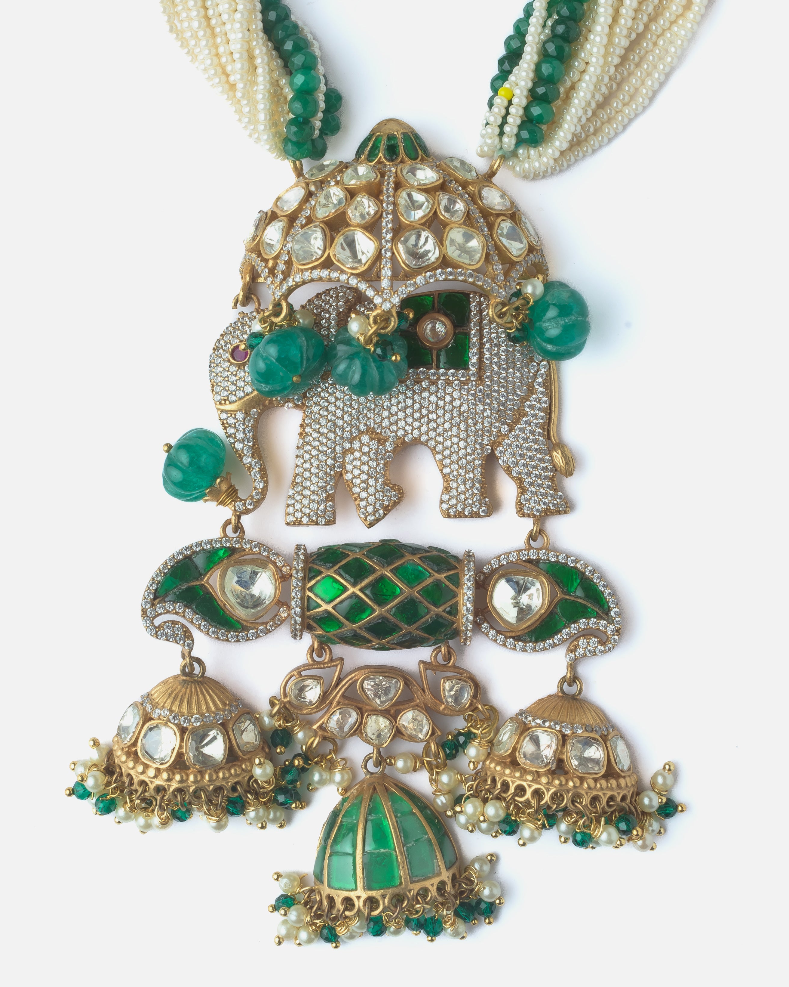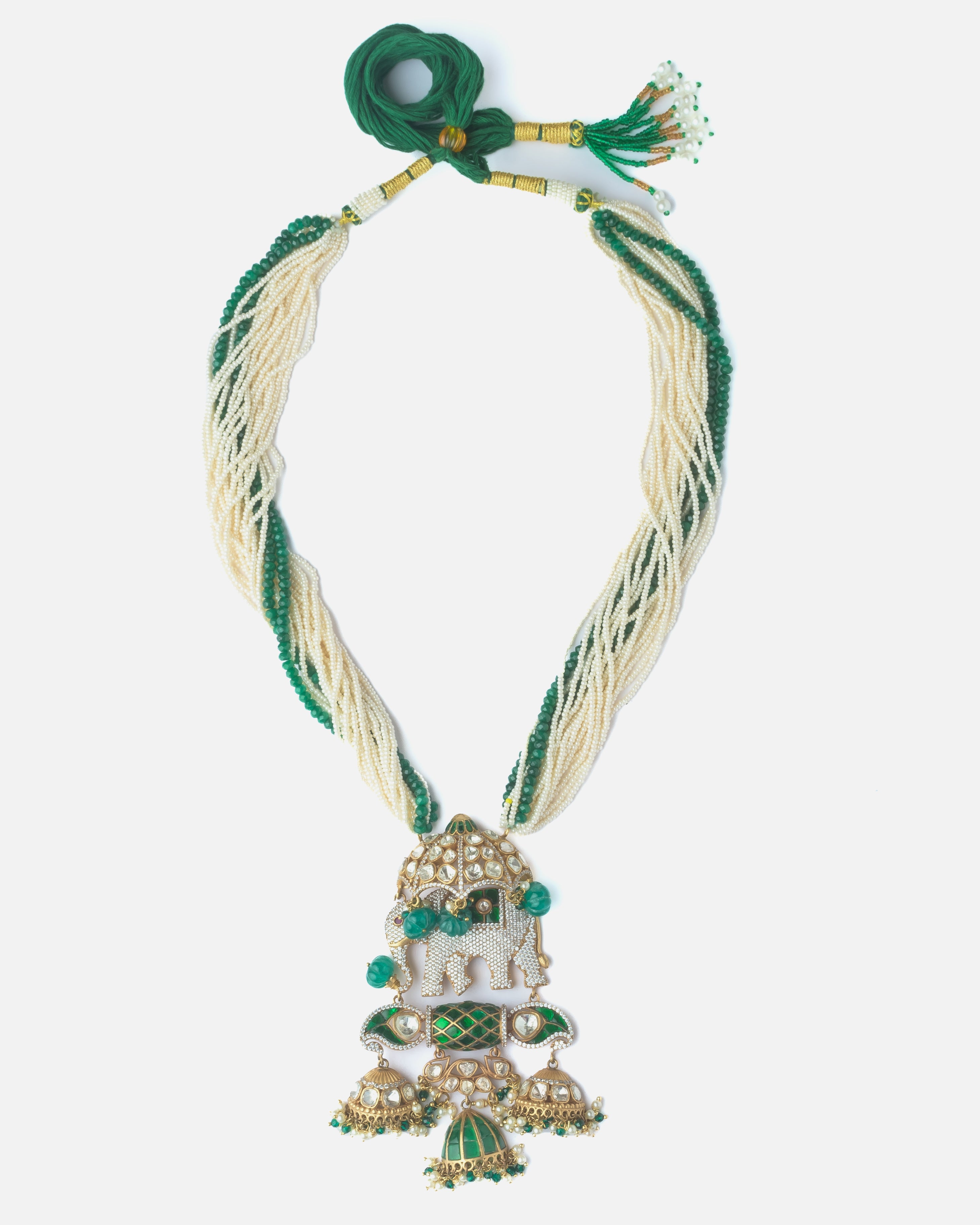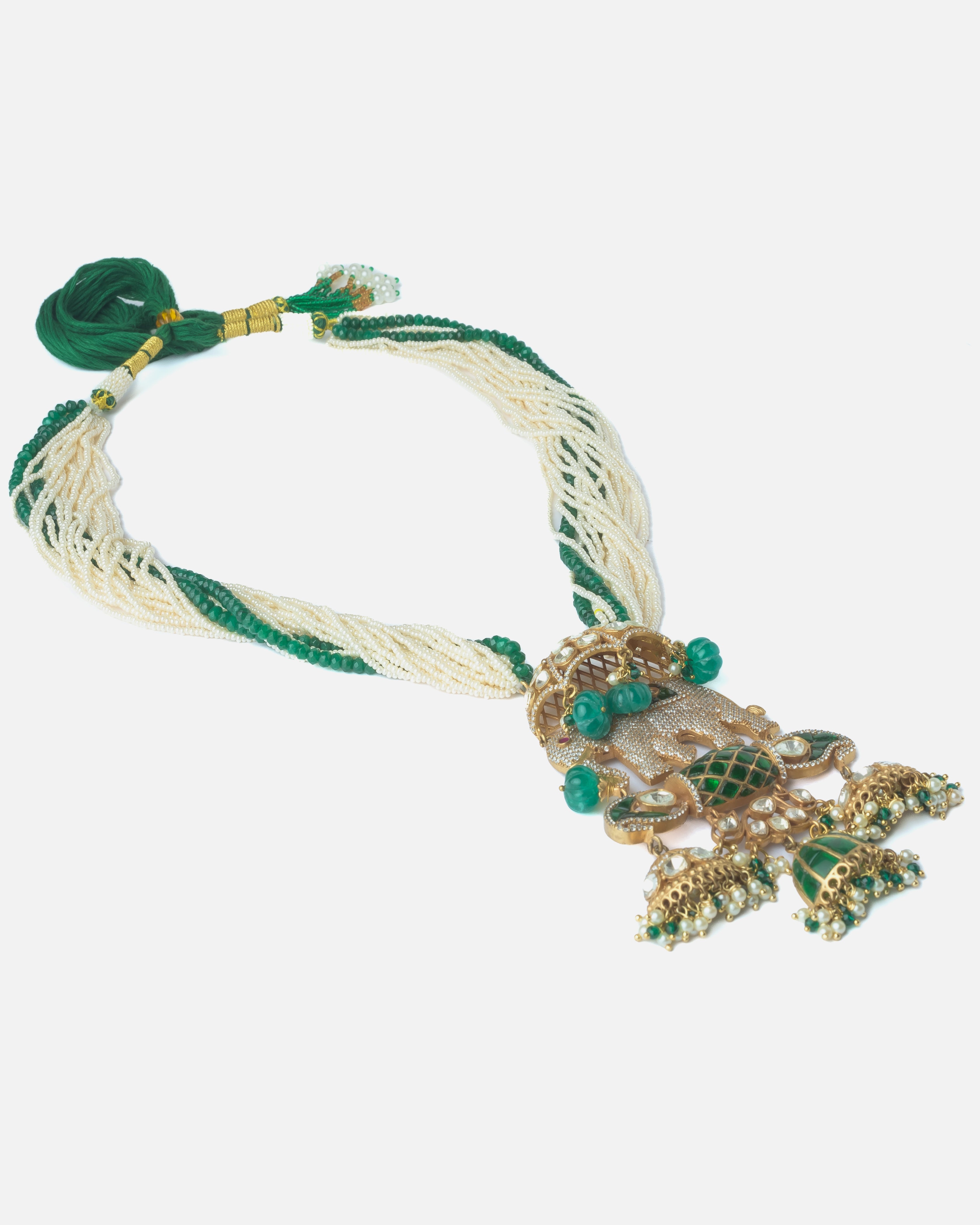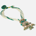 Make a bold statement with this handcrafted necklace featuring an intricately designed elephant pendant, green and white beaded strands, and traditional jhumka-style danglers. Perfect for festive attire.