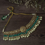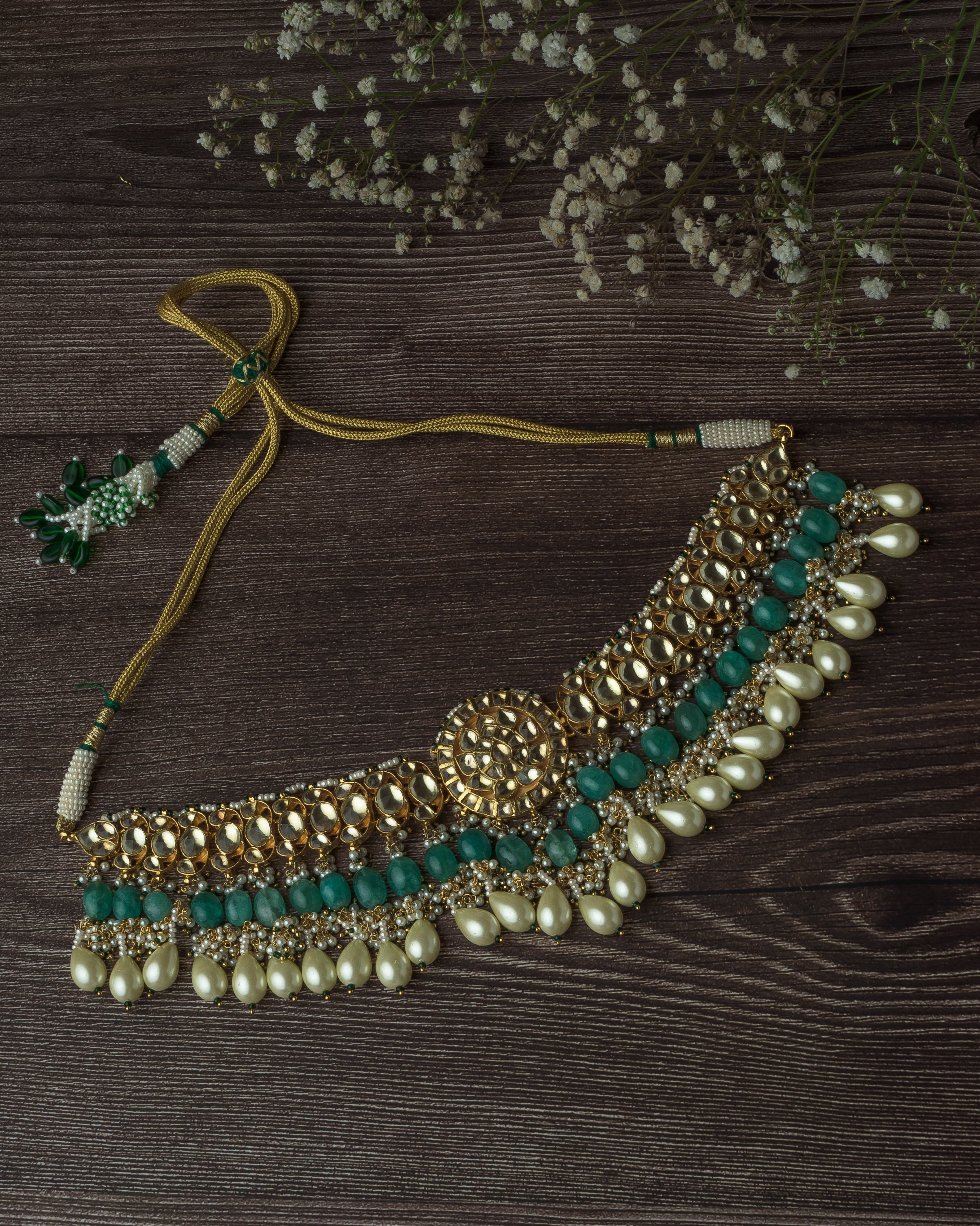 Elegant traditional choker necklace adorned with green beads, pearl drops, and intricate gold-tone detailing. Perfect for weddings and festive occasions, this statement piece adds regal charm to any attire.