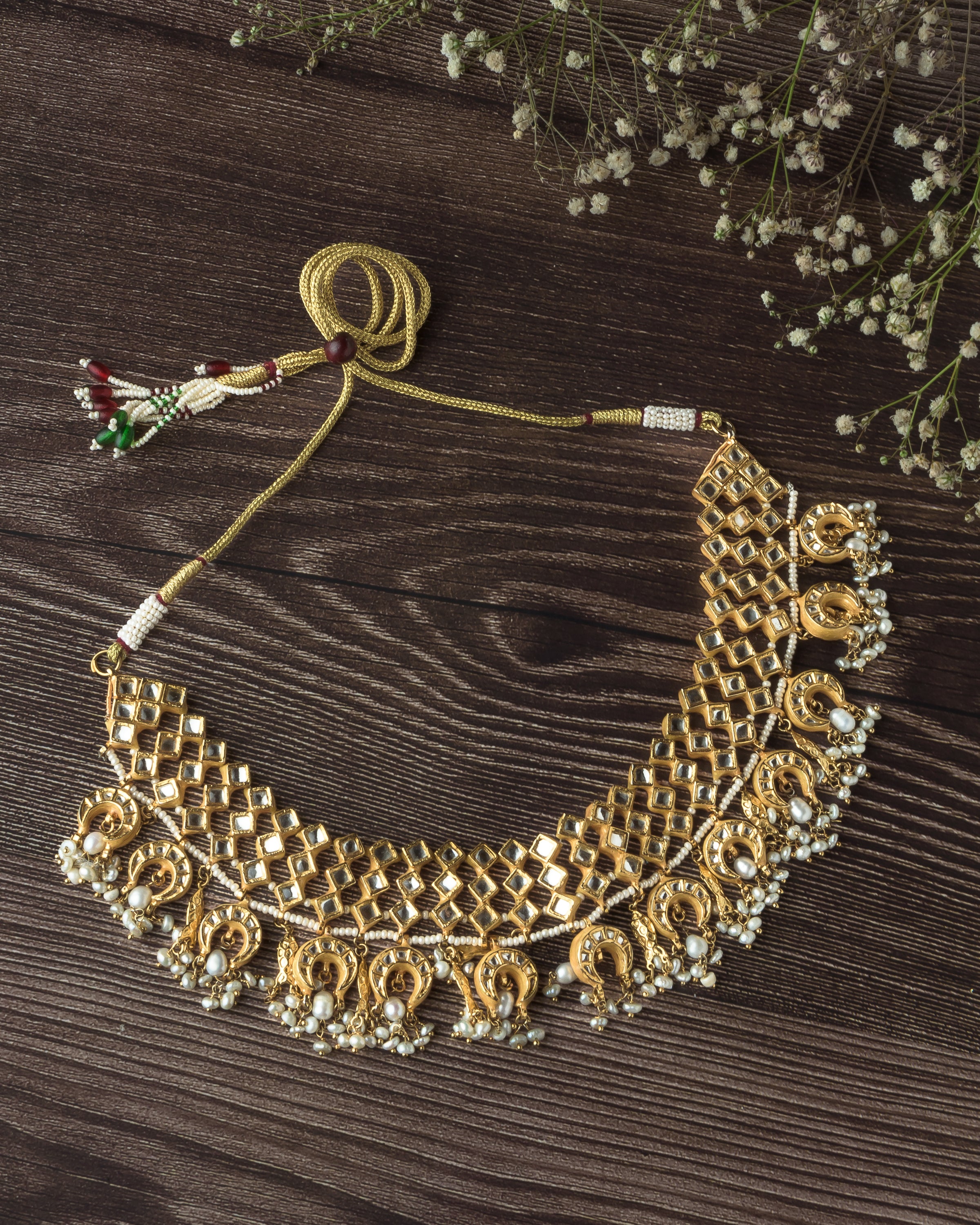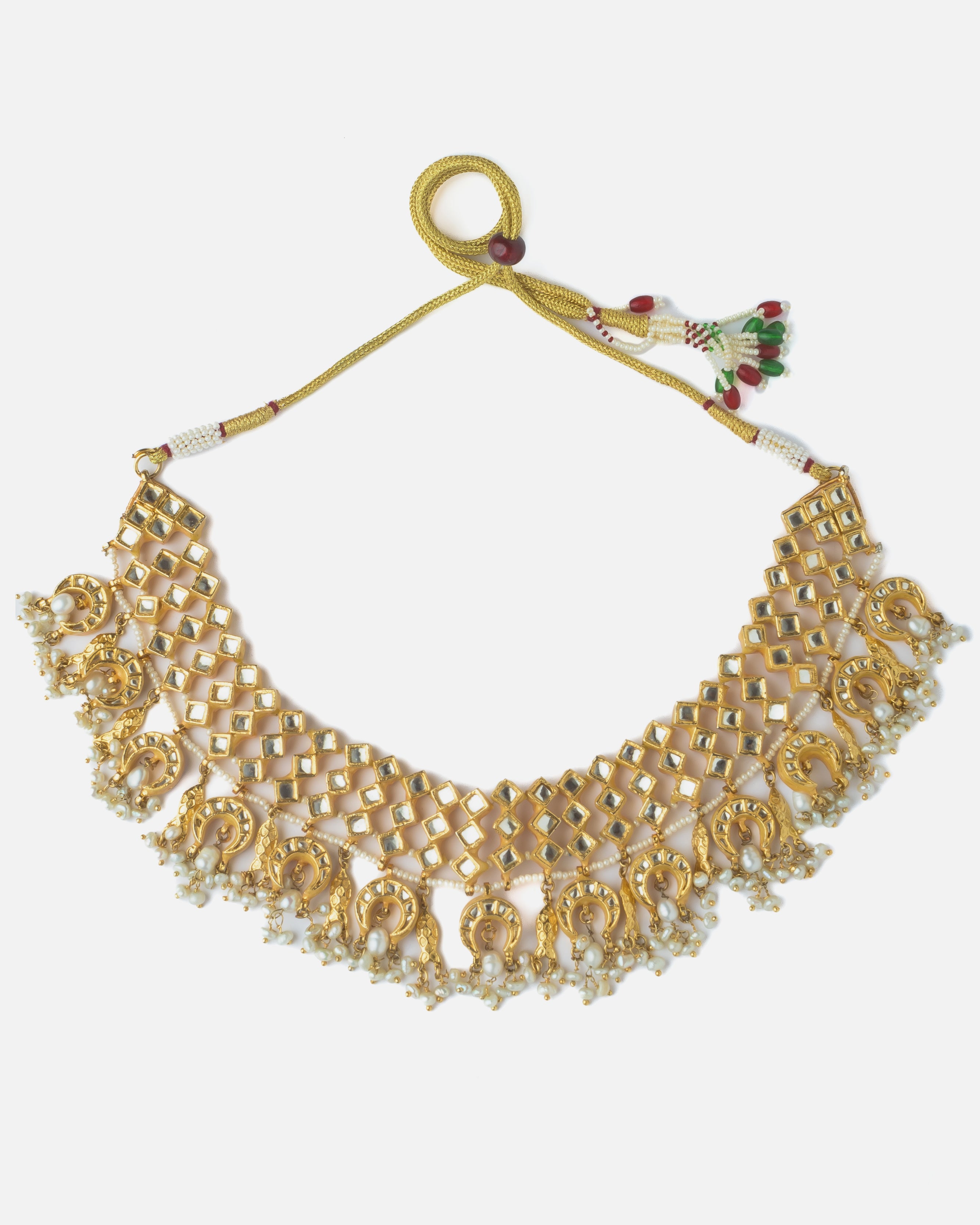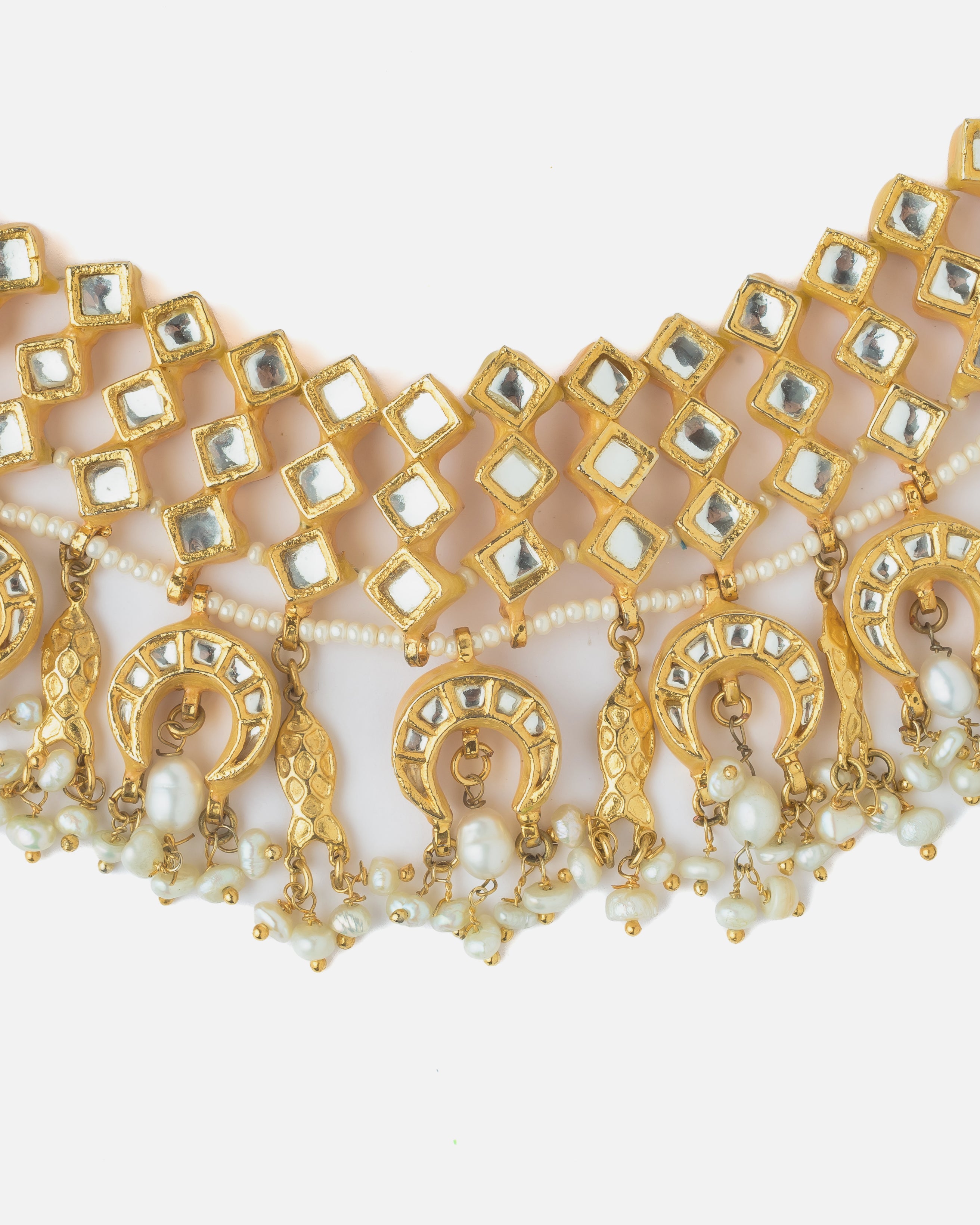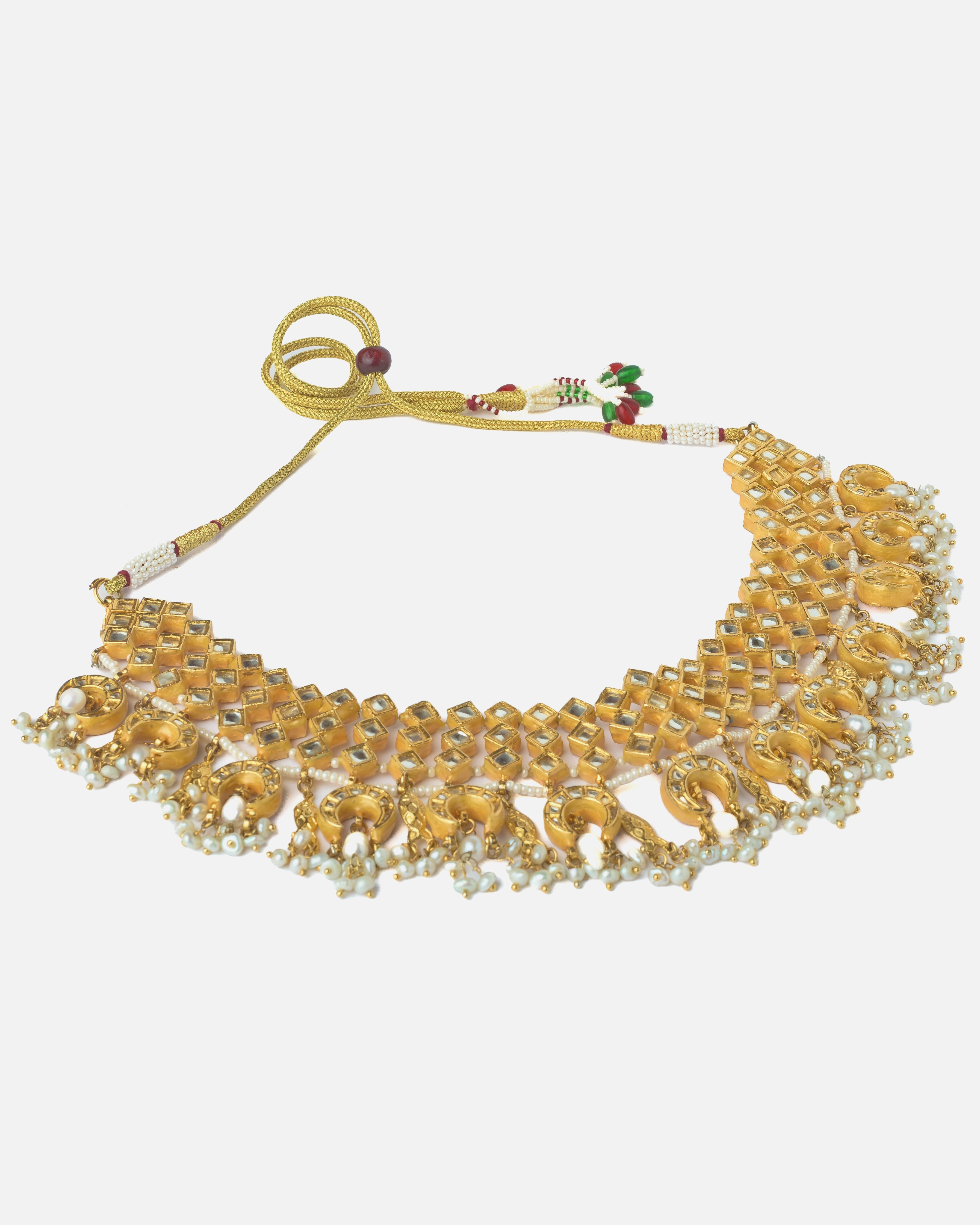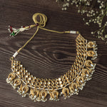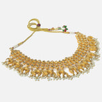 This exquisite gold-toned choker necklace features intricate mirror work and traditional motifs adorned with pearl hangings, making it a perfect statement piece for weddings and festive celebrations.