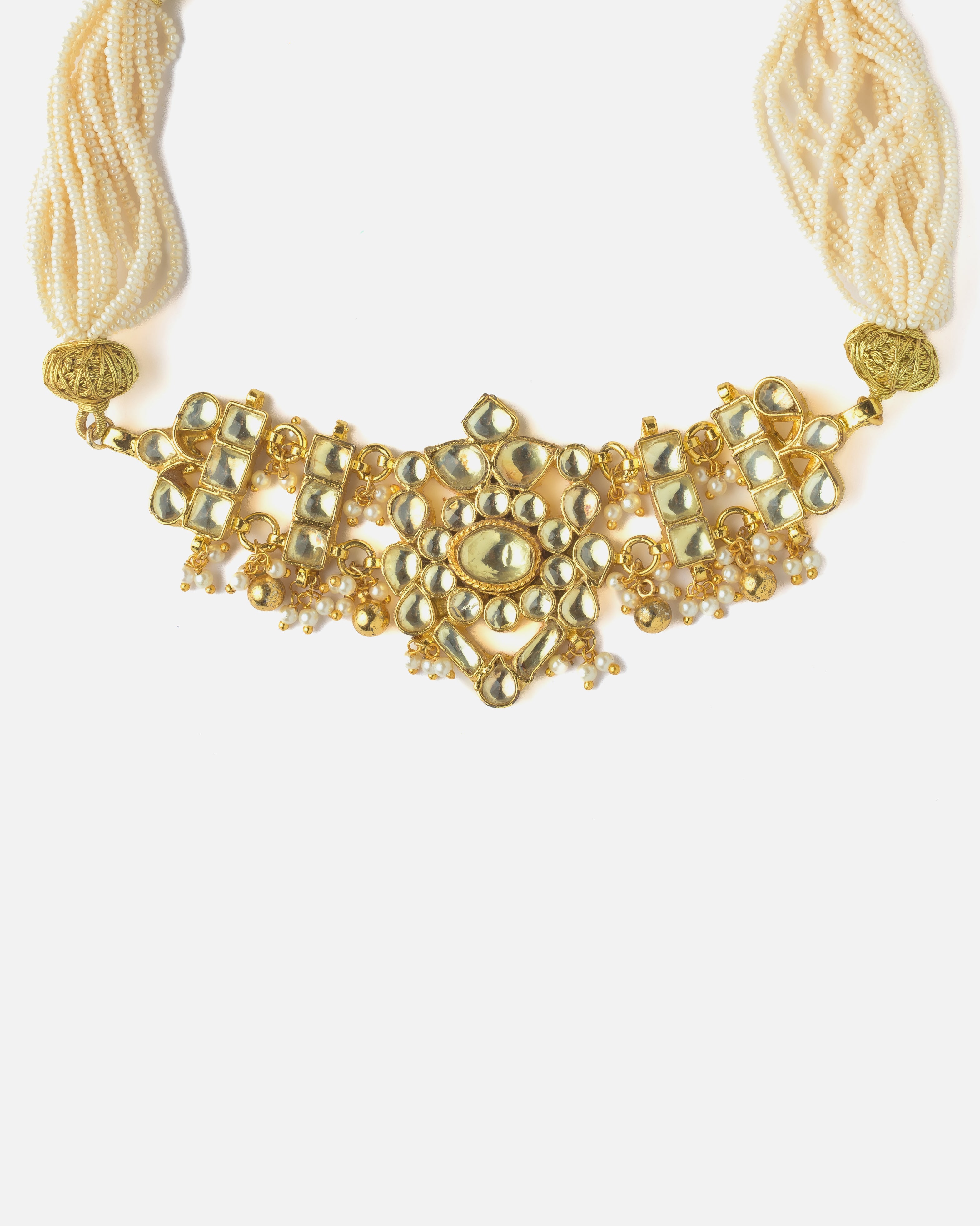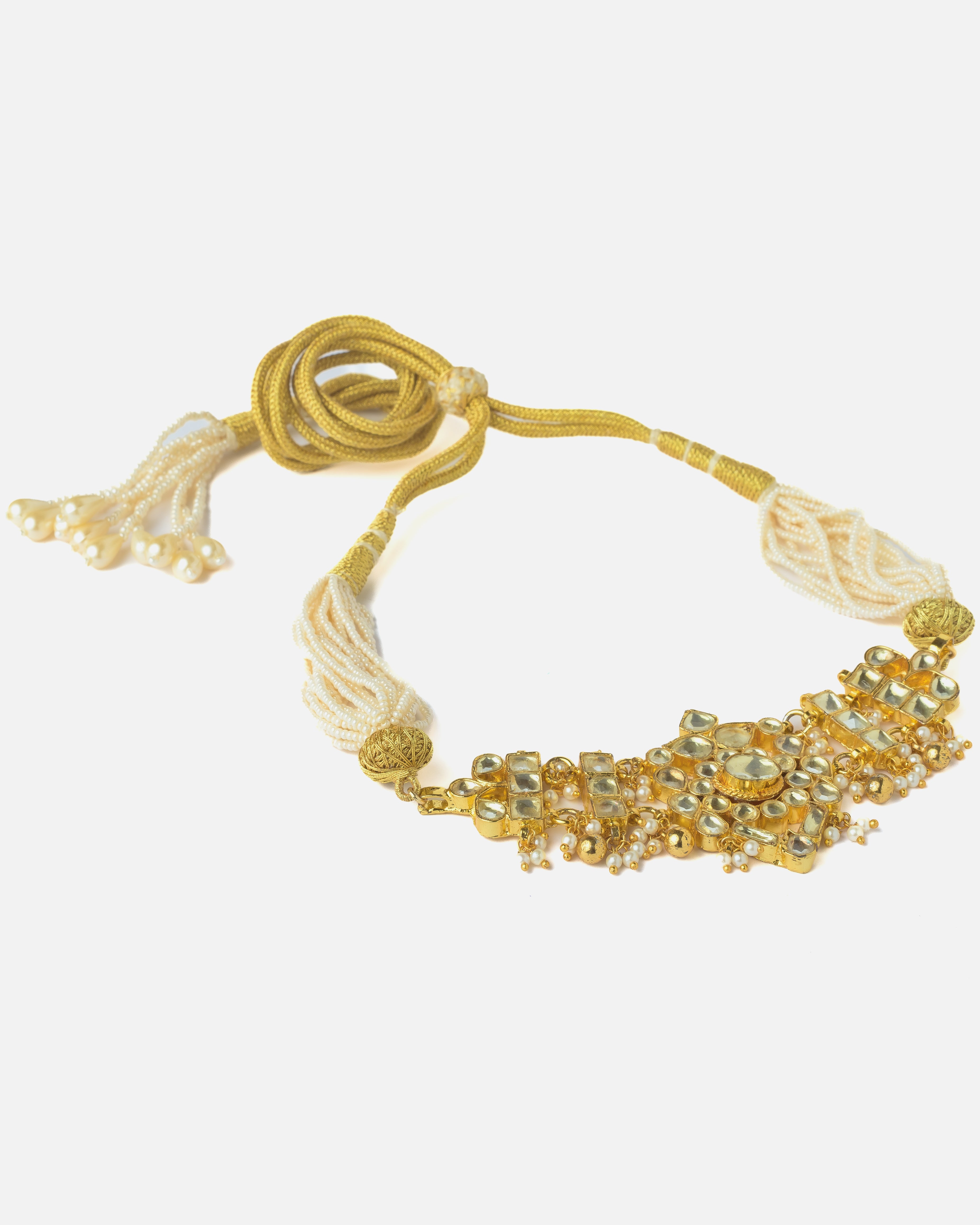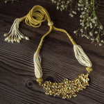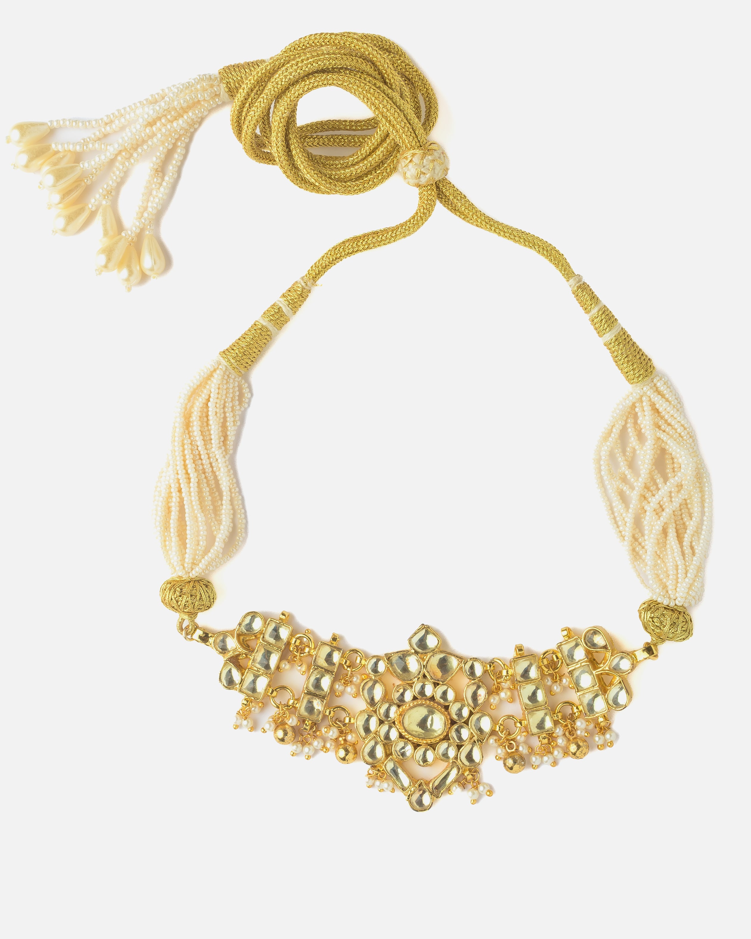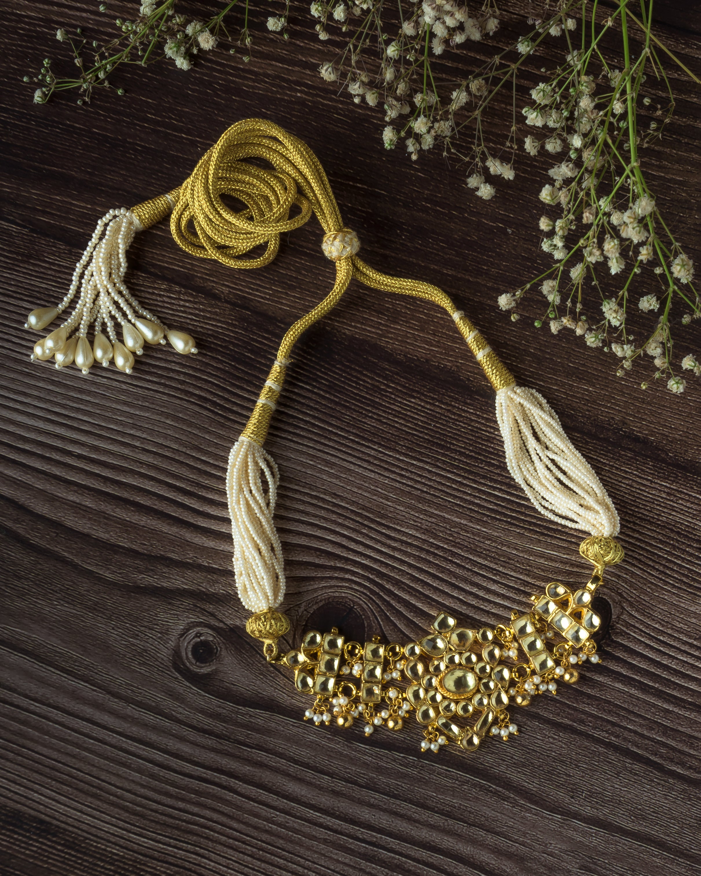 Elegant gold-toned Kundan necklace featuring intricate mirror work, pearl bead clusters, and braided dori for adjustable fit—perfect for weddings, festive occasions, and traditional attire.