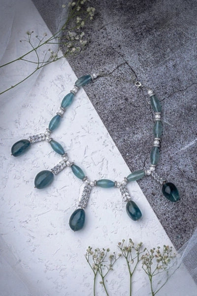 Elegant necklace with a blend of aqua-toned beads, pearl accents, and silver embellishments. Perfect for adding a touch of sophistication and charm to any outfit. Adjustable clasp for a custom fit.