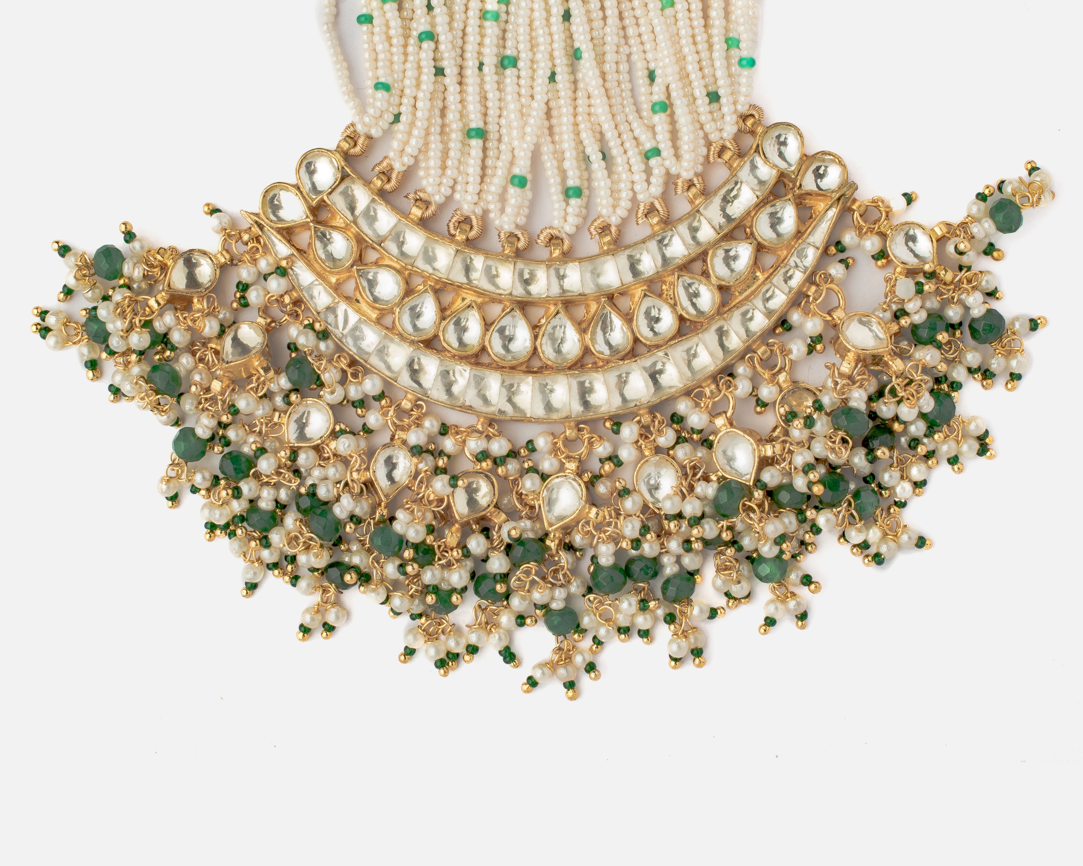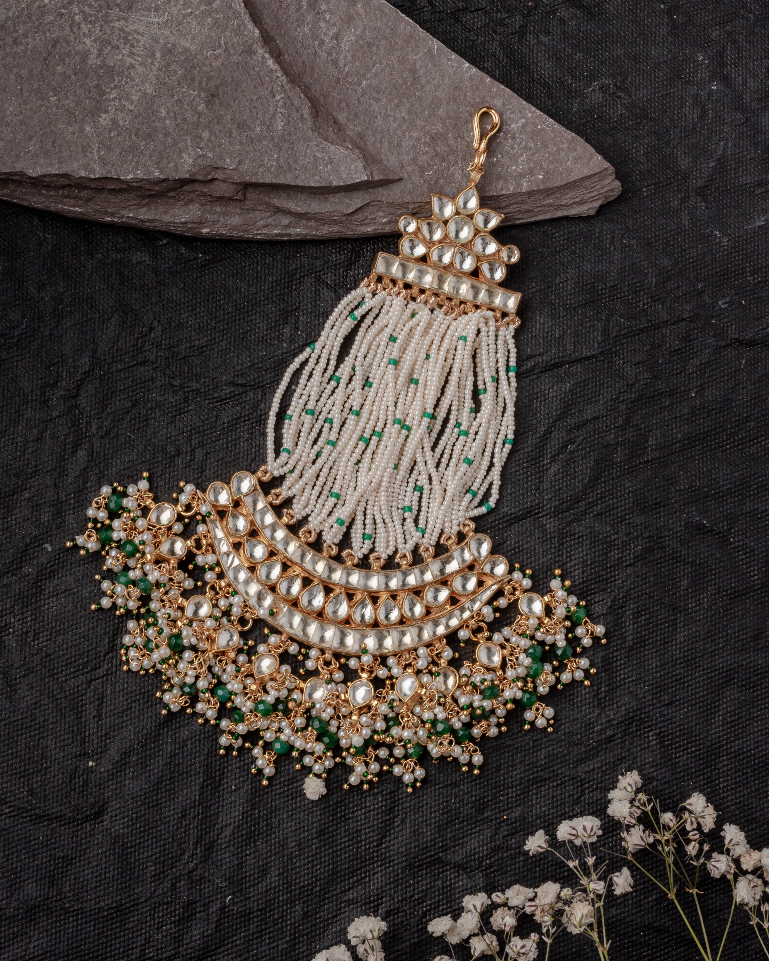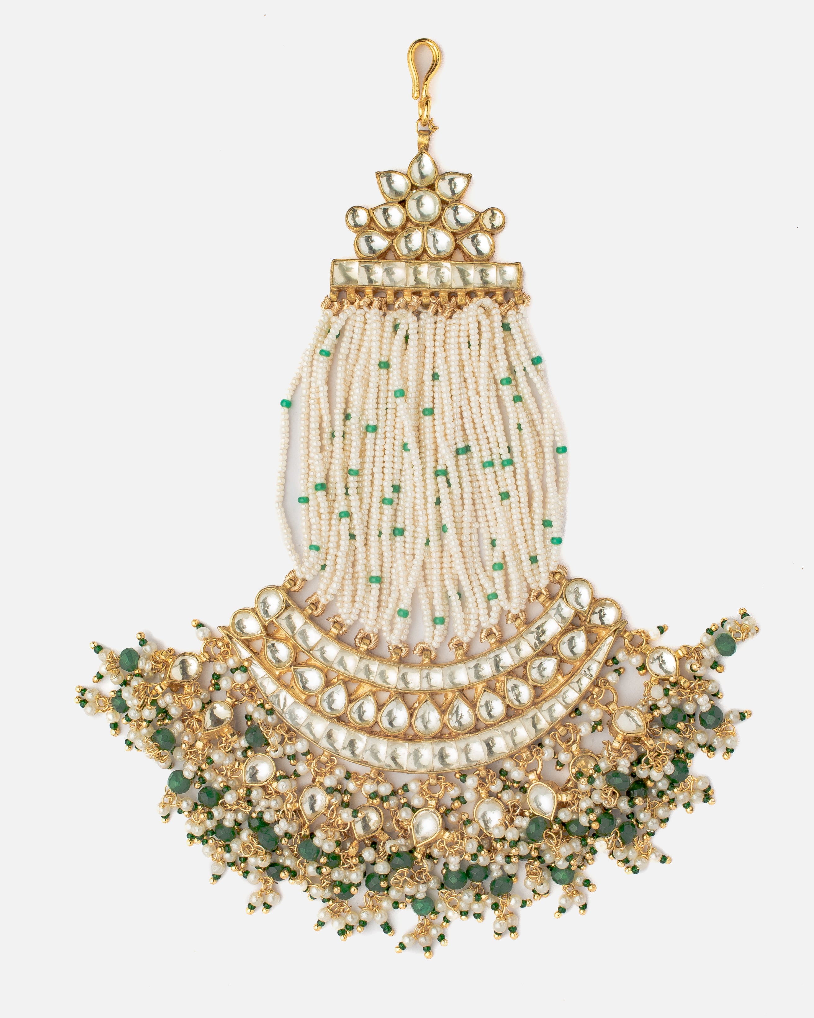 This stunning Paasa features an intricate design with pearl and green stone embellishments, delicate bead strands, and gold accents, making it a perfect accessory for traditional and bridal wear.