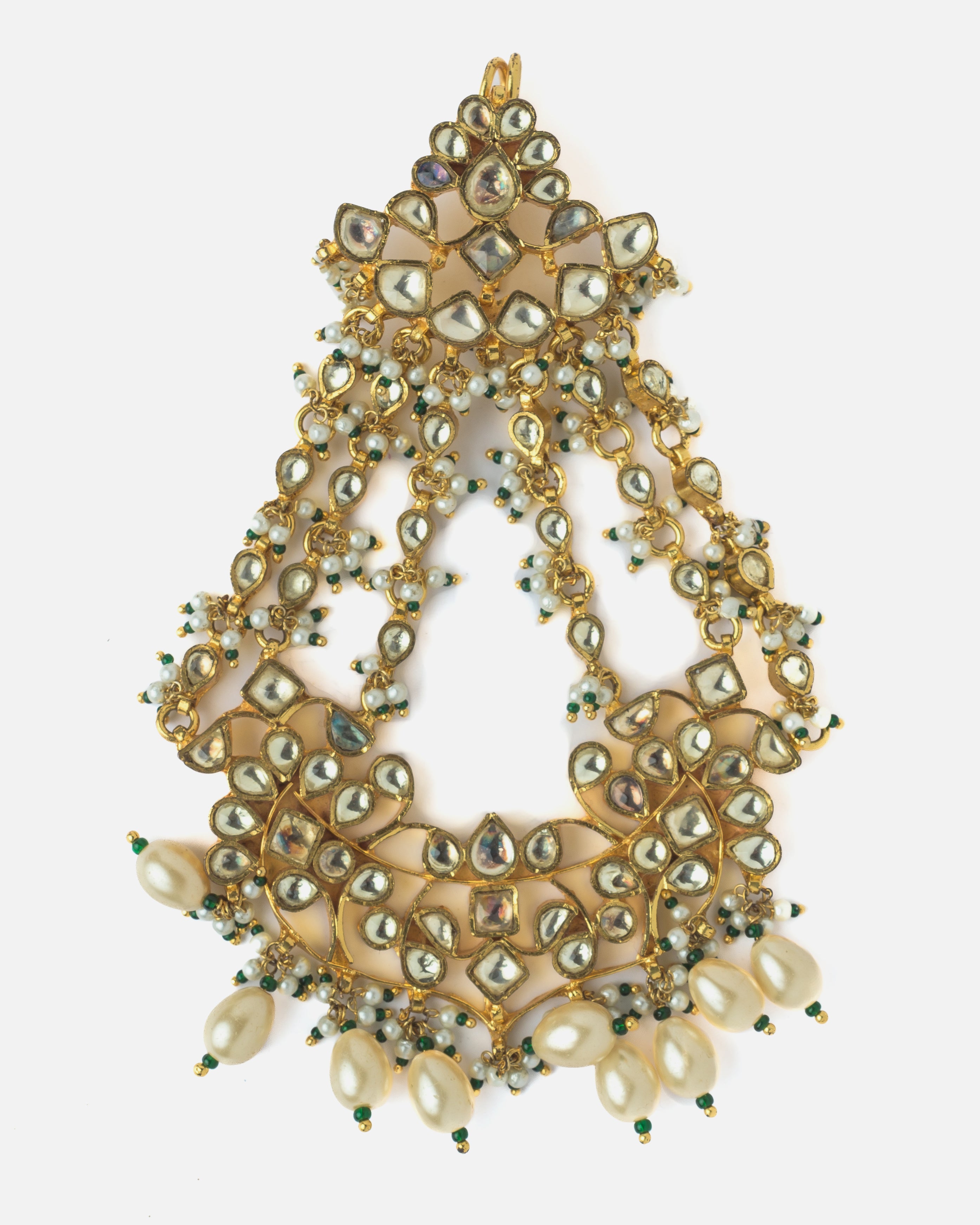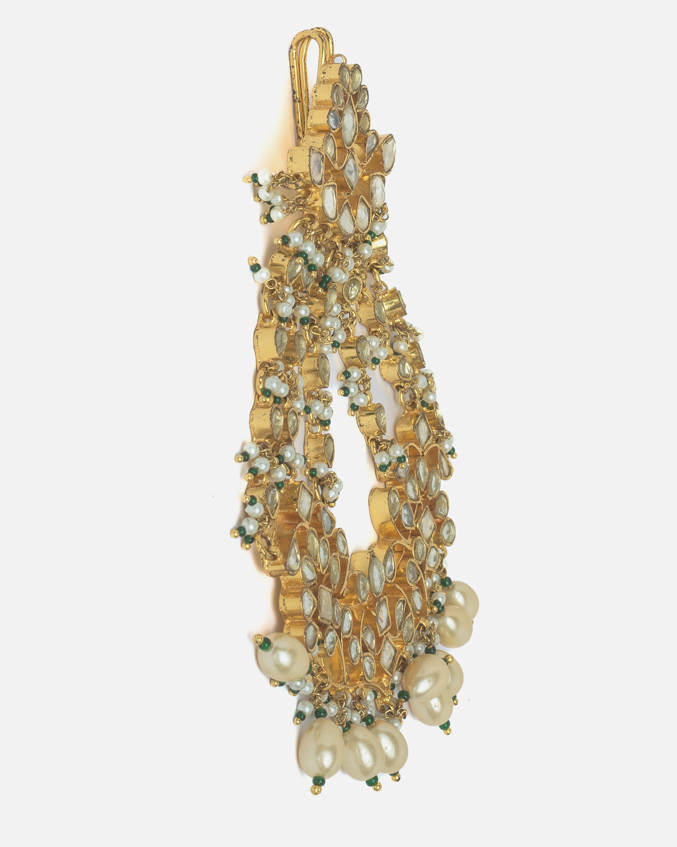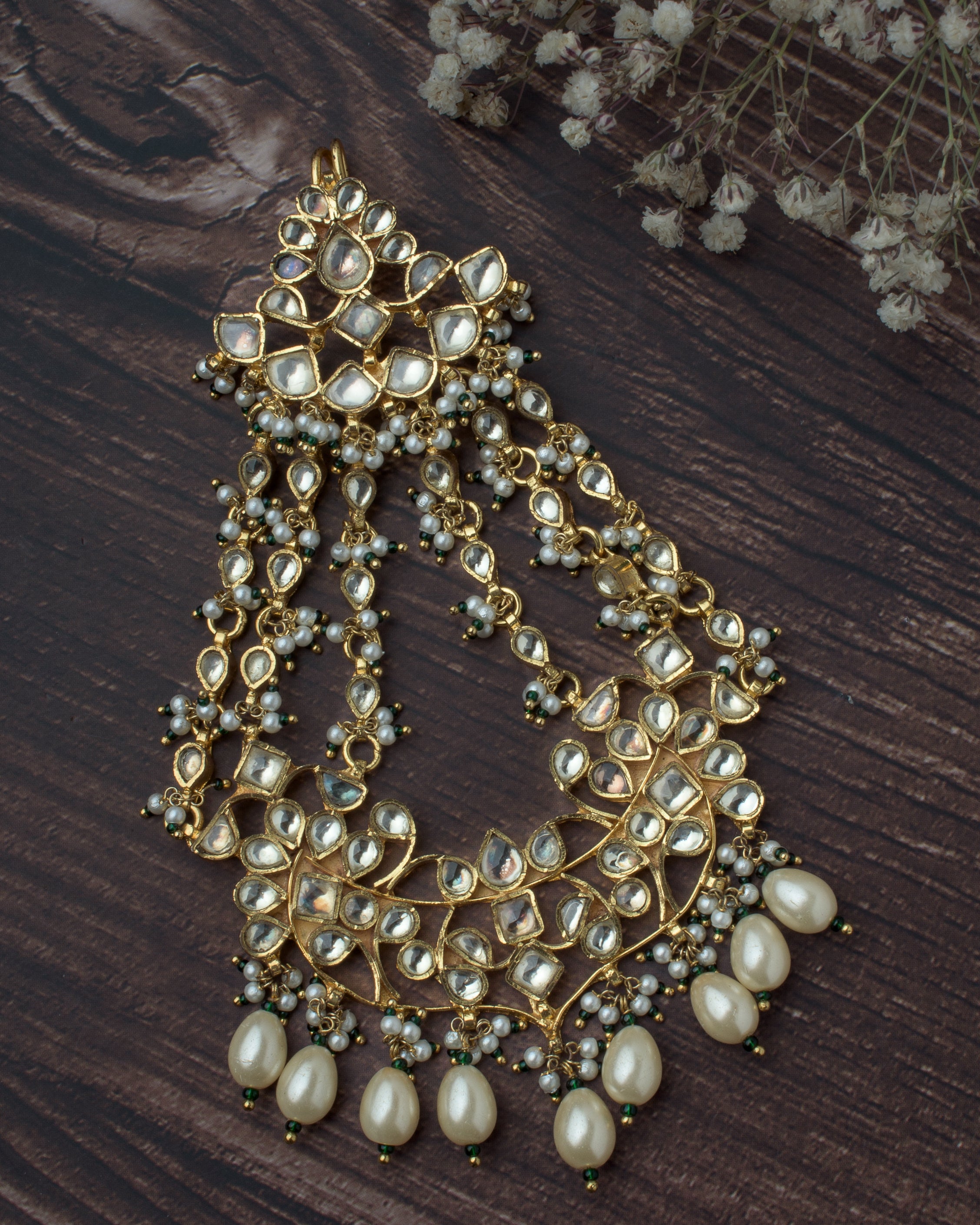 Make a statement with this exquisite kundan paasa, featuring teardrop and floral motifs adorned with pearl clusters and elegant hanging beads. Perfect to complete your royal bridal or festive look.