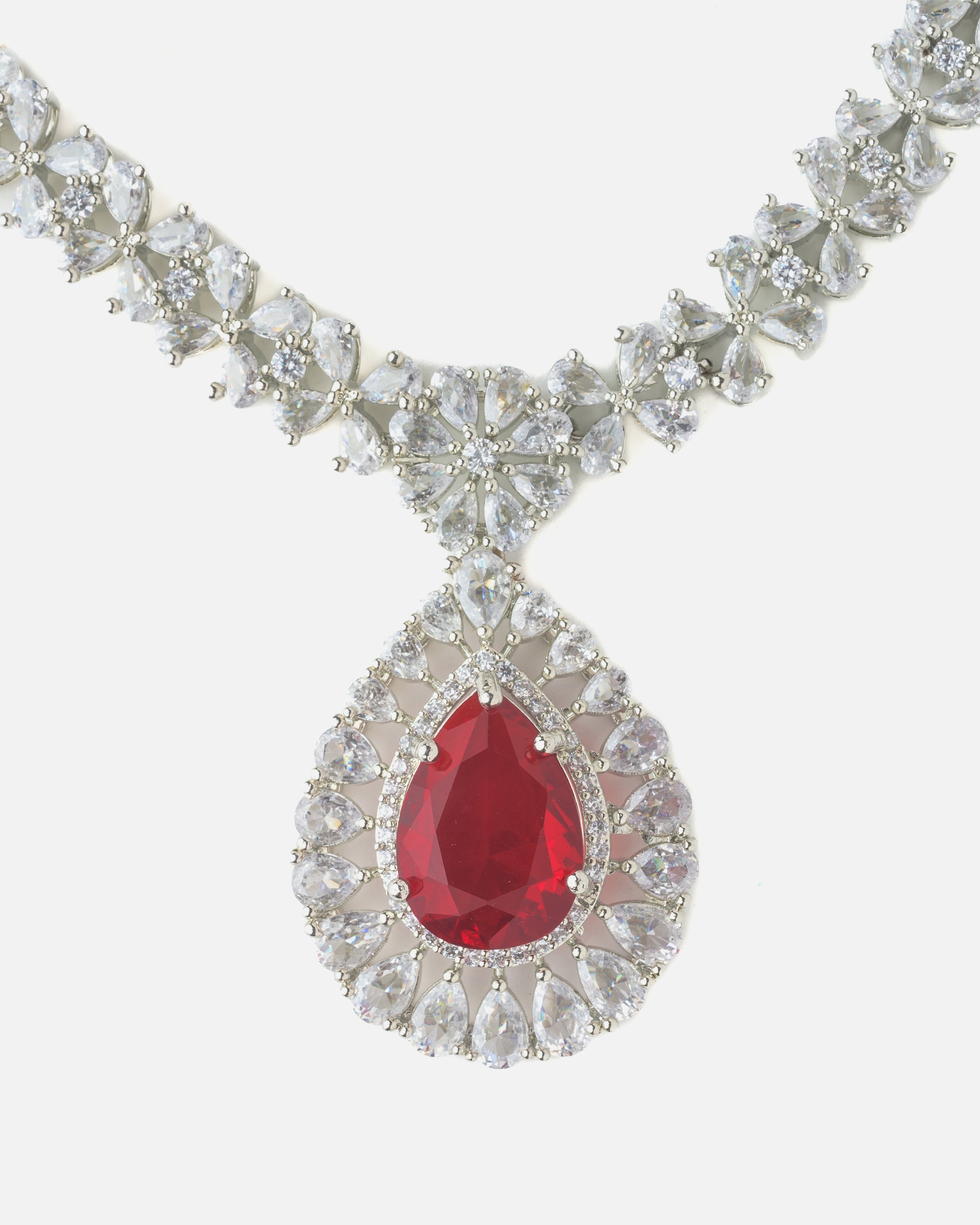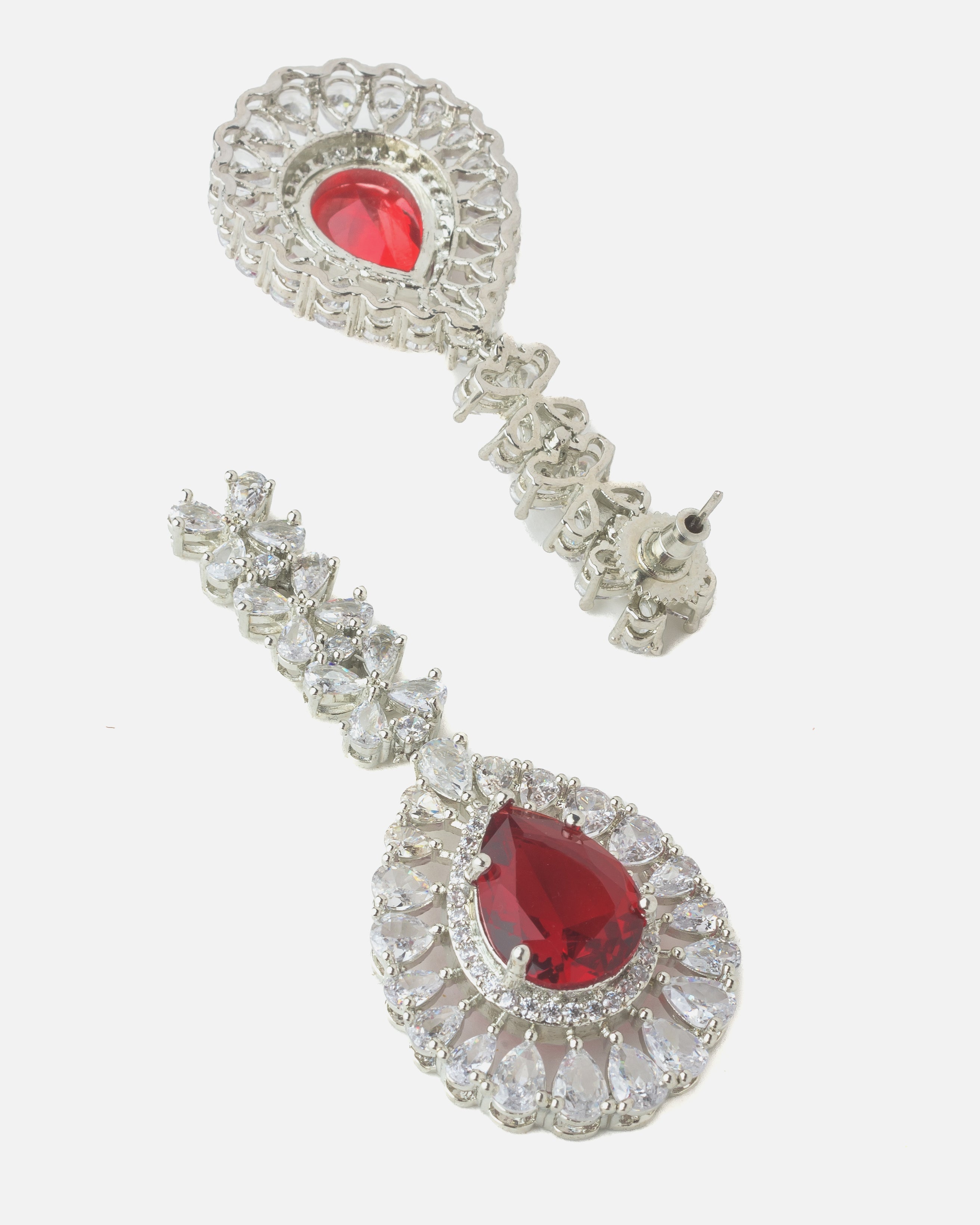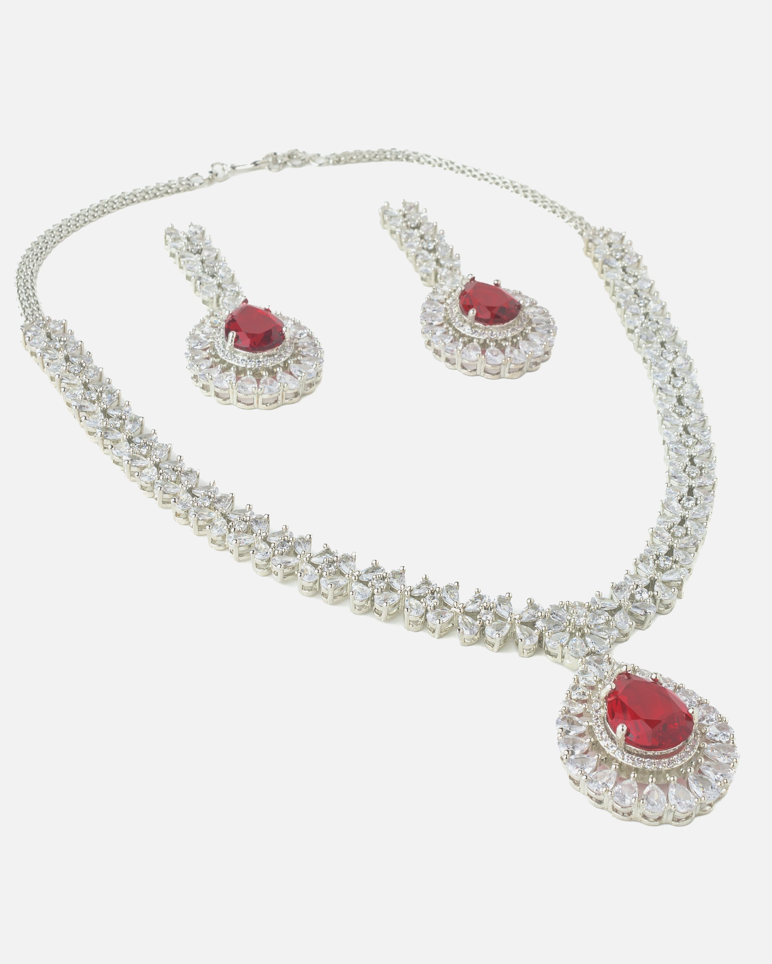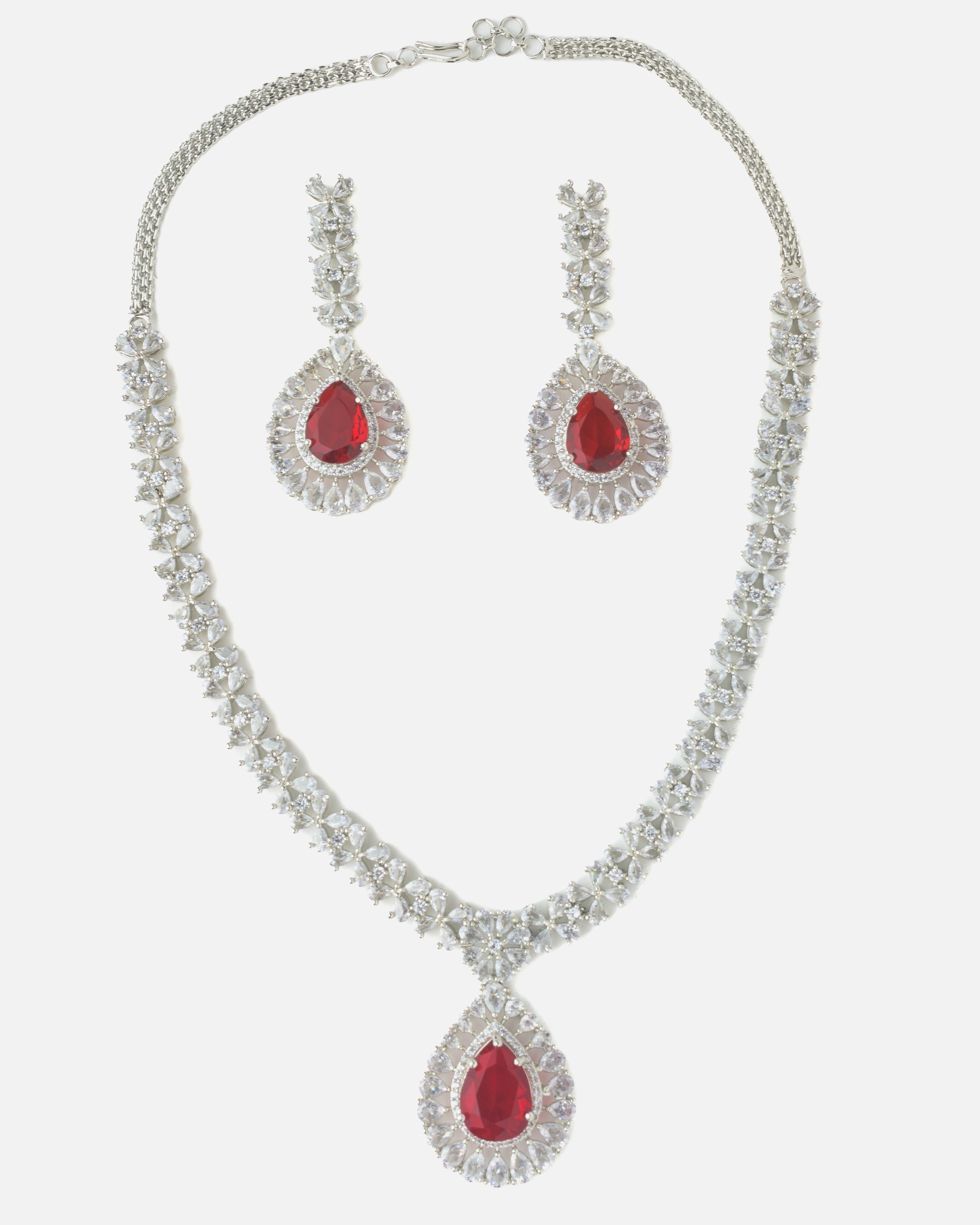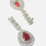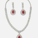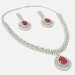 Rhodium Plated Zircon Studded With Red Synthetic Stone Pendant Necklace & Drop Earrings Set