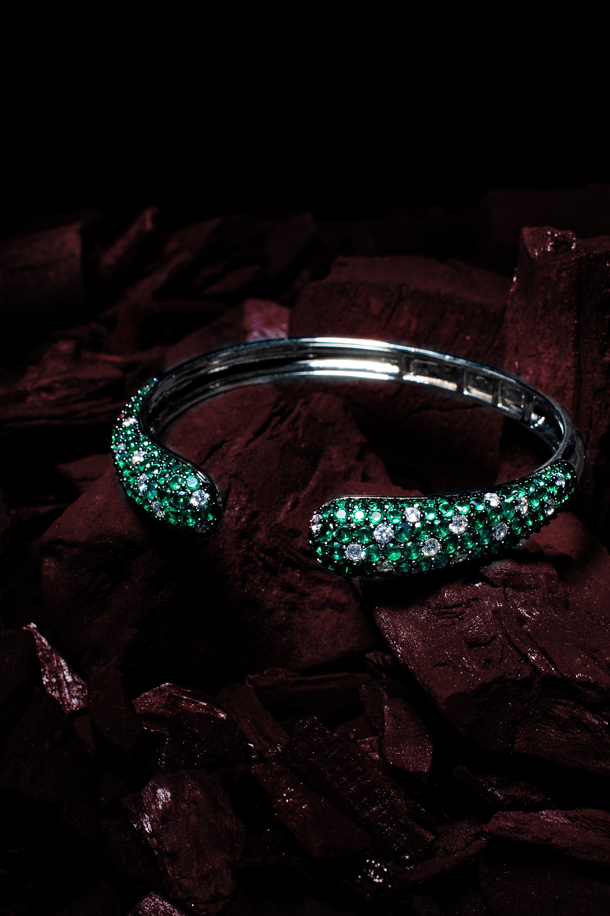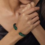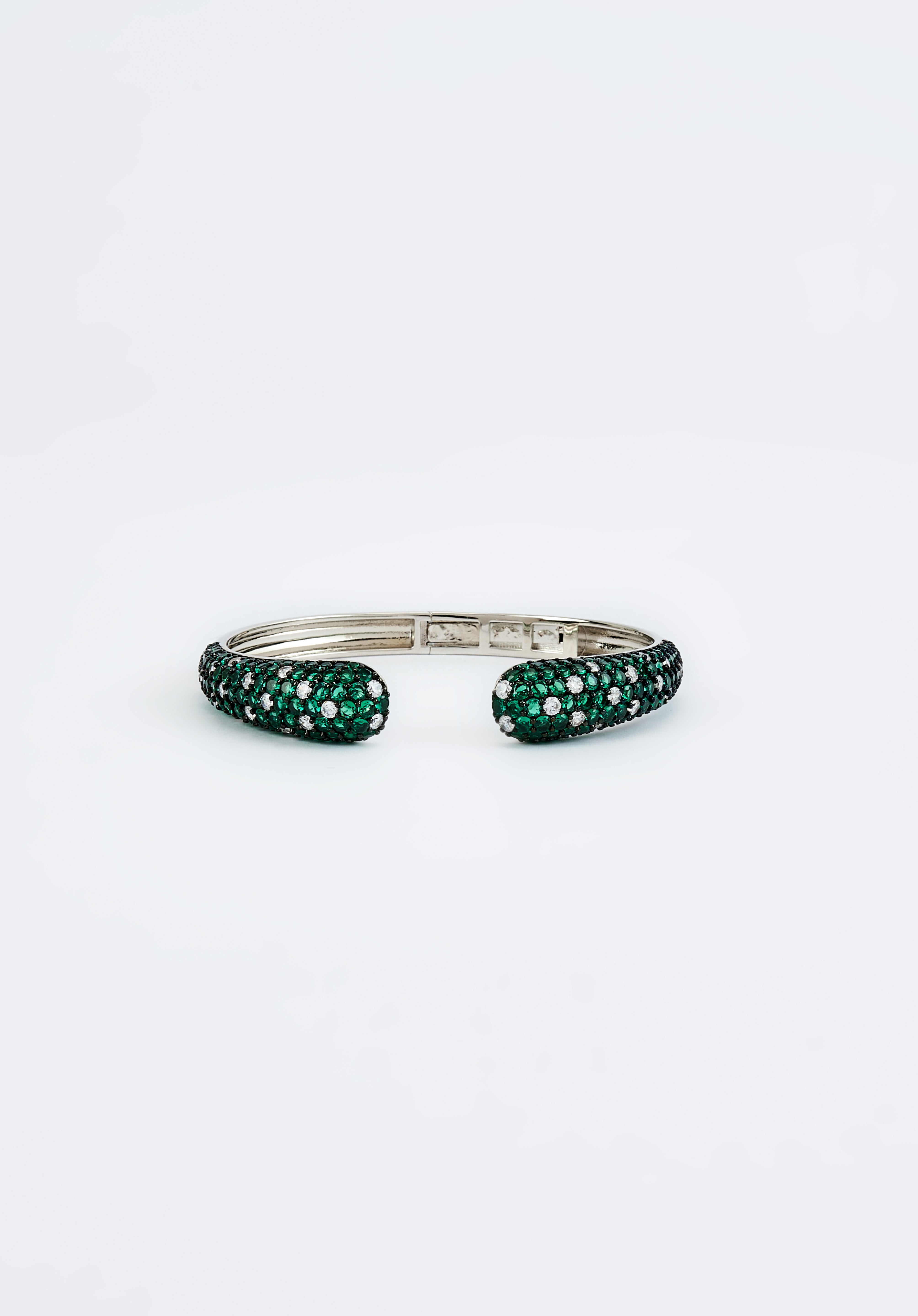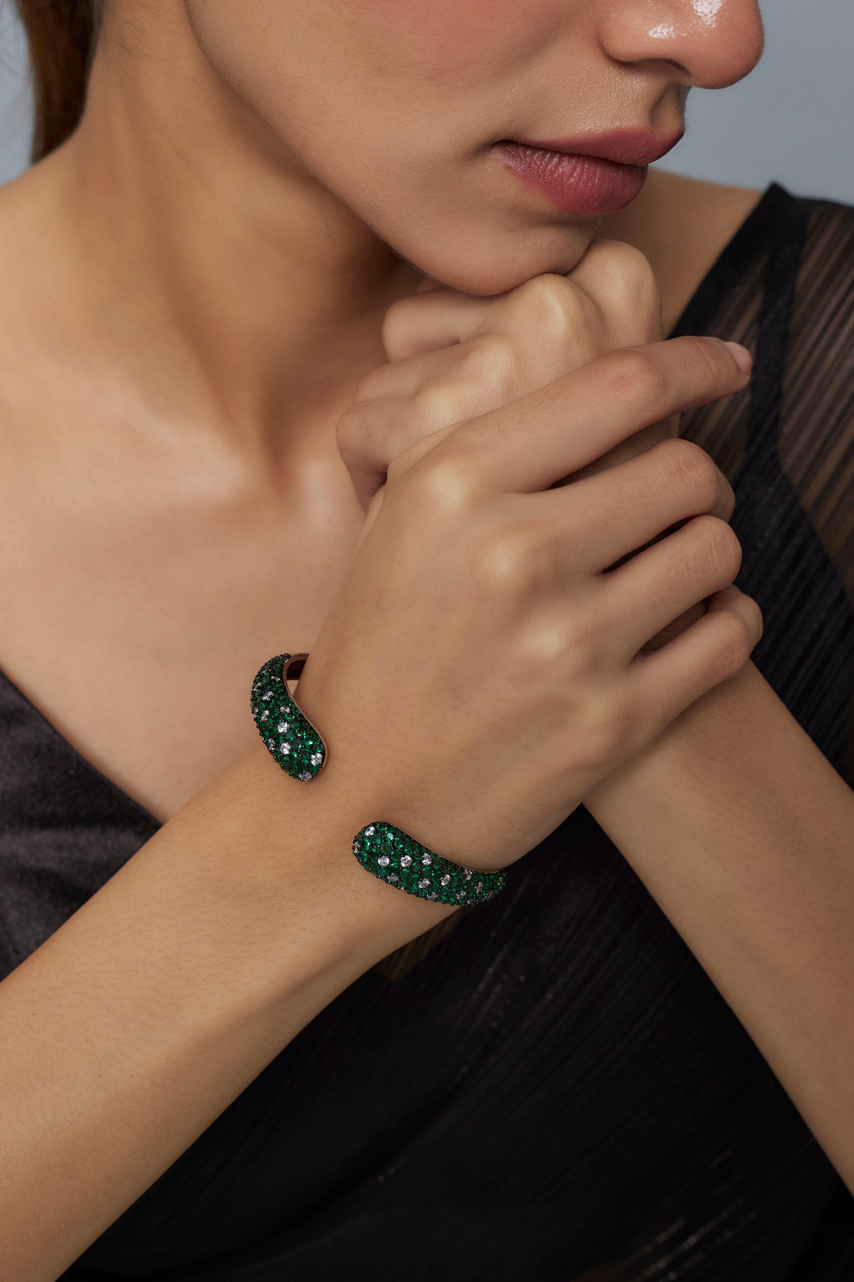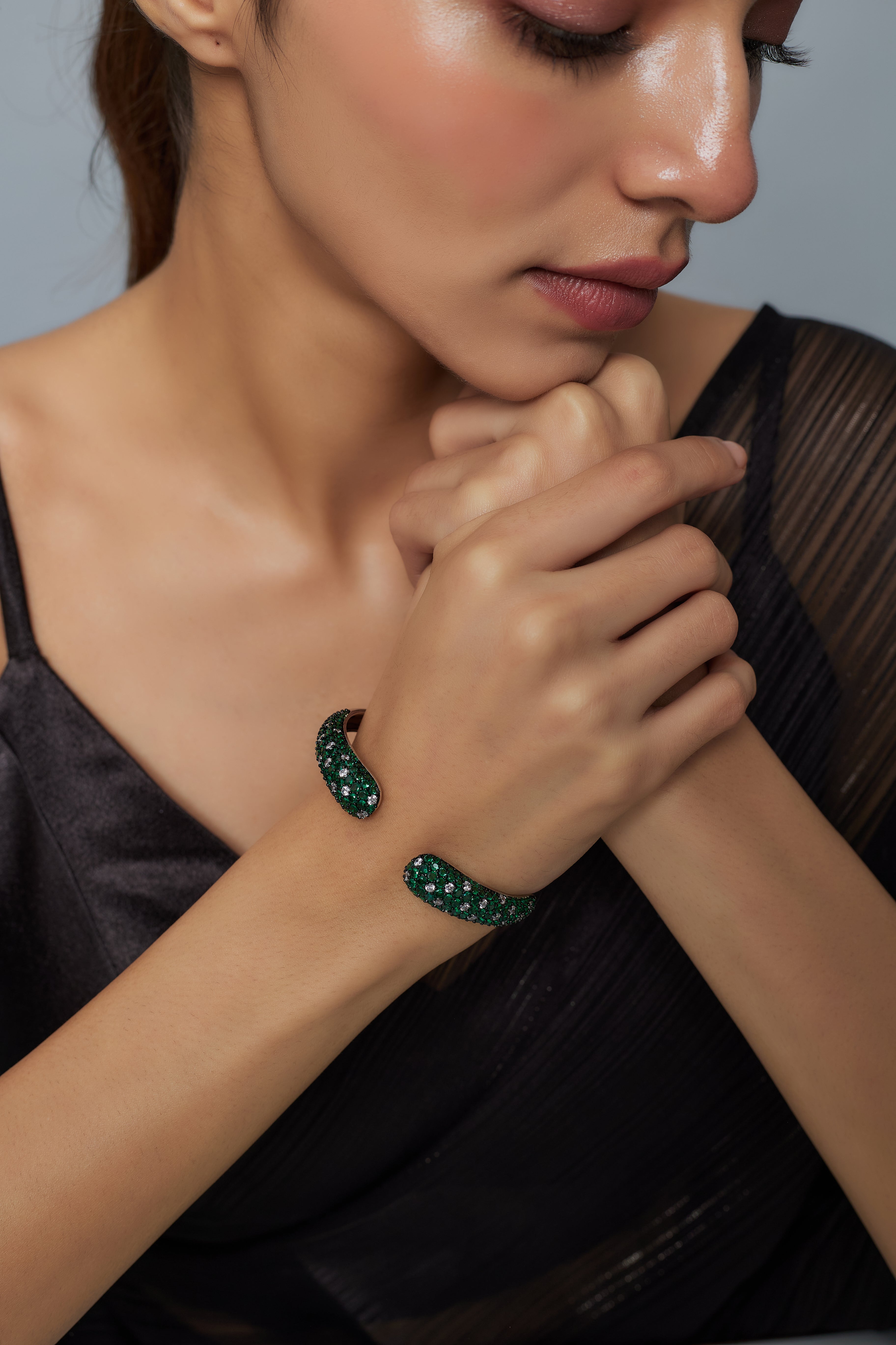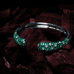 Graceful and bold, this stunning bracelet features emerald-green gemstones set in unique, open-ended cuff design. Perfectly crafted to complement evening attire,it radiates timeless elegance & charm.