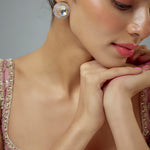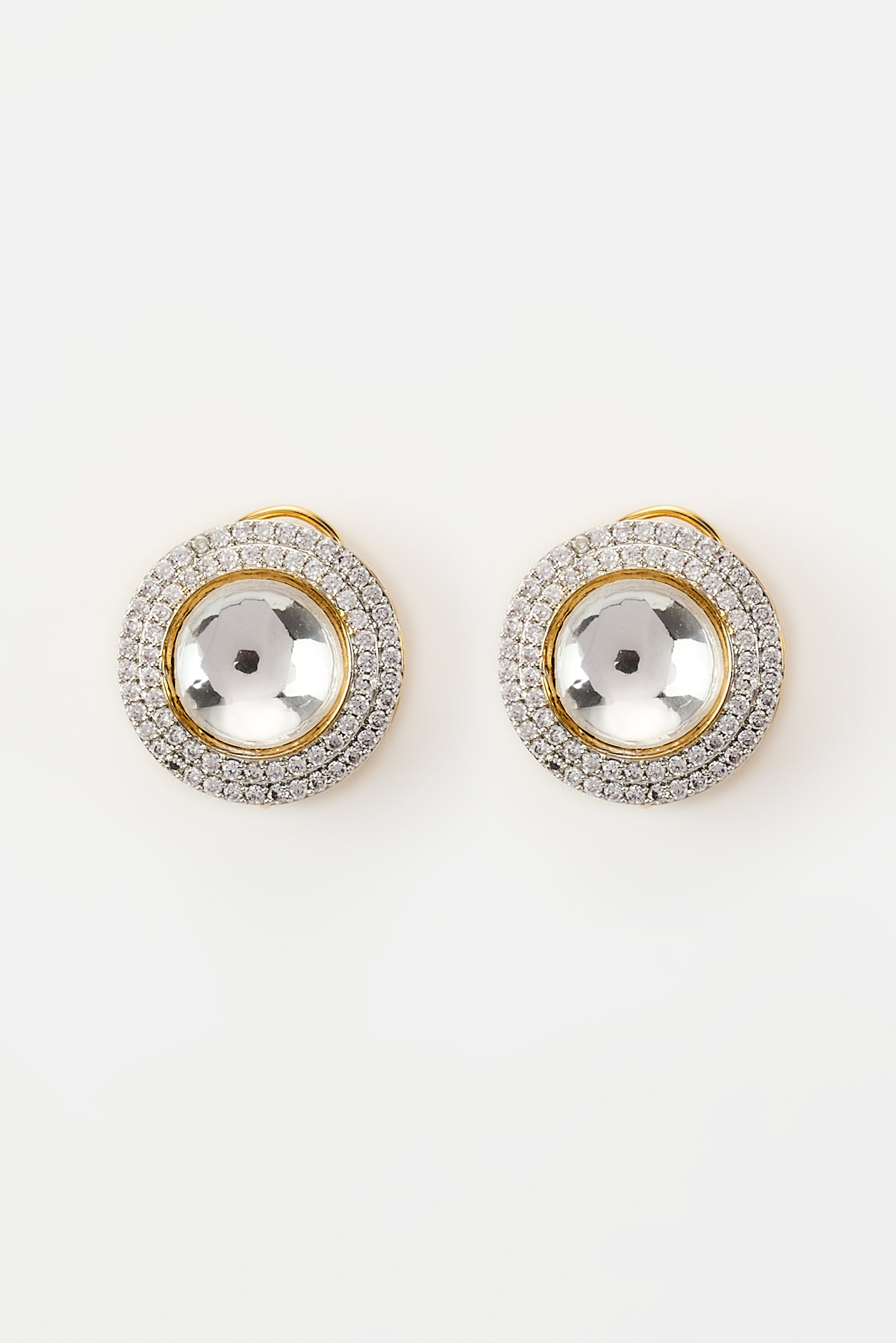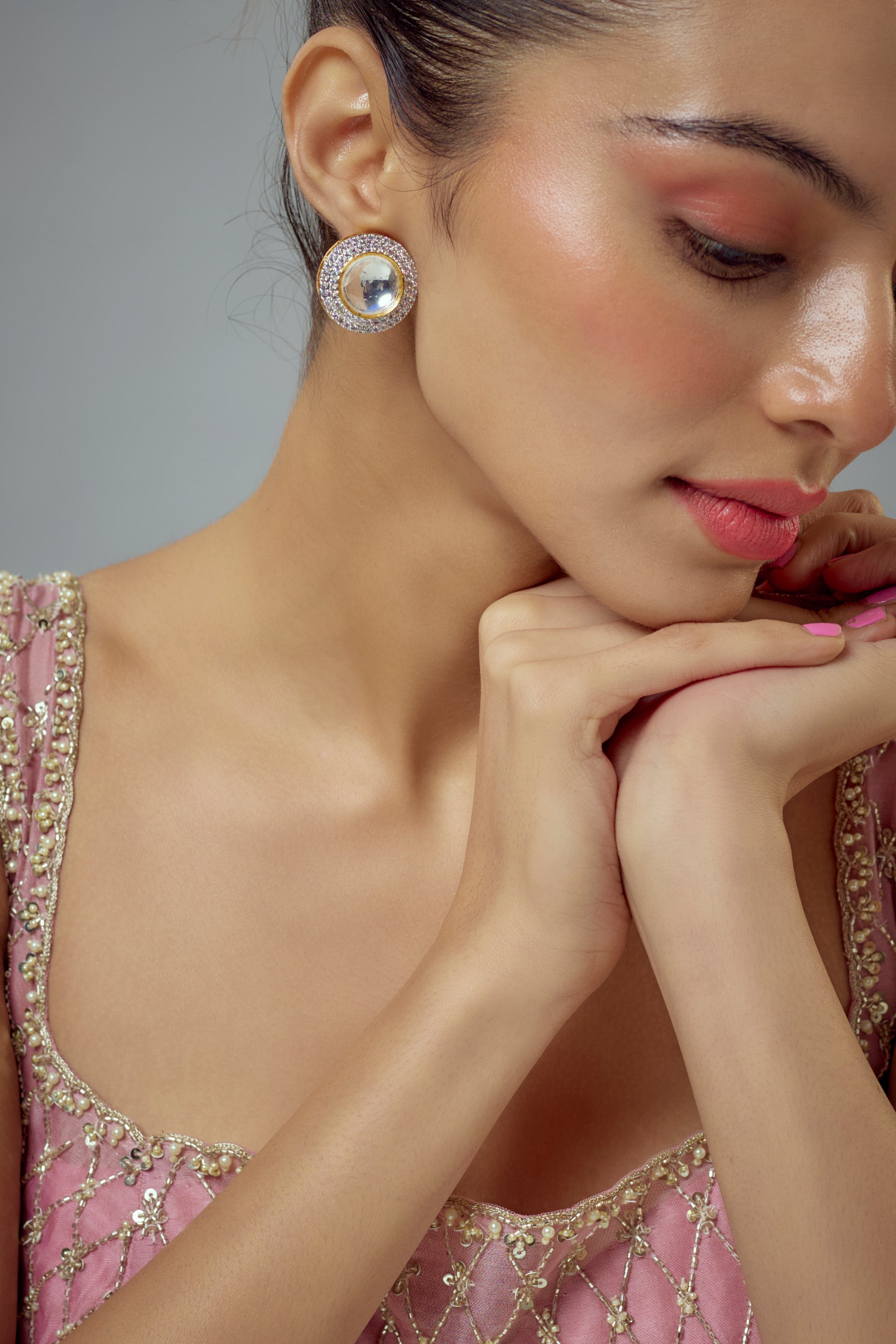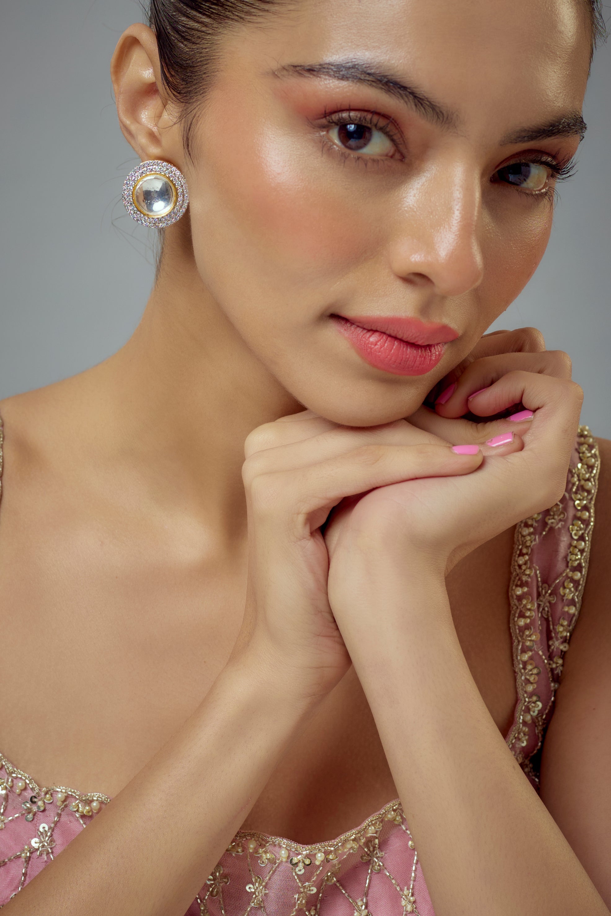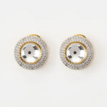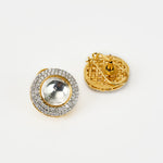 Pair of elegant stud earrings featuring dazzling mirror-polished centerpieces surrounded by intricate stone detailing. Perfect for adding a sophisticated sparkle to both traditional & modern outfits.