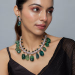 Elegant pearl and crystal necklace set with matching earrings. Features blue teardrop beads, pearl accents & intricate gold detailing. Perfect for parties or festive occasions. Lightweight and chic.